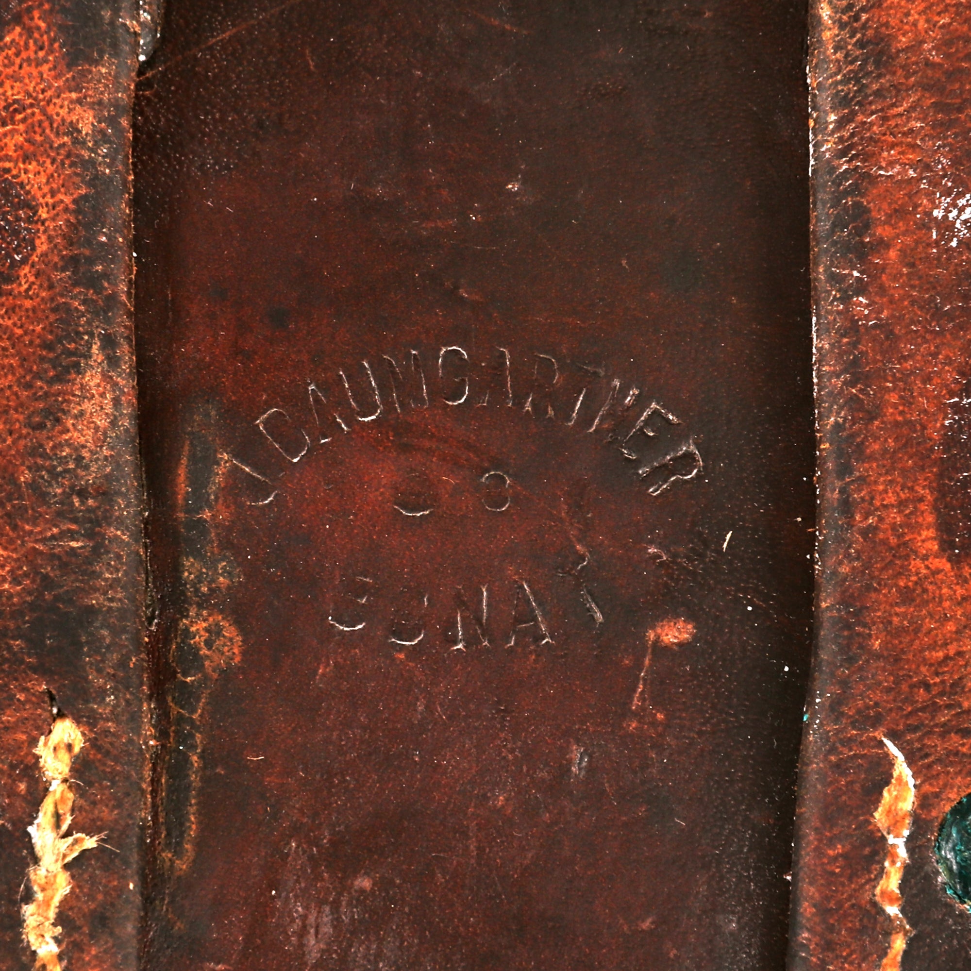 The stitching is mostly intact, with just a bit of popping in isolated areas, and it still retains the original white color well in areas. The securing strap is still intact, with no tearing. The leather shoulder strap is still present, as is the belt loop on the reverse side. The loops is a little stiff but the shoulder strap is still mostly solid and does appear to still be able to be adjusted.