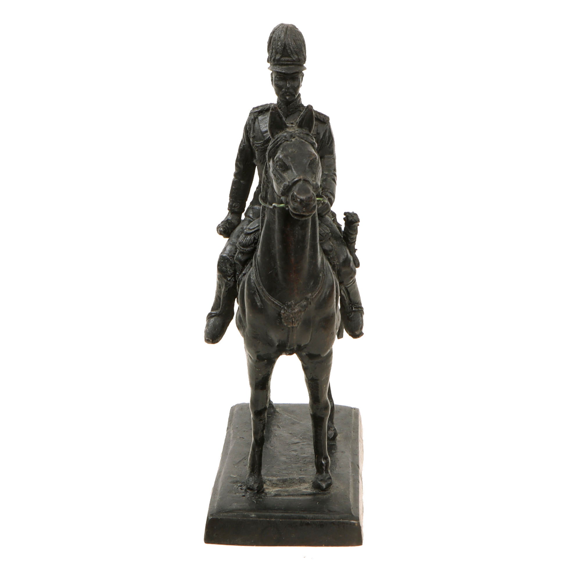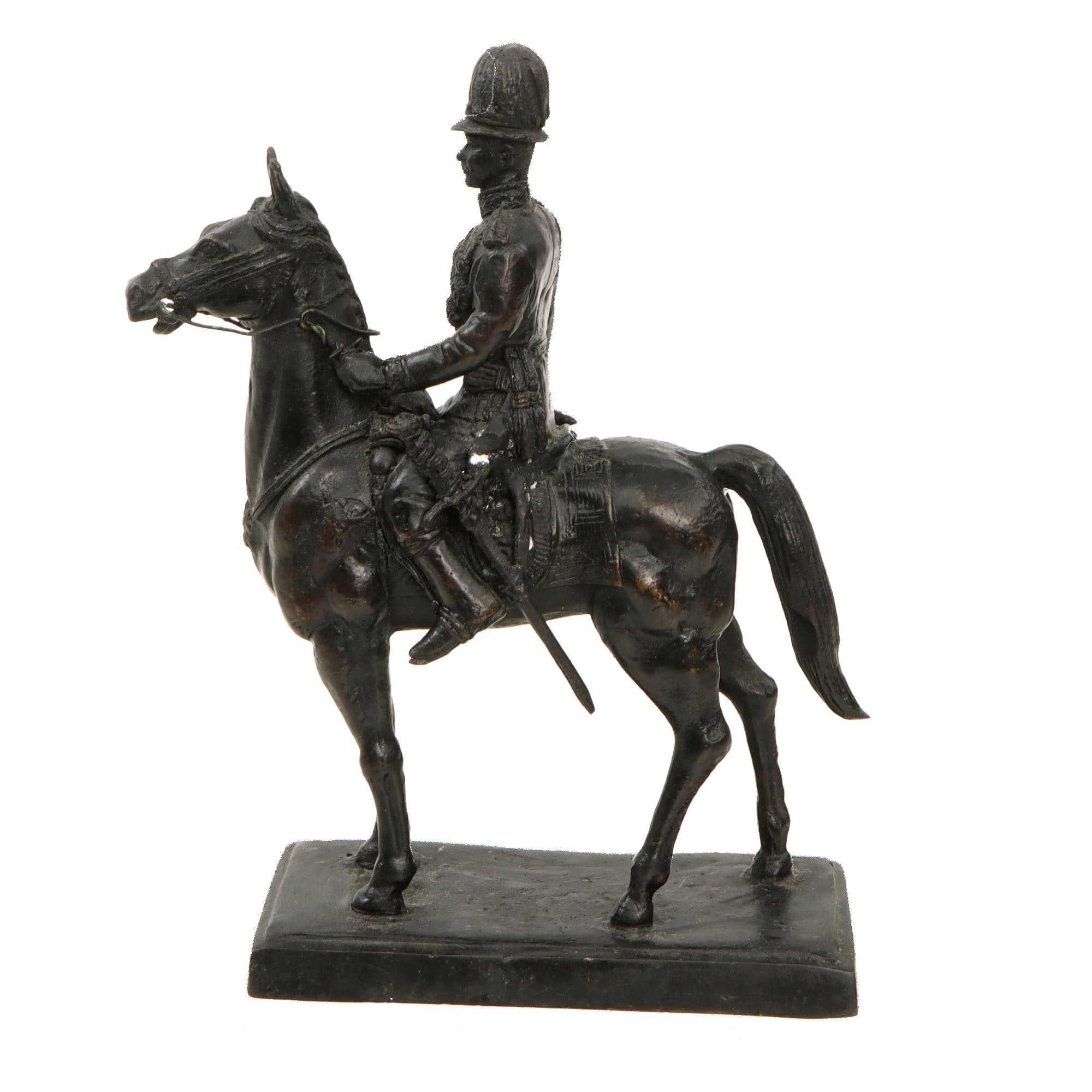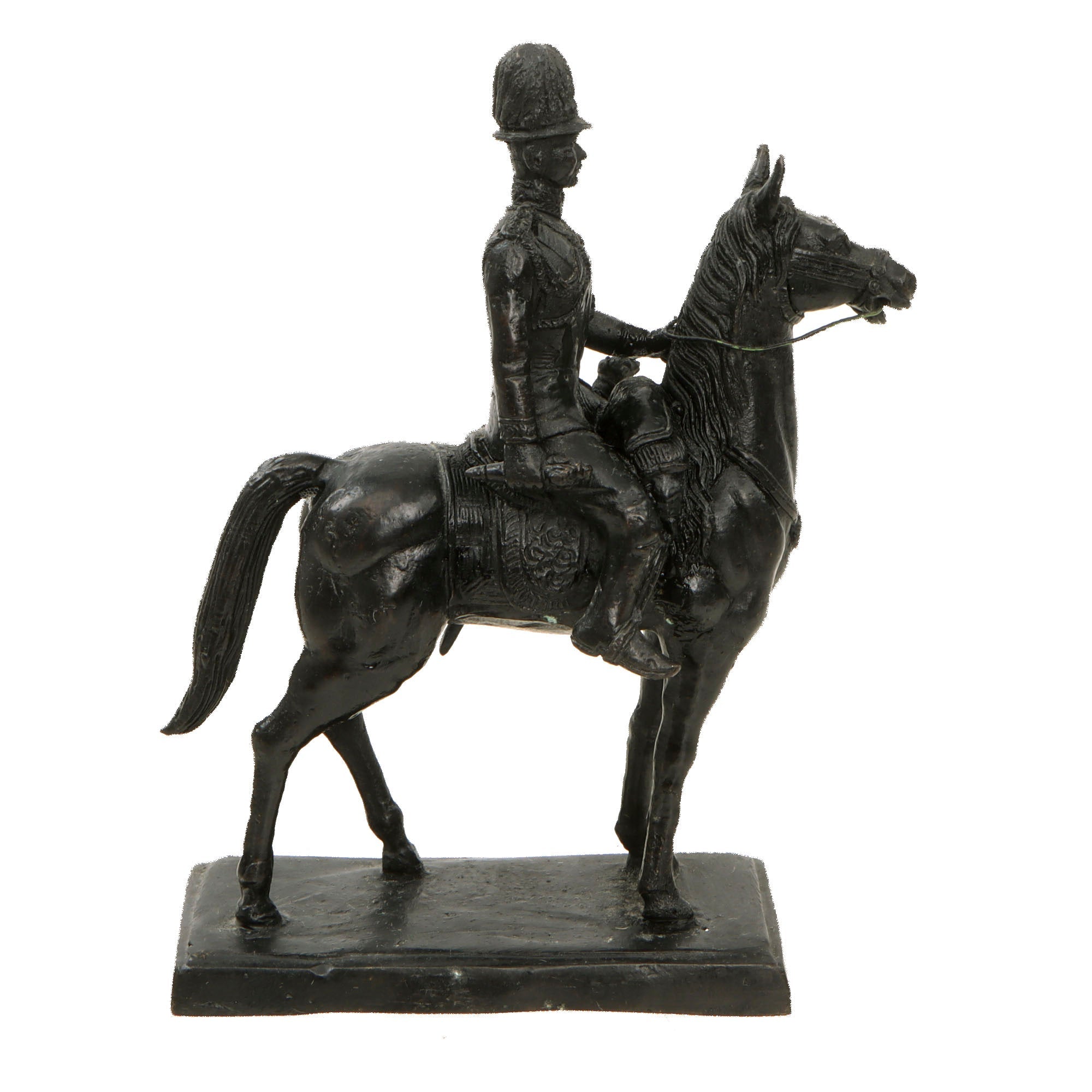 This is an outstanding bronze equestrian statue of King Chulalongkorn measuring 8” tall with a base measuring 2 ½ x 5”. It has some heavy wear and minor damage to his sword and horse’s reins, but it has held up very well considering its age. There are some very small holes in the base as shown.