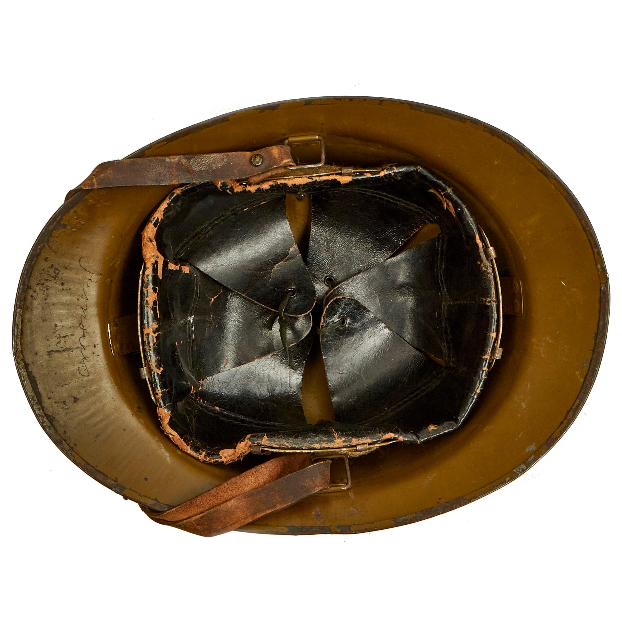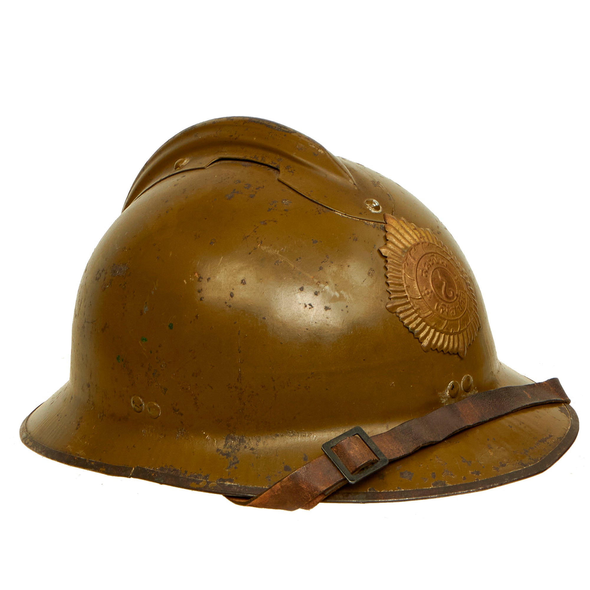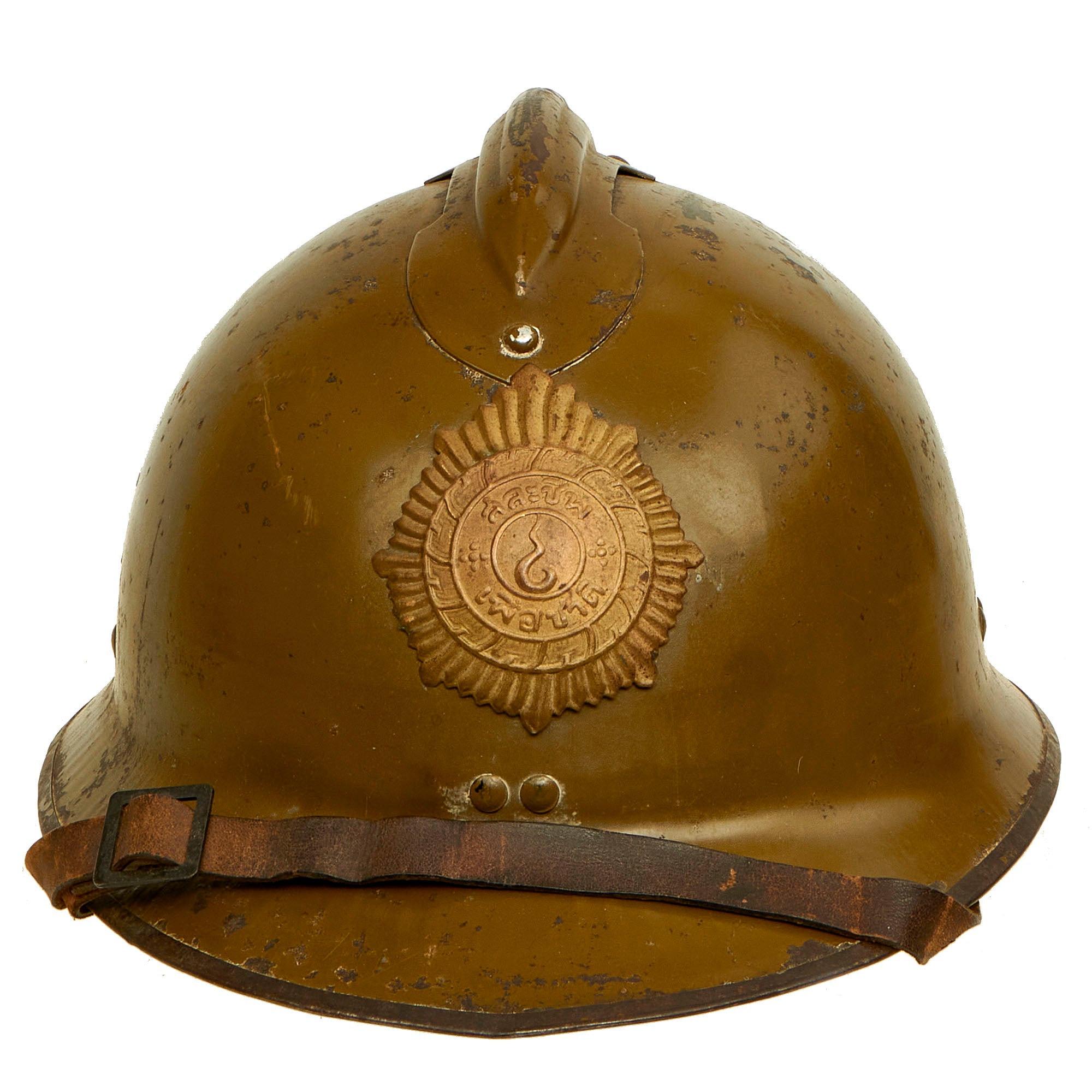 This is a nice example of a genuine World War II M-1926 French made "Adrian" steel helmet, which looks to have seen long service. During WWII Thailand held some of the largest Japanese Military bases. If you were a nation occupied by the Japanese in WWII you find yourself awash in Japanese military materiel upon their surrender. Suddenly your army (such as it is) has lots of helmets, but the helmets were discarded and exchanged for the much favored Adrian helmet. During WW2 these helmets were re-issued to the Thai army as one of the standard helmets with a "Chakra" badge (Inscription in Thai : "Sacrifice for fatherland"). The helmet shows signs of being repainted several times, which was not uncommon to see a few coats of paint on a helmet in the French Army, especially a helmet that saw WWII usage as well as post war. The original paint is almost entirely present and the liner is present with a leather chinstrap, both in wonderful condition.