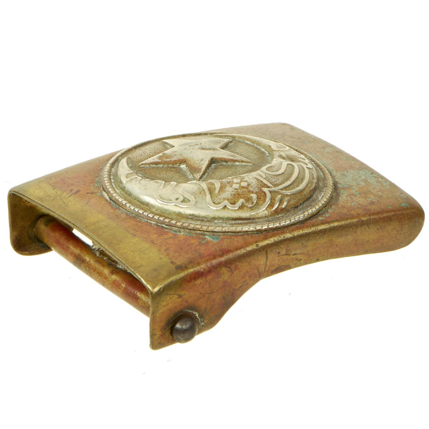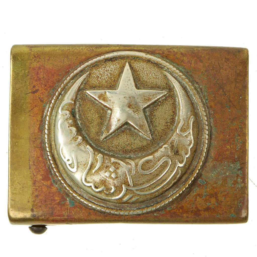 This buckle features two-piece construction, with a slightly convex, stamped brass metal box buckle, with an attached Nickel Ottoman Empire insignia. This features a five pointed star over a crescent moon, which has Arabic writing on it. There is a simple rope border around the insignia. To the reverse is its raised buckle catch, and a metal prong bar with dual prongs, for the belt’s retaining tongue.