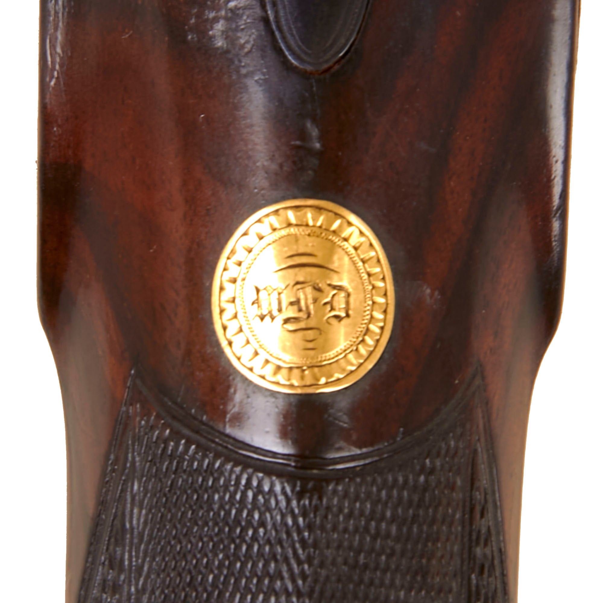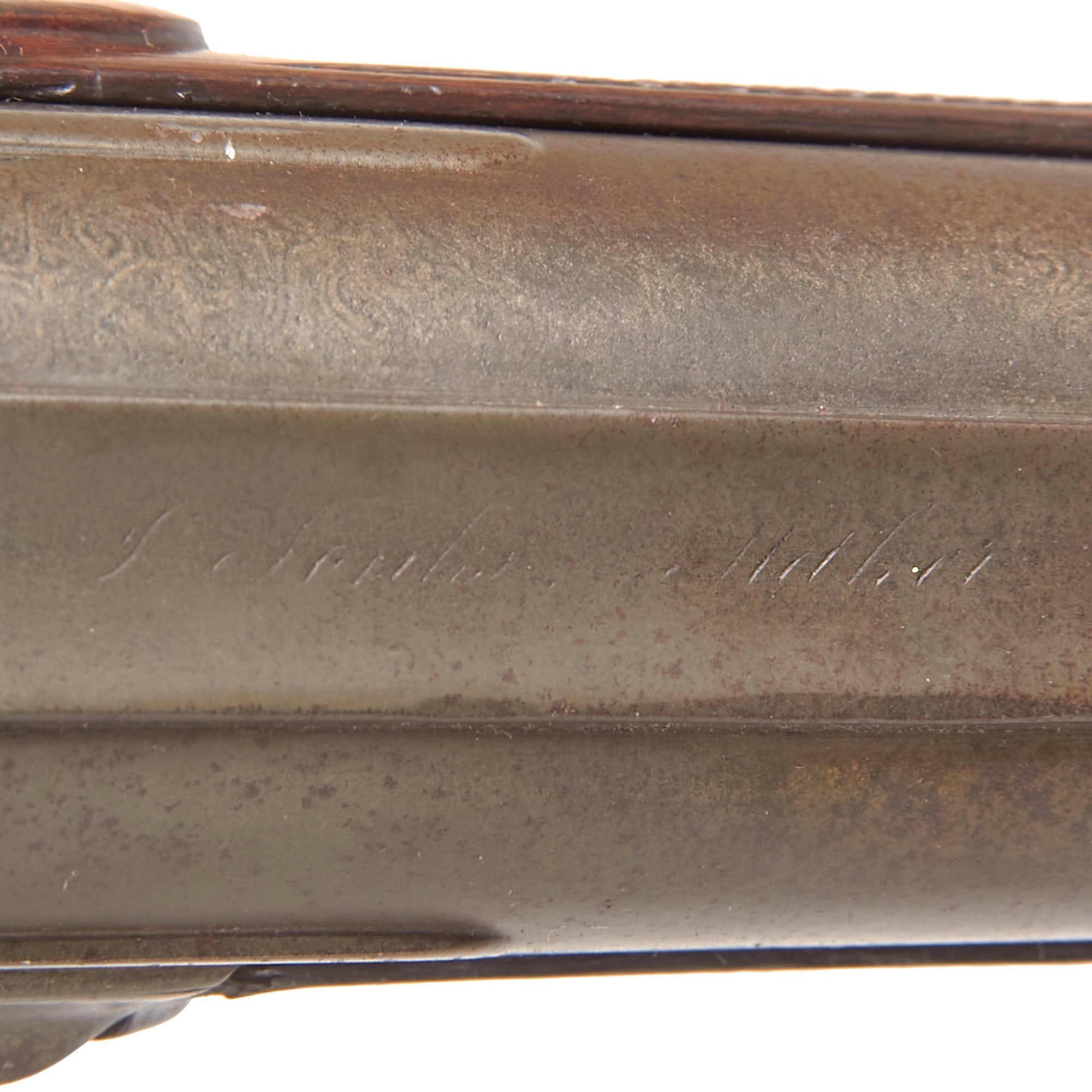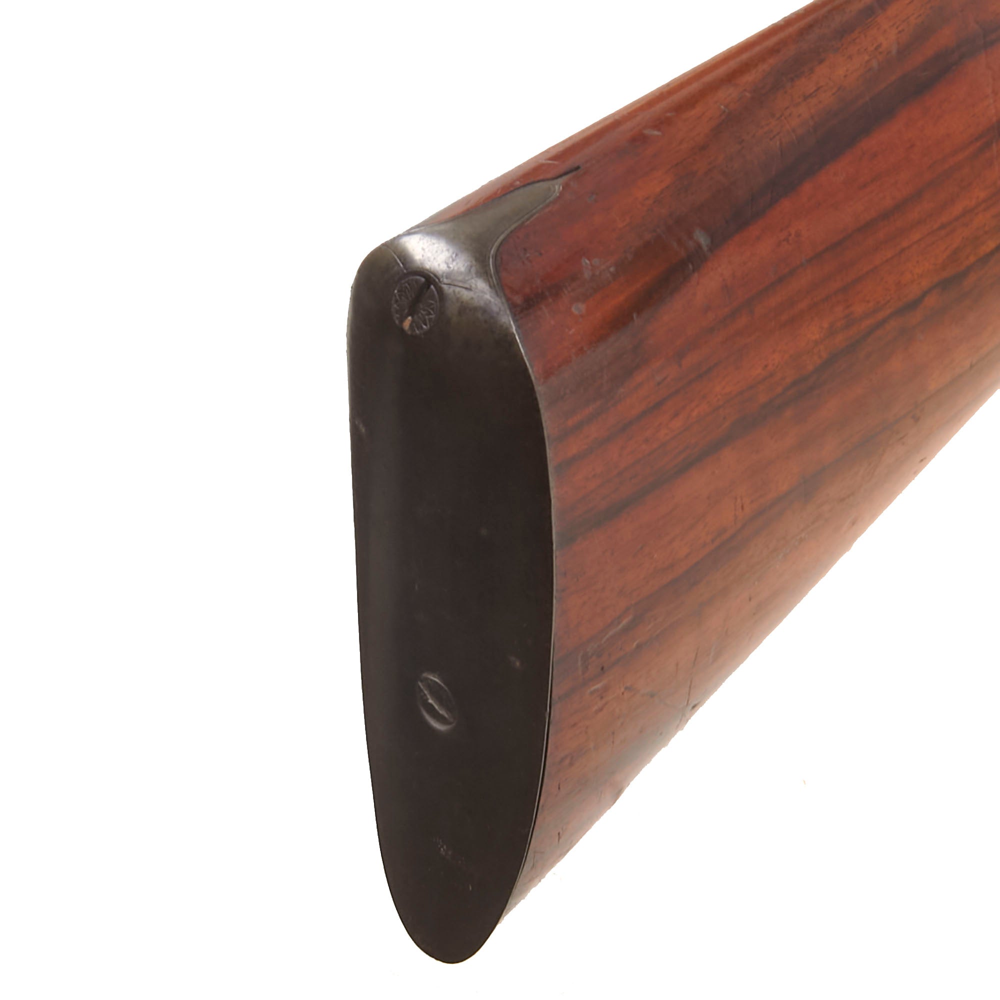 The walnut stock is in very good shape, looking to have been refinished when the rest of the gun was refurbished. The the wrist is checkered, which is still strongly present, and shows an extremely high level of craftsmanship. The fore stock is also checkered, and still retains the texture well, however there is also a repaired crack on the right side, and a wood graft repair on the left. We noted that there is a brass escutcheon on the wrist with some initials, which looks to have been added later.