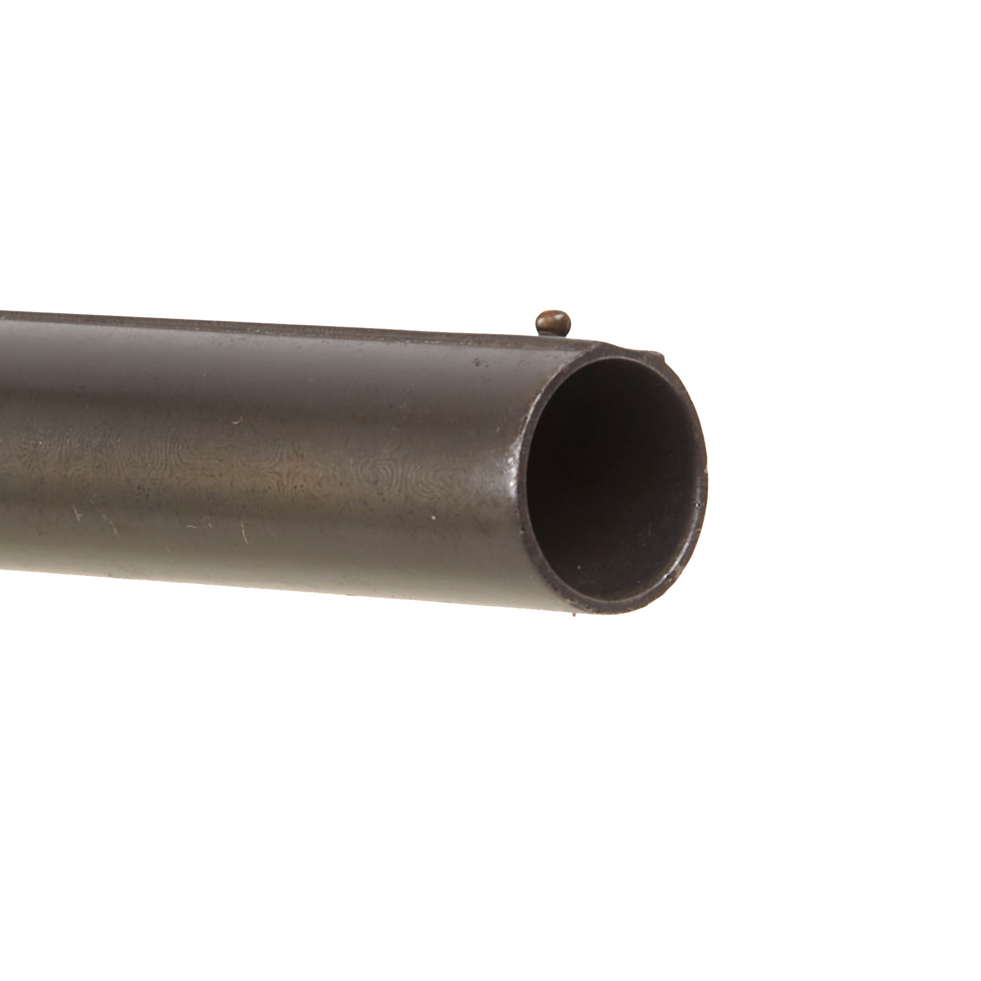 Pulling out the barrel wedges allowed us to remove the barrel, and the bottom is marked with a 10, indicating the size of "10 Bore", or approximately 0.775". It also is marked with the CROWN / CROSSED SCEPTERS / BPC proof and CROWN / CROSSED SCEPTERS / V viewed marks from the English city of Birmingham, with another "Viewed" mark on the breech plug. These are the correct markings for pre-1853 manufacture.