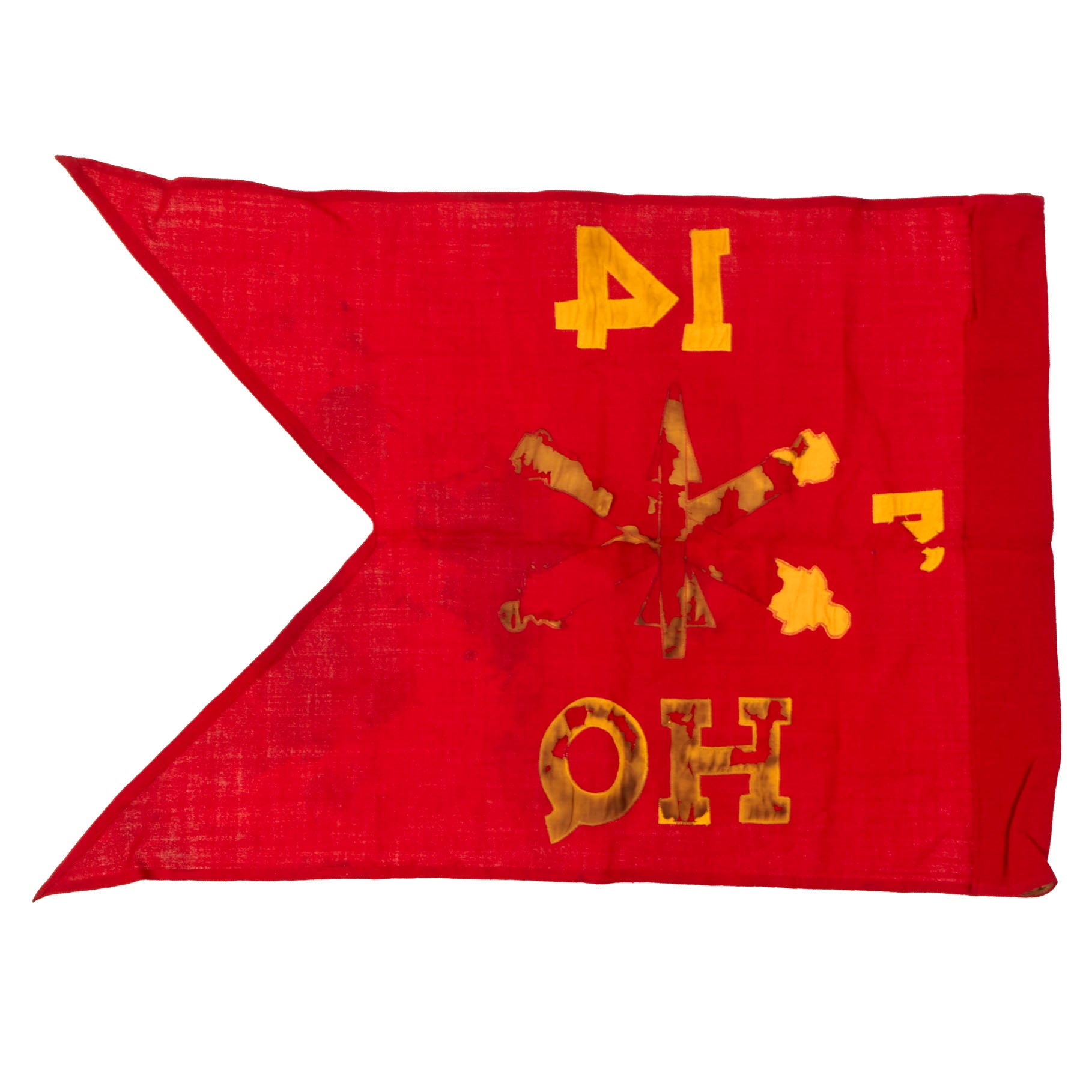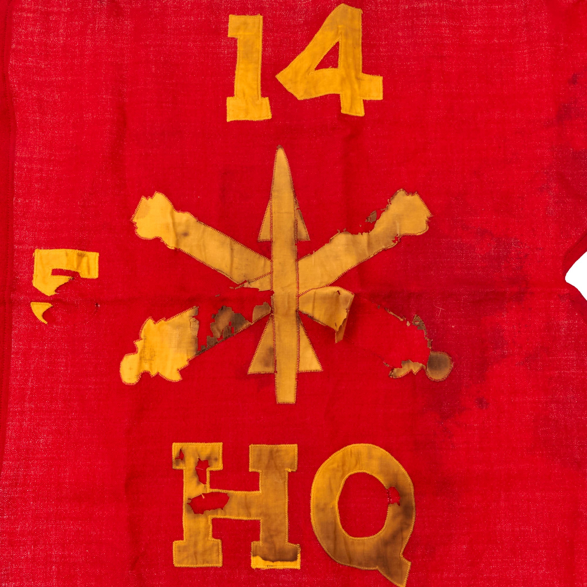 This is a lovely swallowtail guidon for the Headquarters of the 5th Battalion, 14th Air Defense Artillery. We haven’t been able to find much on this unit’s history, making for a great research project. The guidon is at full length, but the insignia, numbers, and letters have very heavy damage and loss of material on both sides. One side displays better than the other, but the damage is extensive. The Air Defense Artillery has a very interesting insignia, with what appears to be a Sidewinder Missile over the normal Field Artillery cannons.