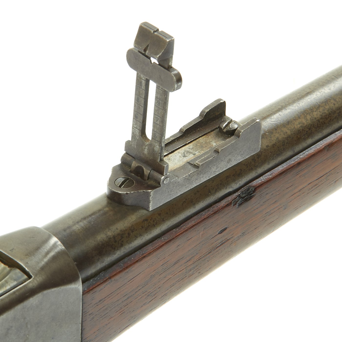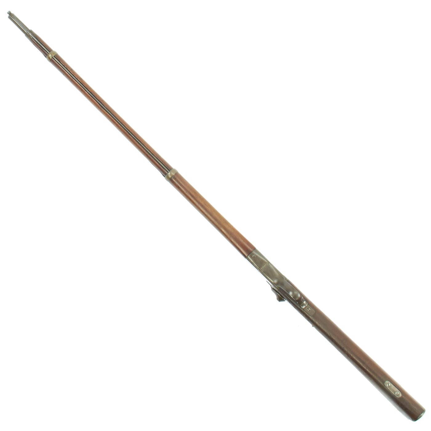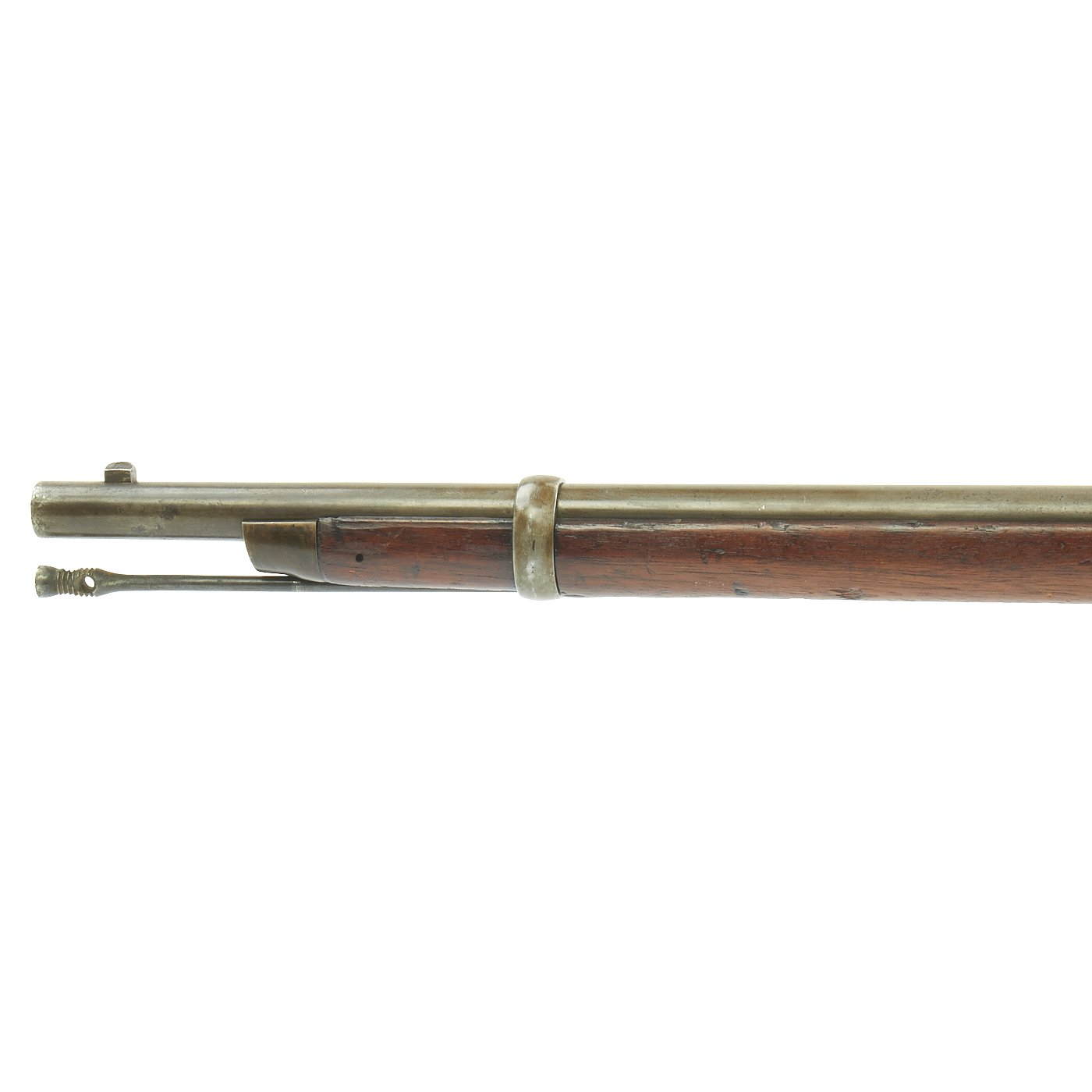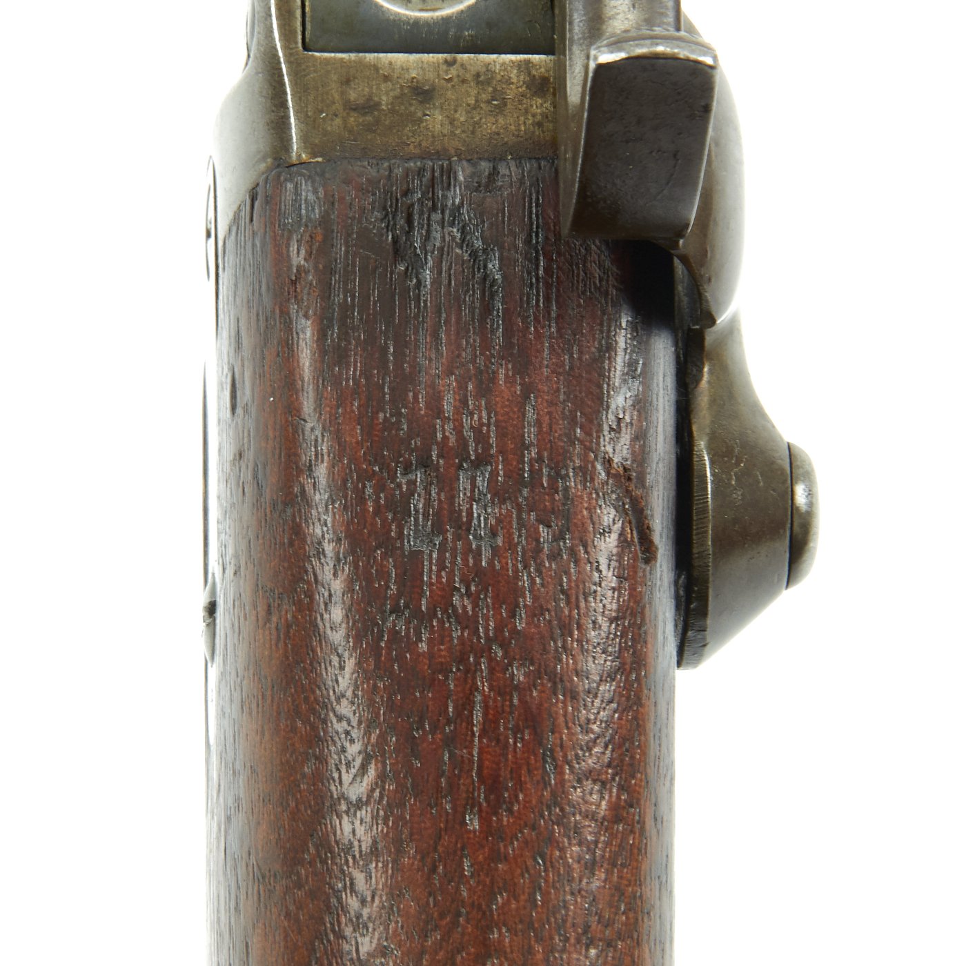 This gun is in very good condition, especially considering that it is close to 150 years in age. The wood stock has the lovely brown red color of aged walnut, though it does have some dents and wear, as expected on an old service rifle. The metalwork has a lovely gray patina, with few spots of peppering.