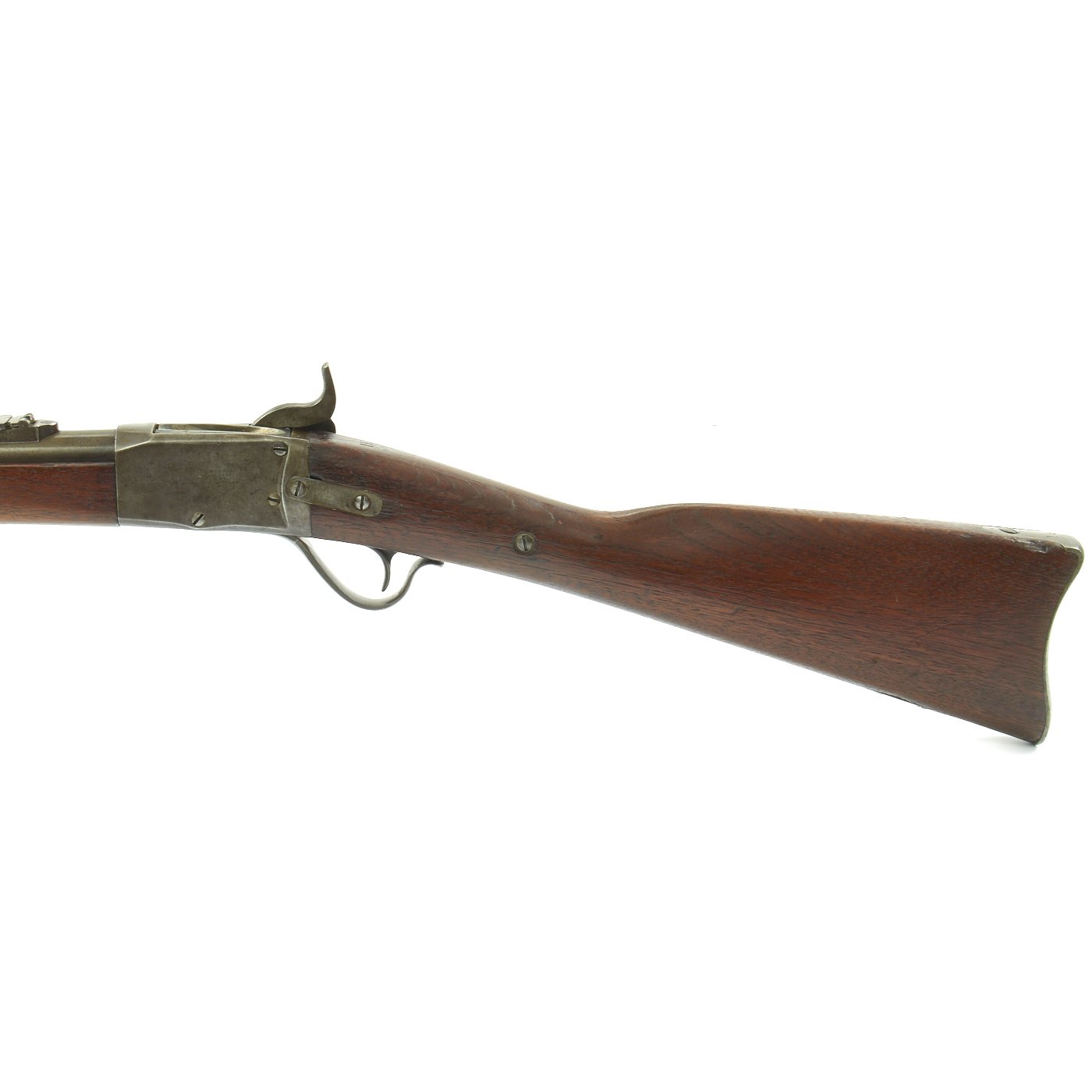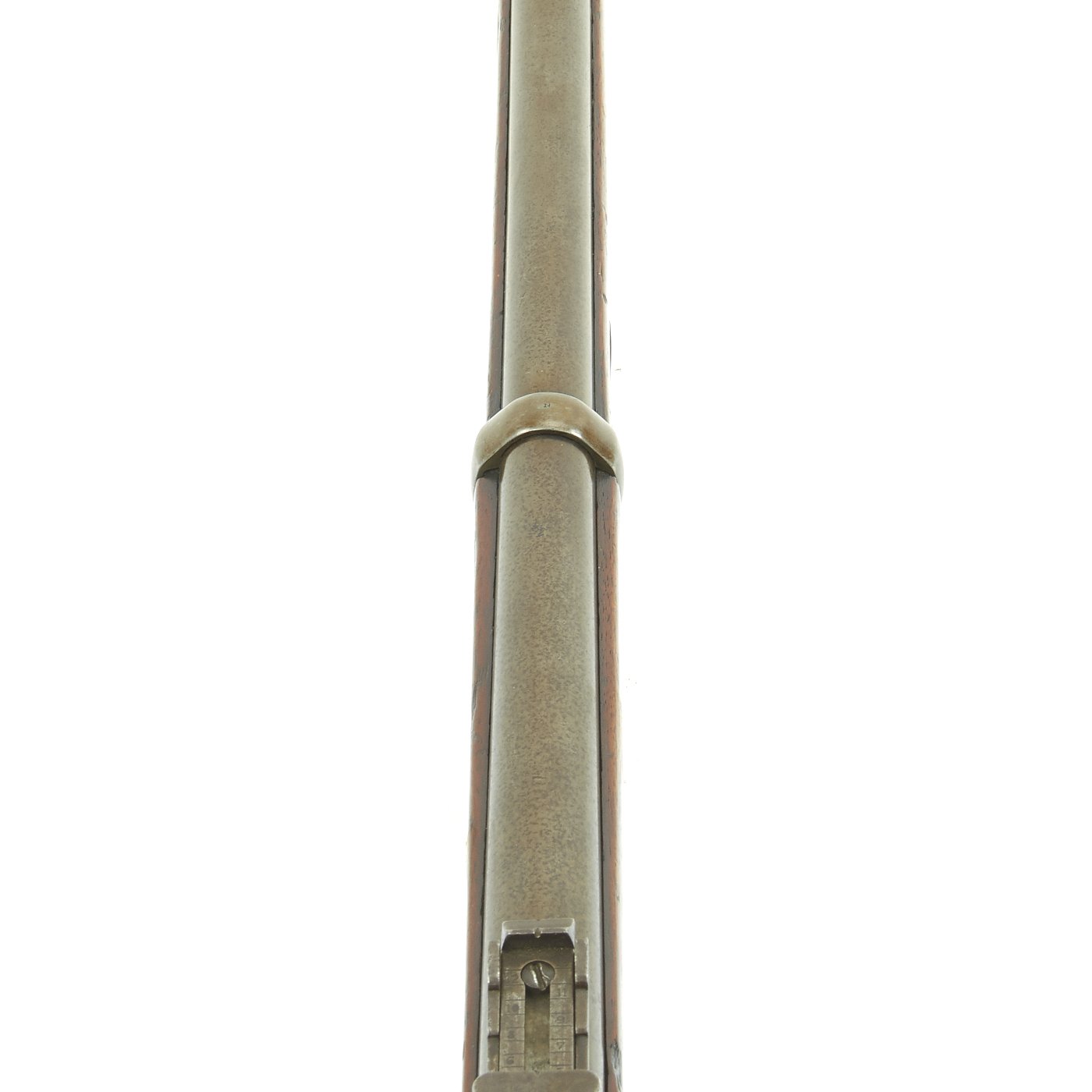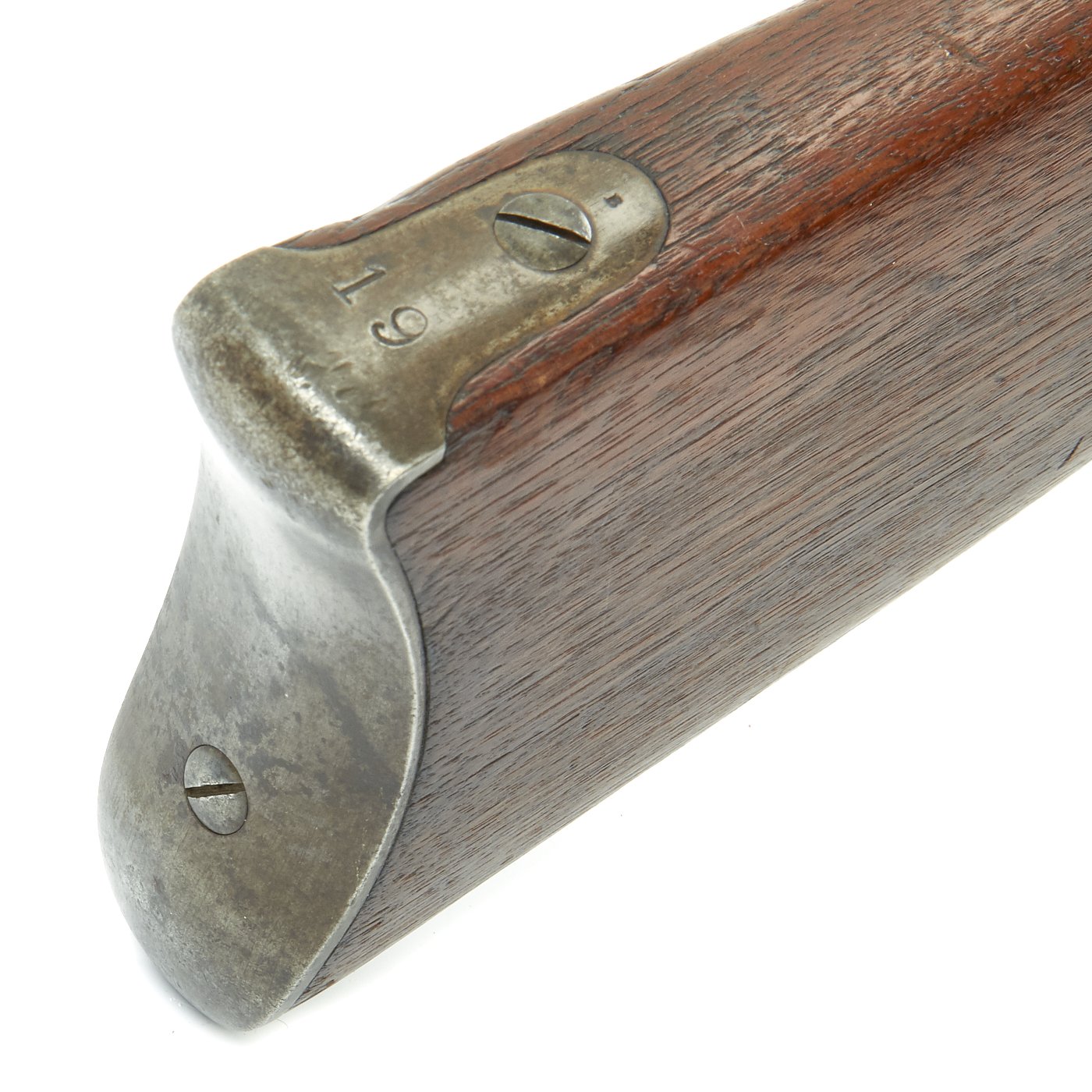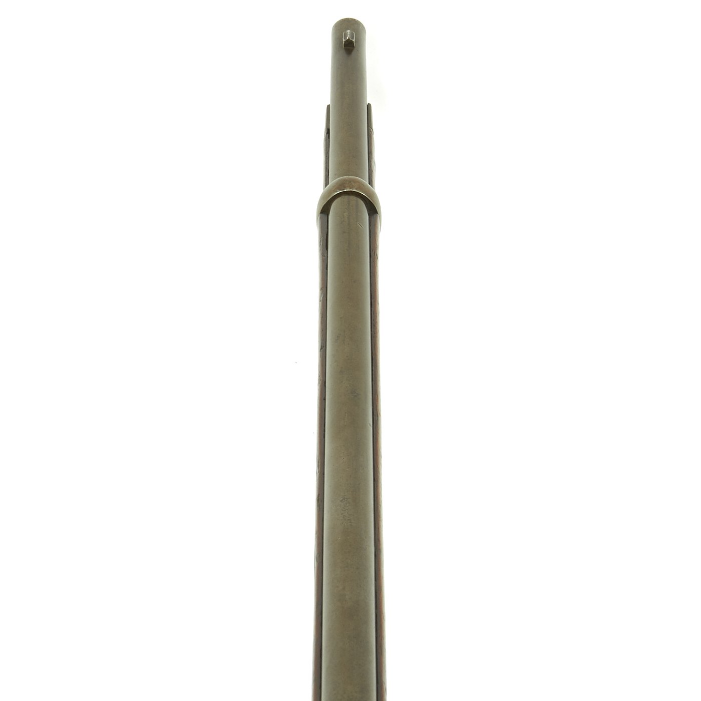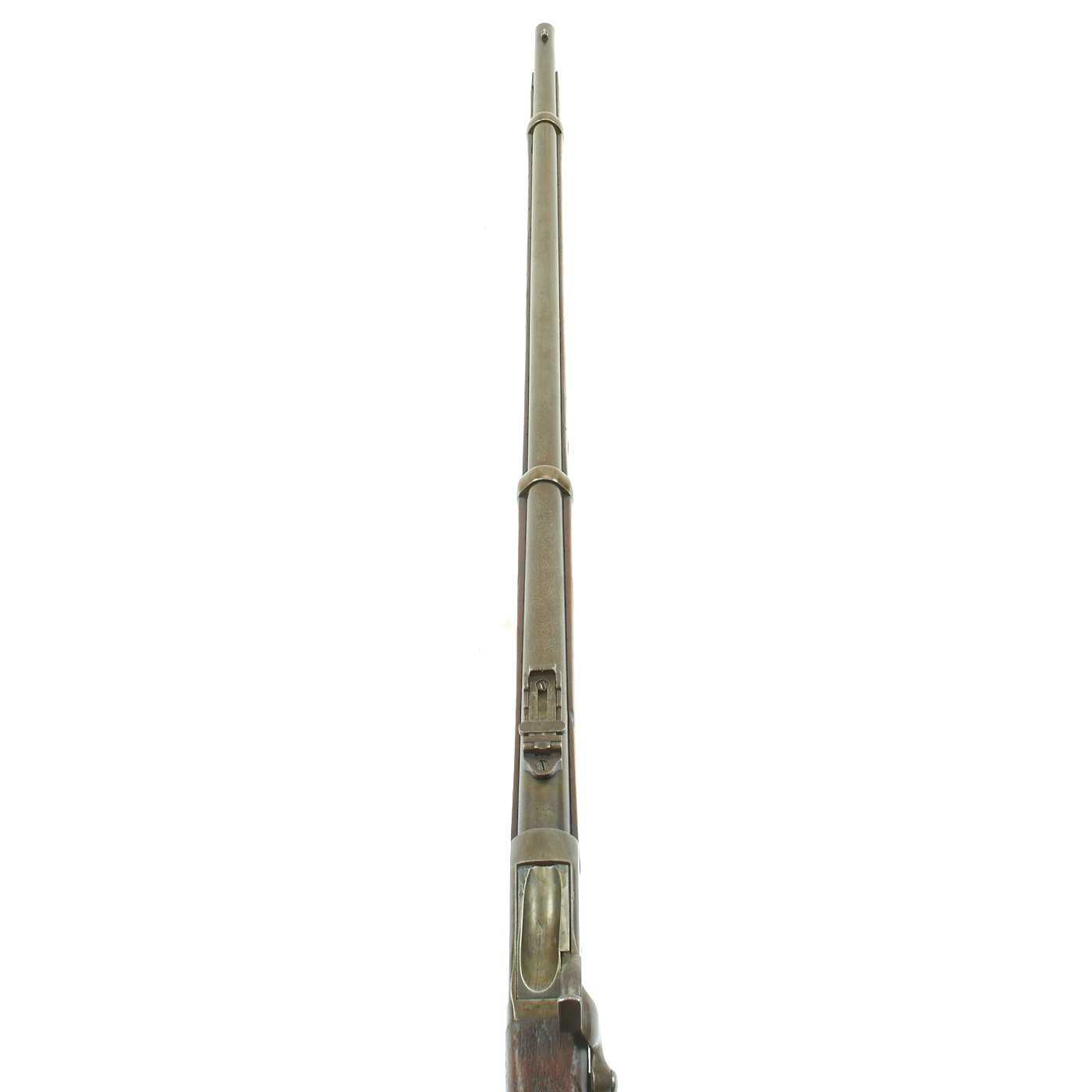 This gun is in very good condition, especially considering that it is close to 150 years in age. The wood stock has the lovely brown red color of aged walnut, though it does have some dents and wear, as expected on an old service rifle. The metalwork has a lovely gray patina, with few spots of peppering.