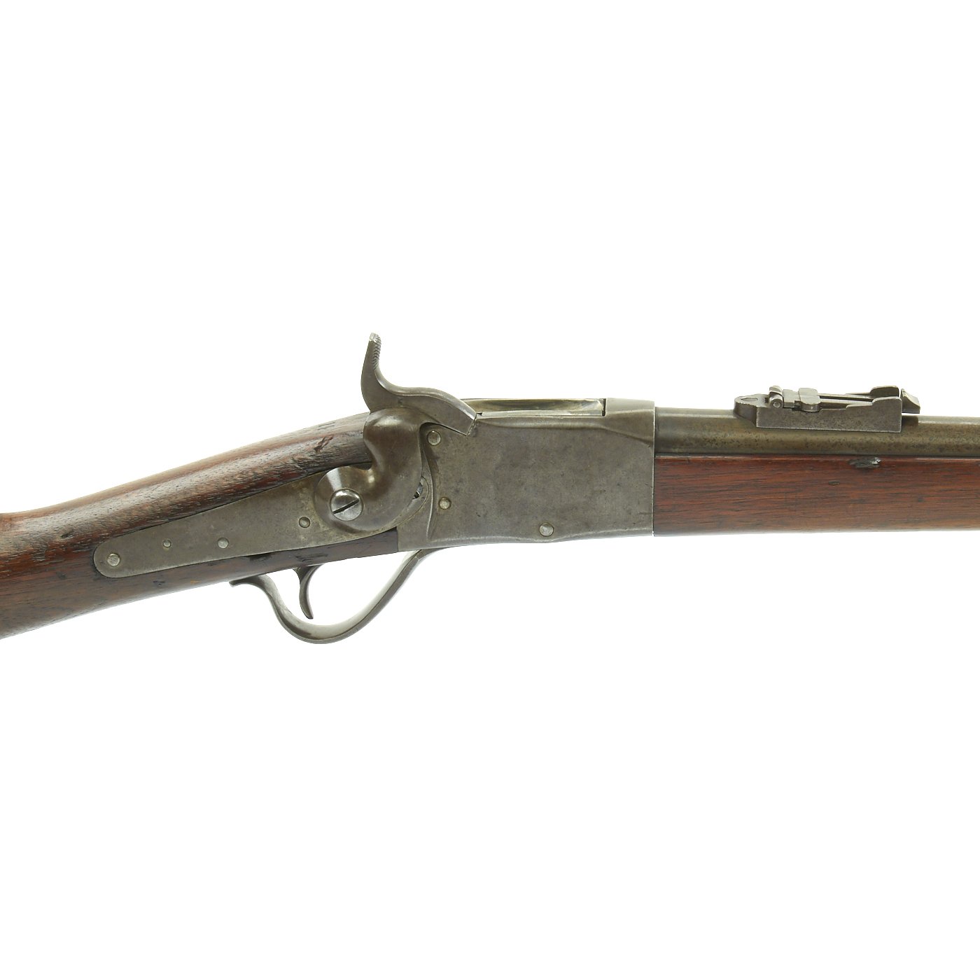 In 1862 Peabody patented a breech-loading rifle but was unable to perfect it in time to play a major role in the American Civil War (1860-1865). His basic design was based upon a pivoting breechblock, the front of which pivoted down on a transverse pin fixed through both the upper rear of the breechblock and the upper rear of the box-like receiver. As the breechblock was lowered, it exposed the barrel chamber and permitted the insertion of a cartridge. The rifle was fired by means of a musket-style outside hammer whose lockwork was inletted into the buttstock behind the receiver.