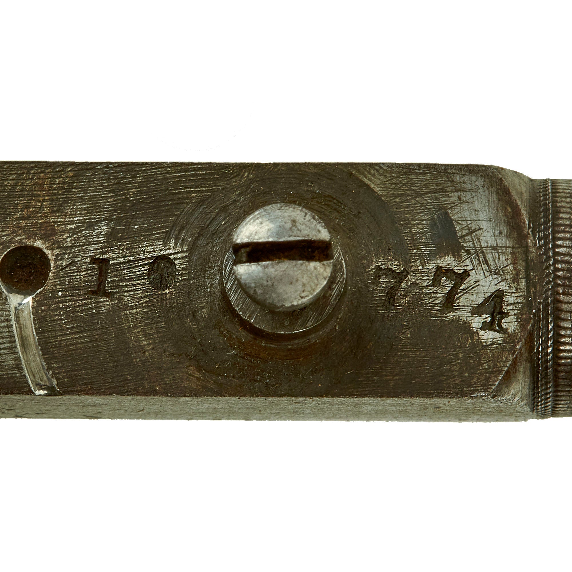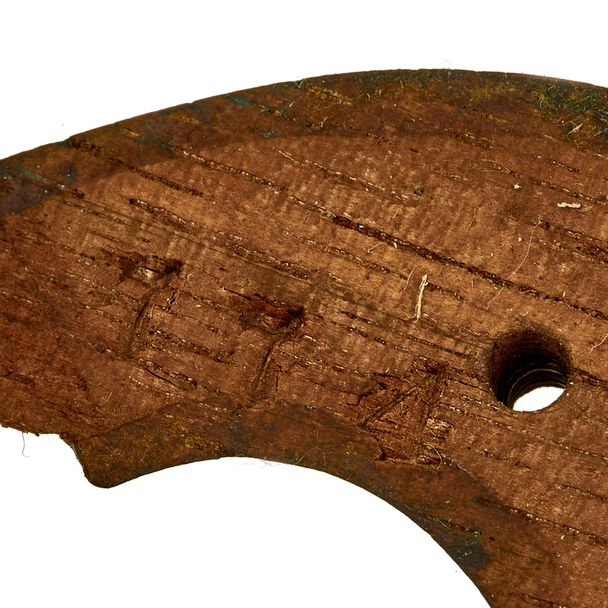 Serial #10774, .22 RF, 2 1/8 inch part round, part octagon barrel with a good plus bore showing very light pitting. The serial number is clearly marked on the frame under the grips, and on the bottom of the barrel, with shortened number 774 on the inside of BOTH grip scales. We see no evidence that any parts are not original to the pistol, making this a great "ALL MATCHING" original example.