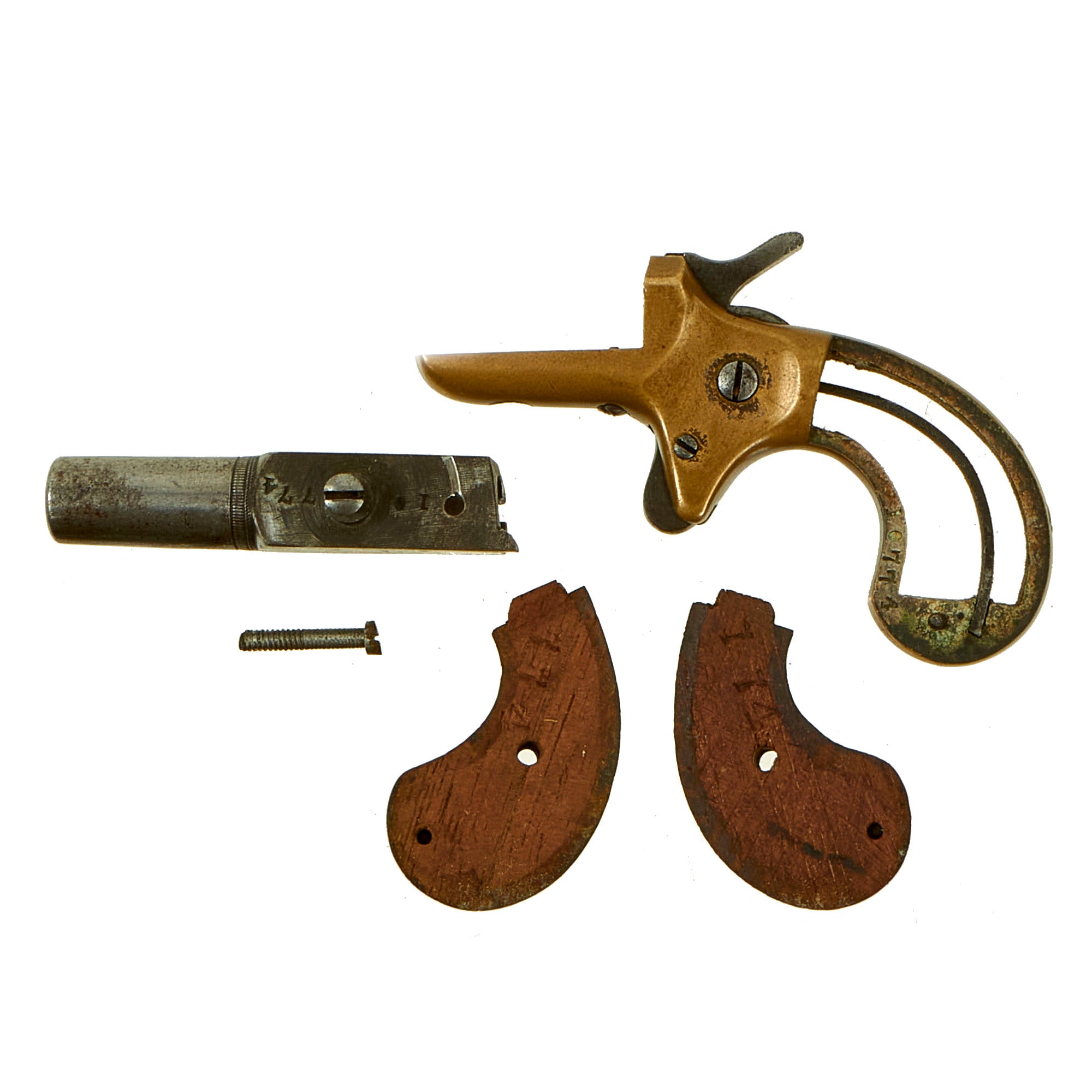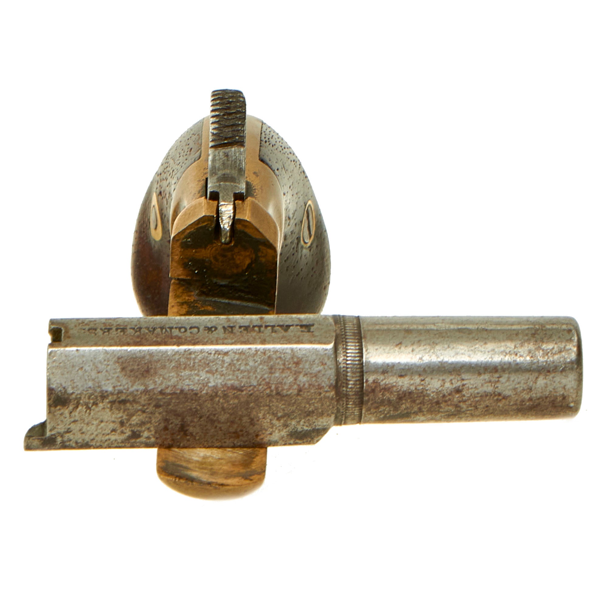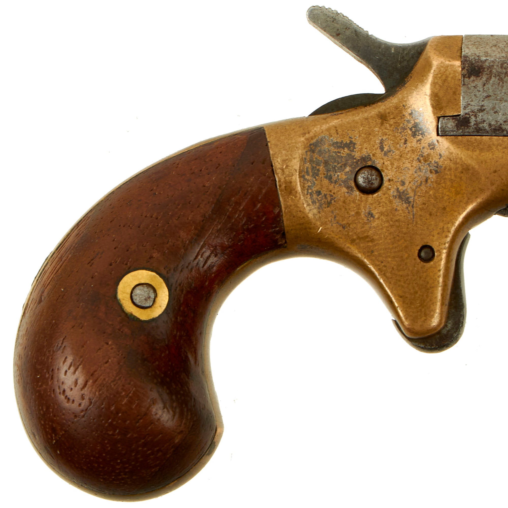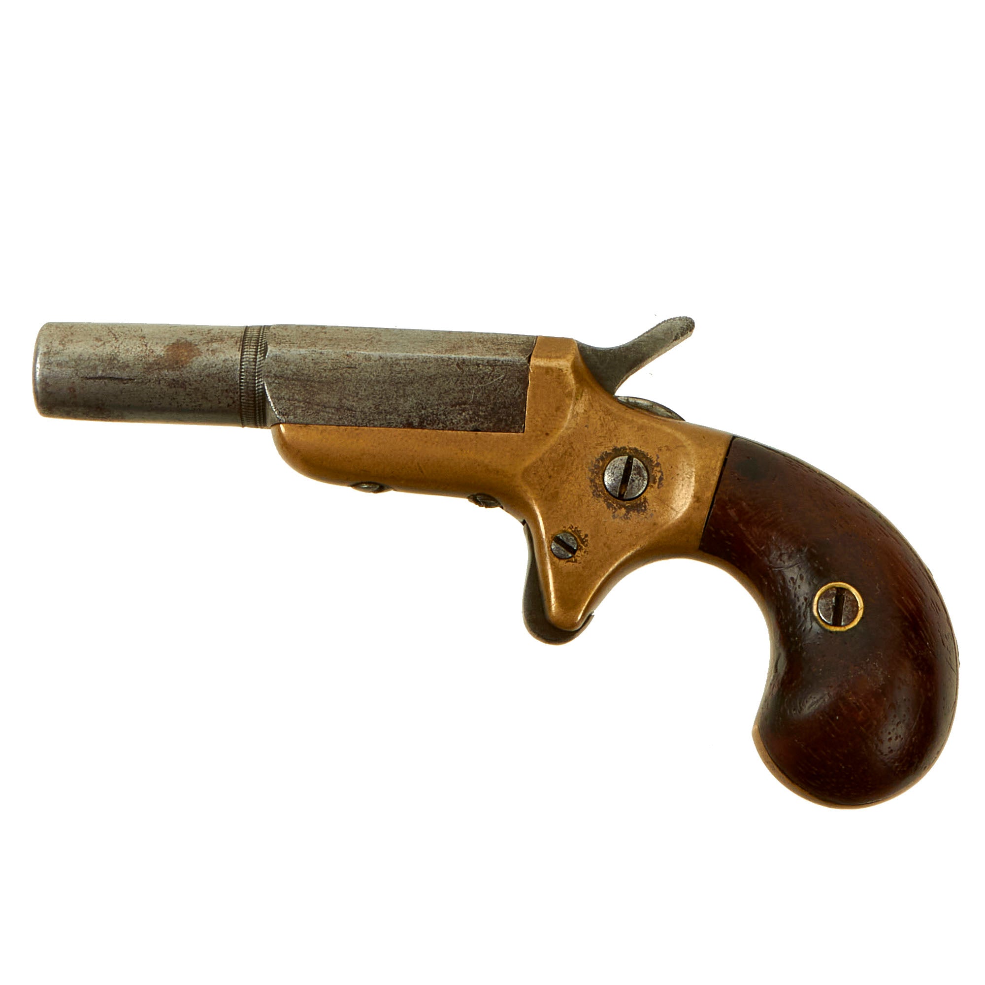 This is the Vest Pocket Derringer manufactured by the Ethan Allen Company in Worcester, MA. The gun measures 3 7/8 inches long and was advertised as being the smallest and lightest pistol on the market at the time. The barrel pivots to the right for loading and was not made with an extractor. This specimen is nickel plated with approximately 70% remaining. Minor handling marks and some specks of fine oxidation staining, mostly along the left and back side of the hammer. The top barrel flat retains a very nice crisp E. ALLEN & Co. MAKERS. stamp. The slab-sided walnut grips remain in very fine condition showing some light handling marks. The action functions well mechanically. The barrel and frame have matching numbers. A rare find in any condition this will make a wonderful addition to any collection.
