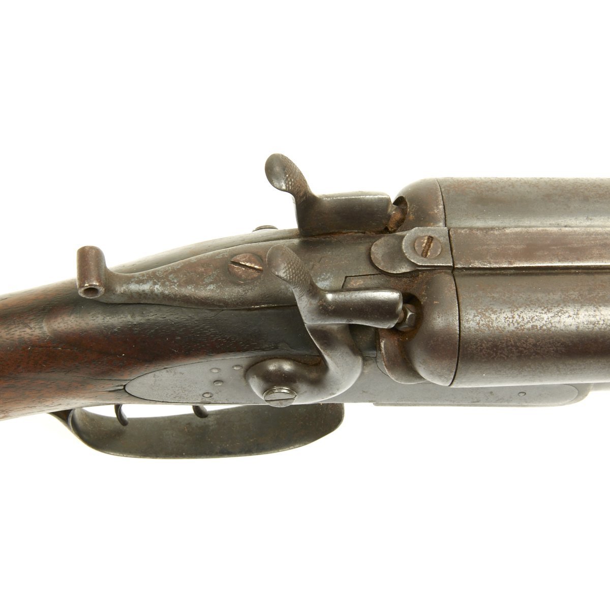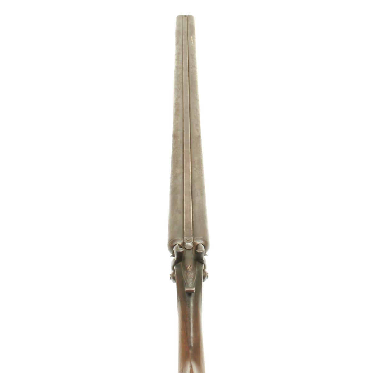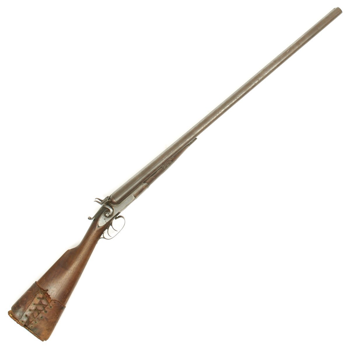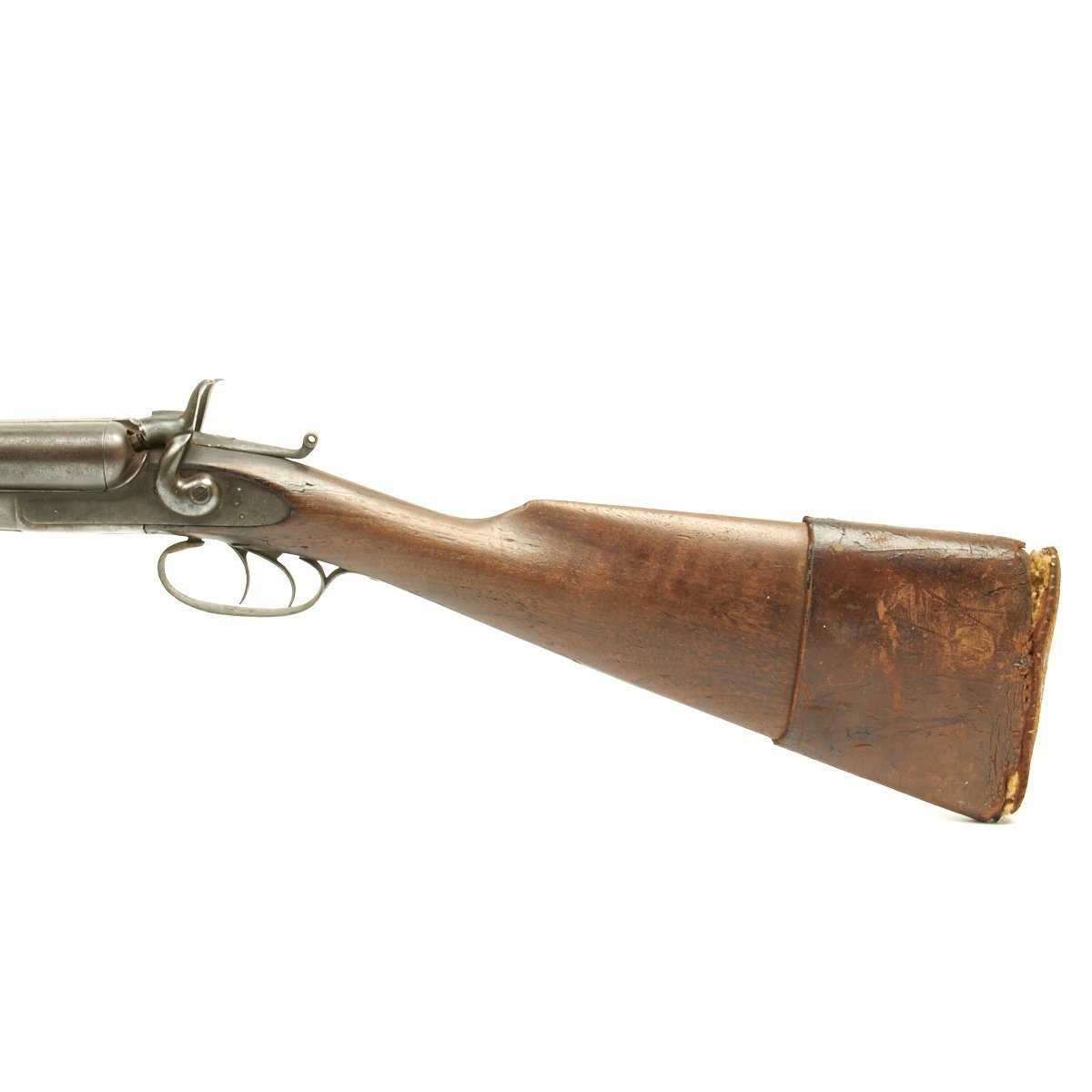 - Remington & Sons Model 1873 Whitmore Hammer Double Barrel Shotgun Serial number 2034. 10 gauge. 28-inch Damascus barrels. Concave smooth rib with E. REMINGTON & SONS ILION N.Y. Case-hardened top lever lifter action with non-rebounding bar action. Straight stock of slightly figured walnut. Steel buttplate with original leather lace up butt stock cover. Splinter fore-end with wedge fastening. Condition: Good. 30% blue on barrels, fading; 80% case-hardening, fading or gone; buttplate turned gray; 60% varnish on stocks with minor storage marks and imperfections.