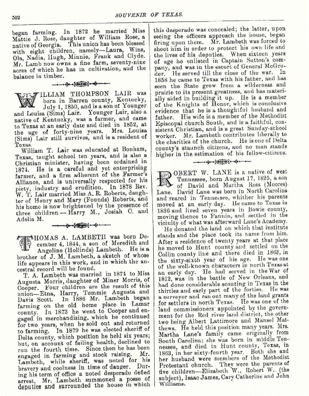 THOMAS A. LAMBETH was born December 4, 1844, a son of Meredith and Angeline (Hollinds) Lambeth. T. A. Lambeth was married in 1874 to Miss Augusta Morris, daughter of Miner Morris, of Cooper. Four children are the result of this union -- Etna, Harry, Tommie Augusta, and Davis Scott. In 1866 Mr. Lambeth began farming on the old home place in Lamar county. In 1873 he went to Cooper and engaged in merchandising, which he continued for two years, when he sold out and returned to farming. In 1879 he was elected sheriff of Delta County Texas, a position he held for six years. In 1886 he was appointed a Deputy United States Marshal of the Northern District of Texas a position he held for two years.