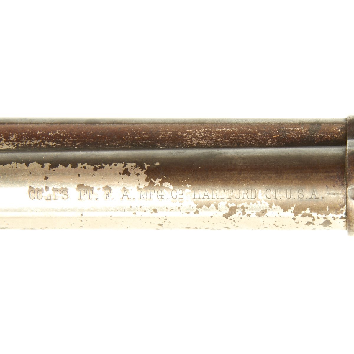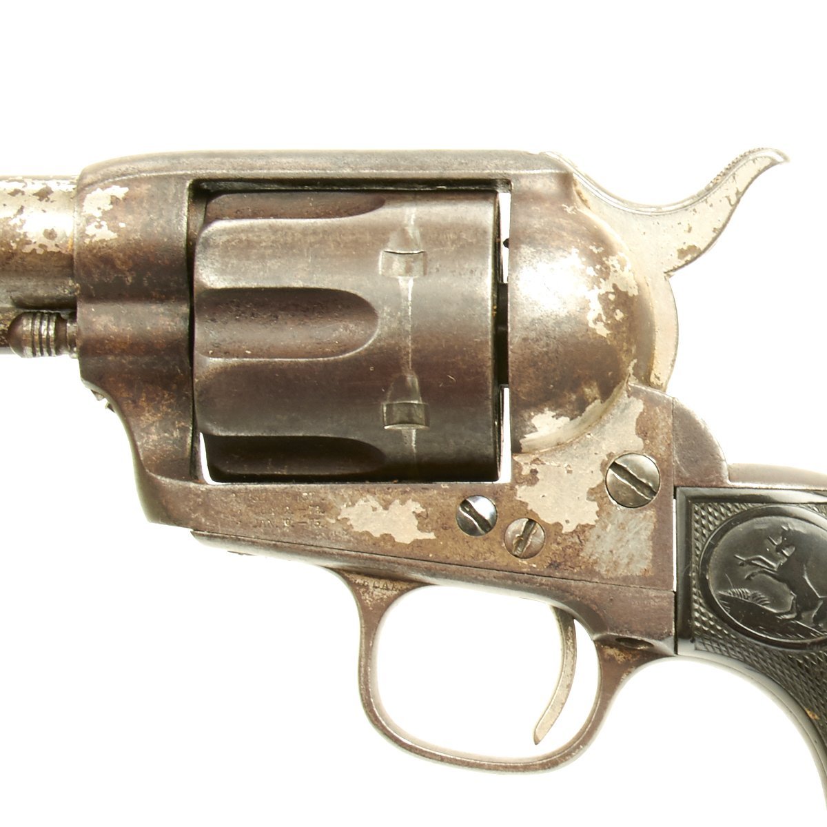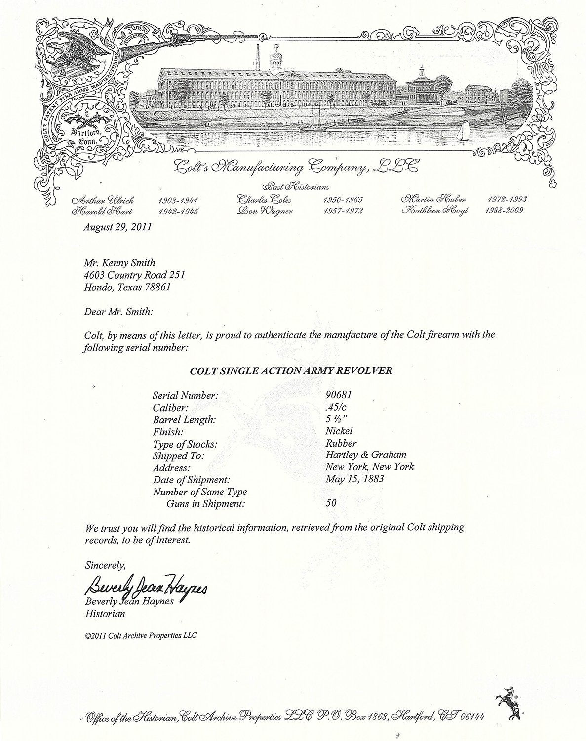 - 1873 Colt Single Action Army .45 Caliber Revolver with all matching Serial Number 90681. Also included is a letter from the Office of the Historian, Colt Archive Properties certifying that this pistol was sold to the well known retailer Hartley & Graham in New York, NY on May 15th, 1883. It features a 5 1/2 inch barrel, nickel finish and black rubber grips. Overall condition is very good and functional, with approximately 35% of the nickle finish remaining.
