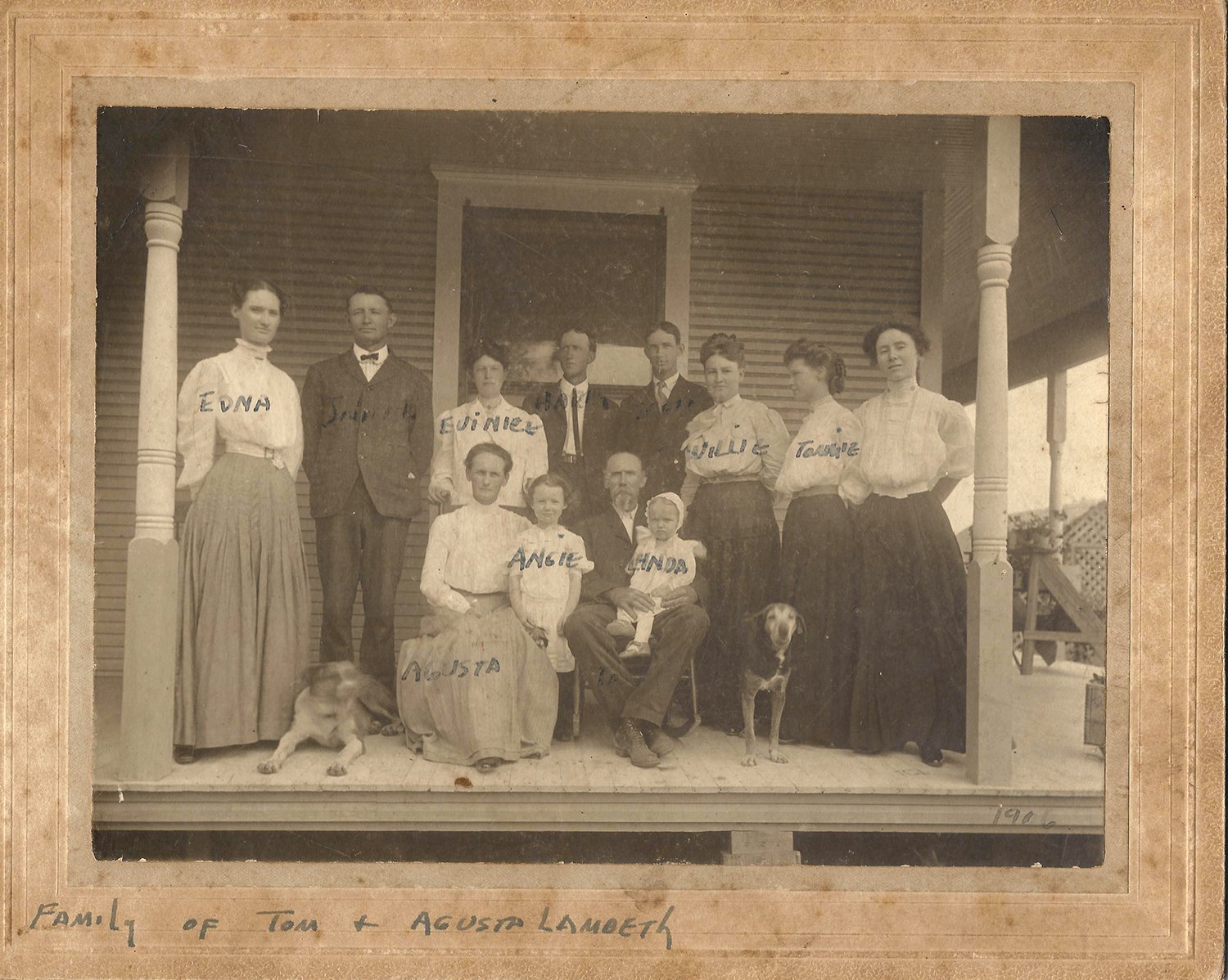 - Original 10 x 8 inch family photo of Lambeth, his wife Augusta and their children with spouses and grand children on the front porch of their home circa 1910.