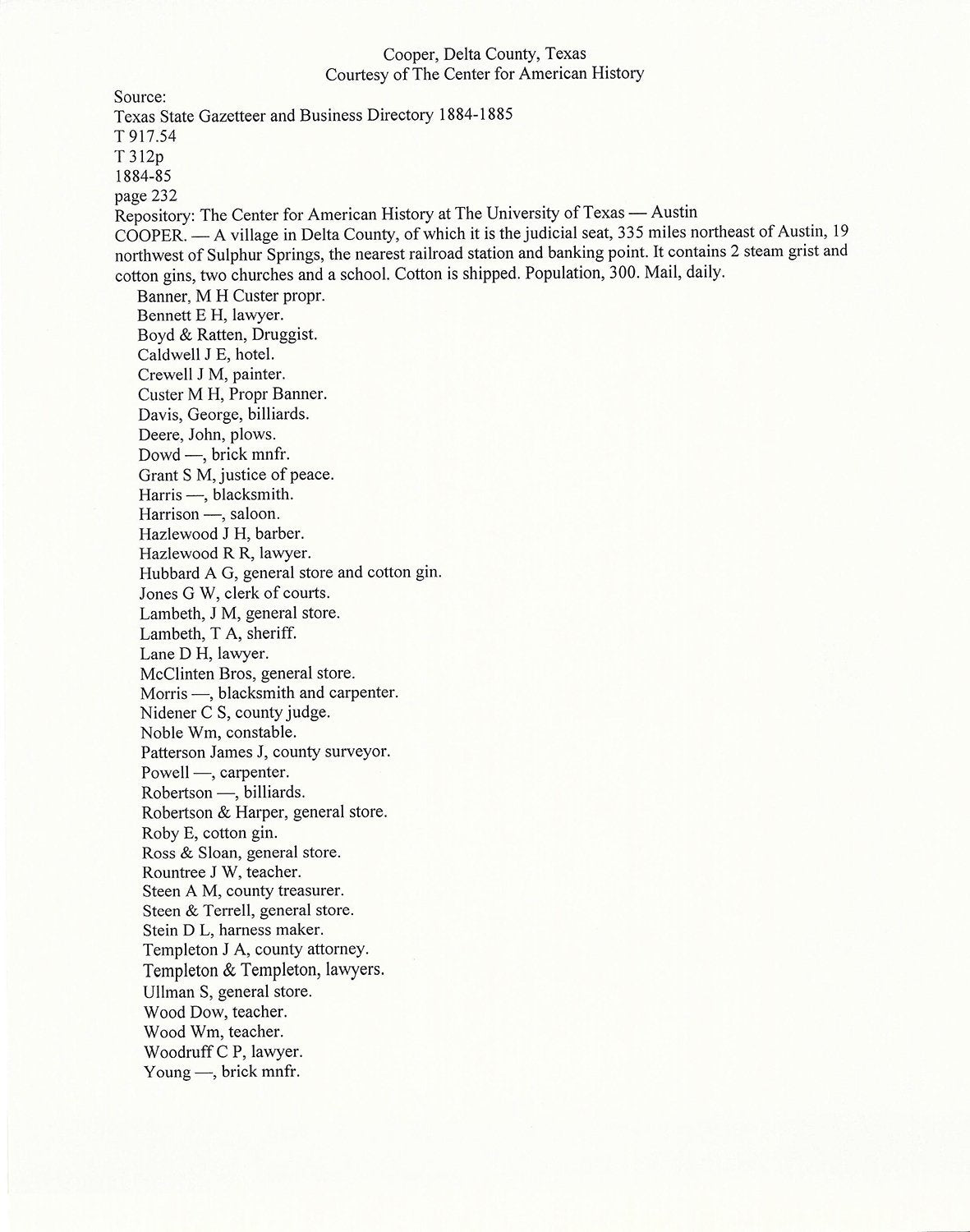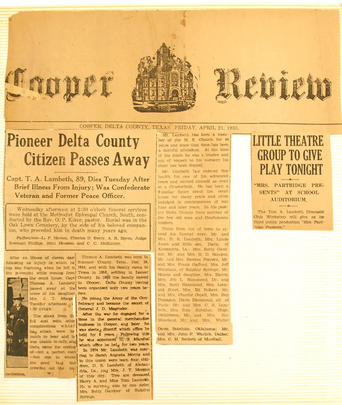 - Original Delta County Texas Cooper Review newspaper obituary dated April 21st, 1933 for Thomas A. Lambeth. All details of his service in the Confederacy under General Magruder, Sheriff of Delta County Texas and services as a Deputy U.S. Marshal are confirmed in the obituary.