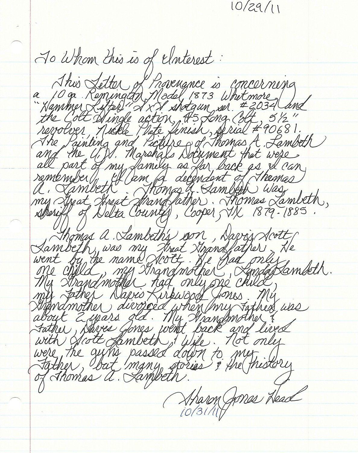 - Signed notarized letter providing provenance for the Colt revolver with serial number, the 1873 Remington Whitmore Shotgun with serial number, the photo, painting and the U.S Marshal Commission. Letter was signed by Sharon Jones Head who was the Great Great Grand Daughter of Thomas A. Lambeth. She certifies that all this material remained in her family and was handed down generation by generation directly to her. The letter is dated October 29th, 2011.