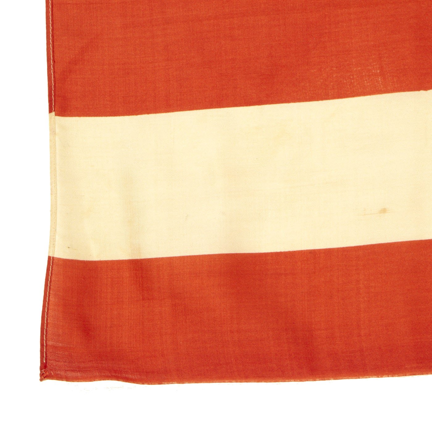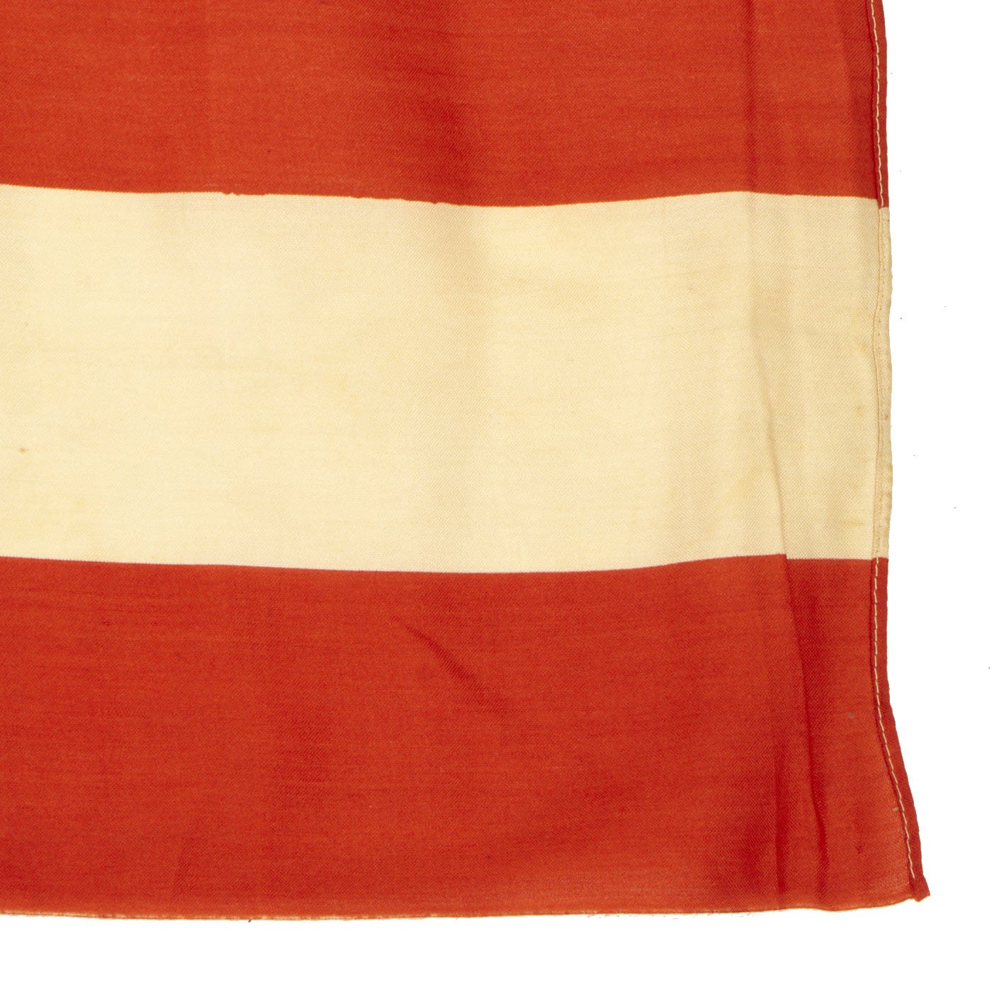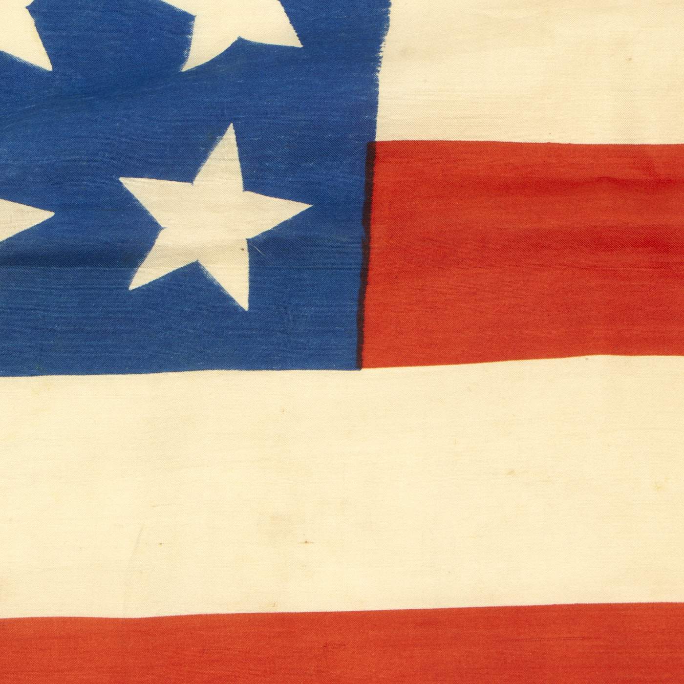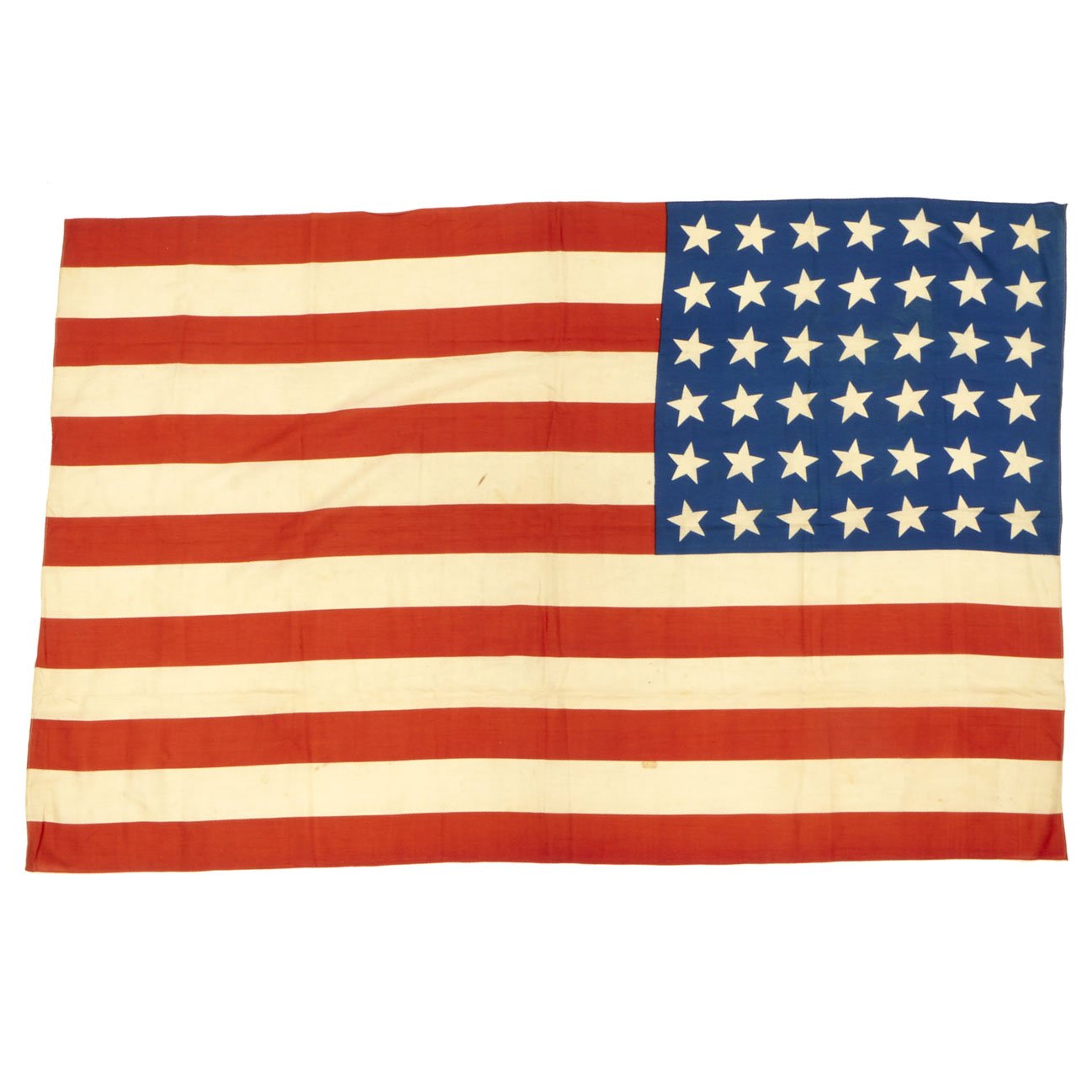 This fine flag is the first 42 star example we have ever offered. This United States National Flag is in an easily displayable 30" x 47" size, and looks to be made from dyed silk, or possibly rayon, which had been in production in the U.S. since 1846. The two short ends are stitched, while the longer sides are the edge of the weave, and did not need stitching to secure them.