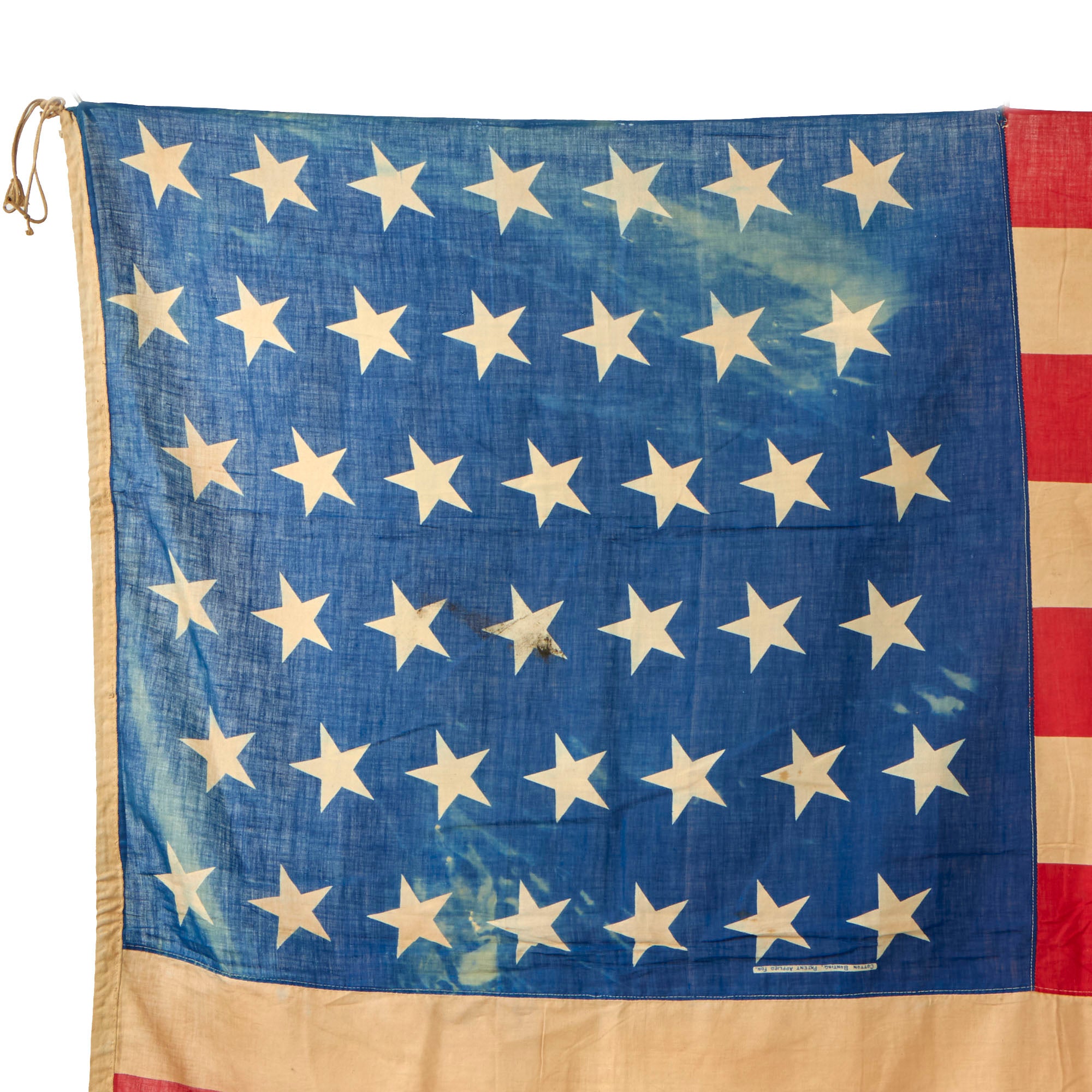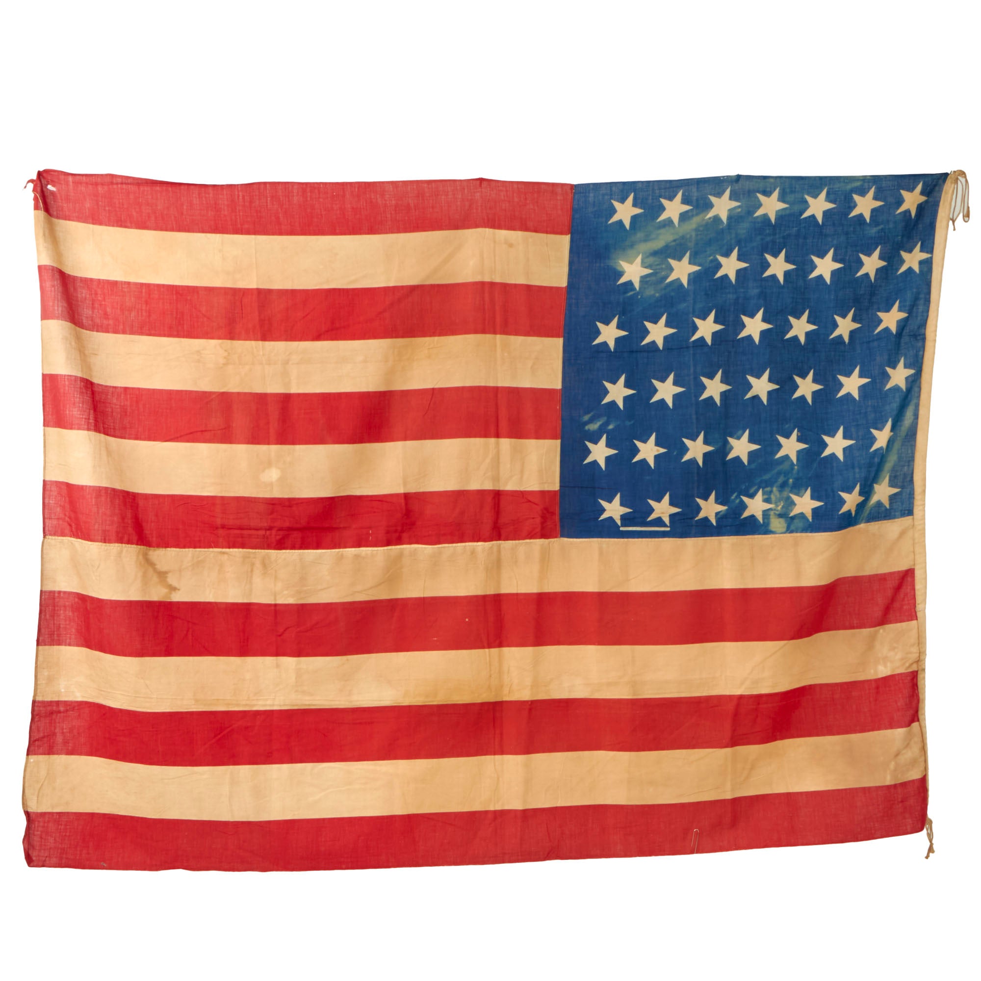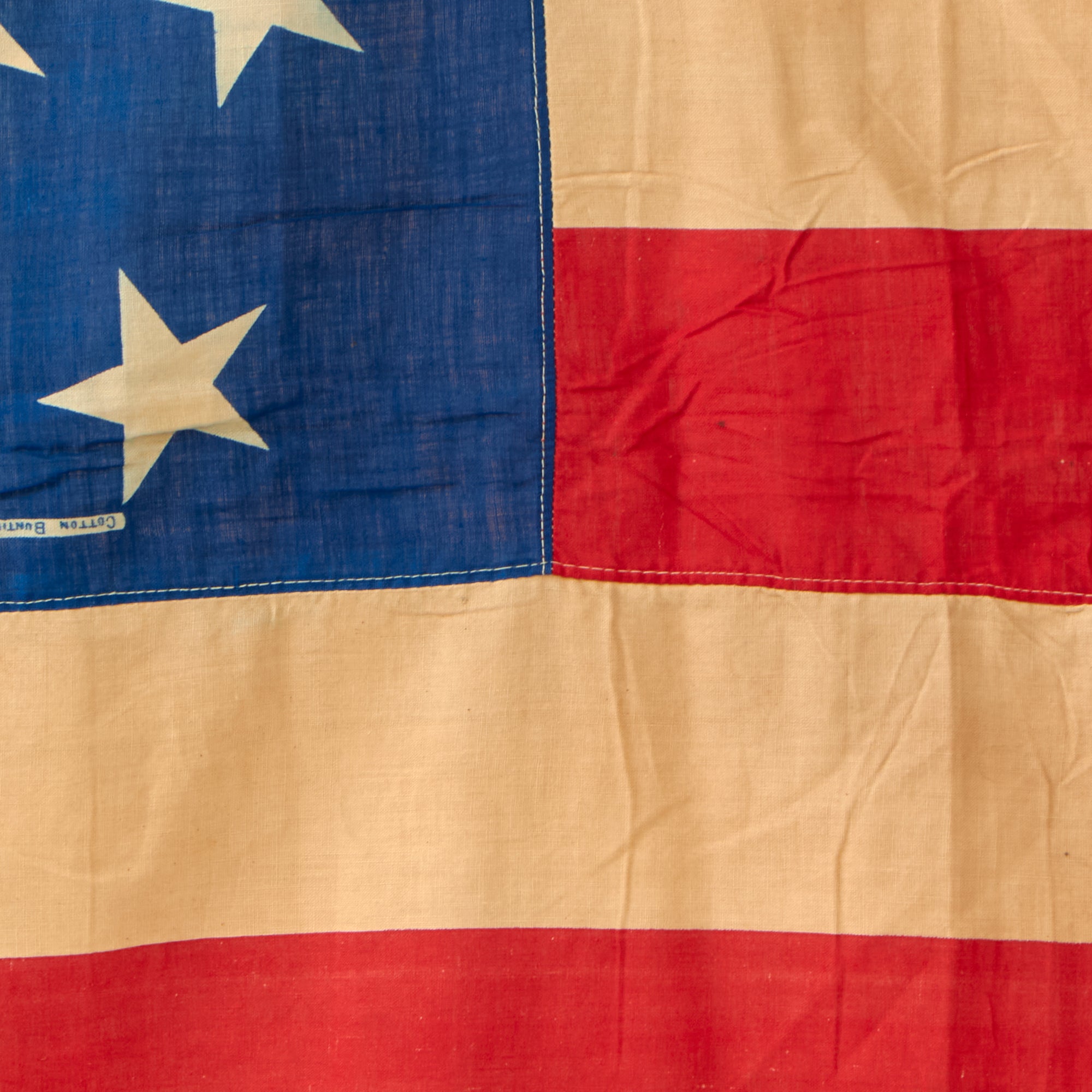 Original Item: Only One Available. Now these are hard to come by! A "Flag that Never Was"! The late 19th century was a very busy time for flag makers, as many new states were ready to join the union. In November 1889, North Dakota, South Dakota, Washington, and Montana were all admitted to the union. The previous 38 star flag would then be replaced by a new national flag on the next July 4th, as was the tradition.To get a jump start on production, flag makers started to produce 42 star flags, so they could be ready for July 4th. Idaho had also applied for statehood, but it was assumed that it would not be admitted until after July 4th. Unfortunately for the flag makers, President Benjamin Harrison signed into law the admission of Idaho as the 43rd state on July 3rd, meaning that all of the 42 star flags were "unofficial" and had to be discarded, as such they are extremely rare.This fine flag is only the second 42 star example we have ever offered. This United States National Flag is in a sizable 50 x 66” and retains the hand-sewn header and ropes, and looks to be made from dyed silk, or possibly rayon, which had been in production in the U.S. since 1846. The flag is in two pieces, sewn at the middle. Very strangely, in the blue canton is the text COTTON BUNTING - PATENT APPLIED FOR, something you’d assume to see on a header. These “unofficial” examples certainly have their quirks!A very nice example, one of the scarcest US Flags we’ve offered, ready to display!