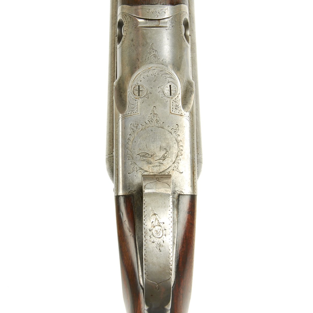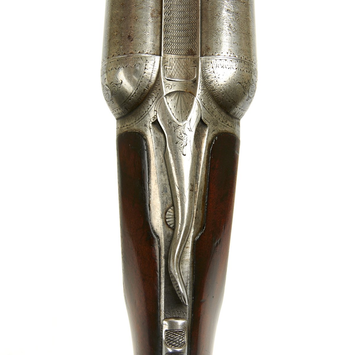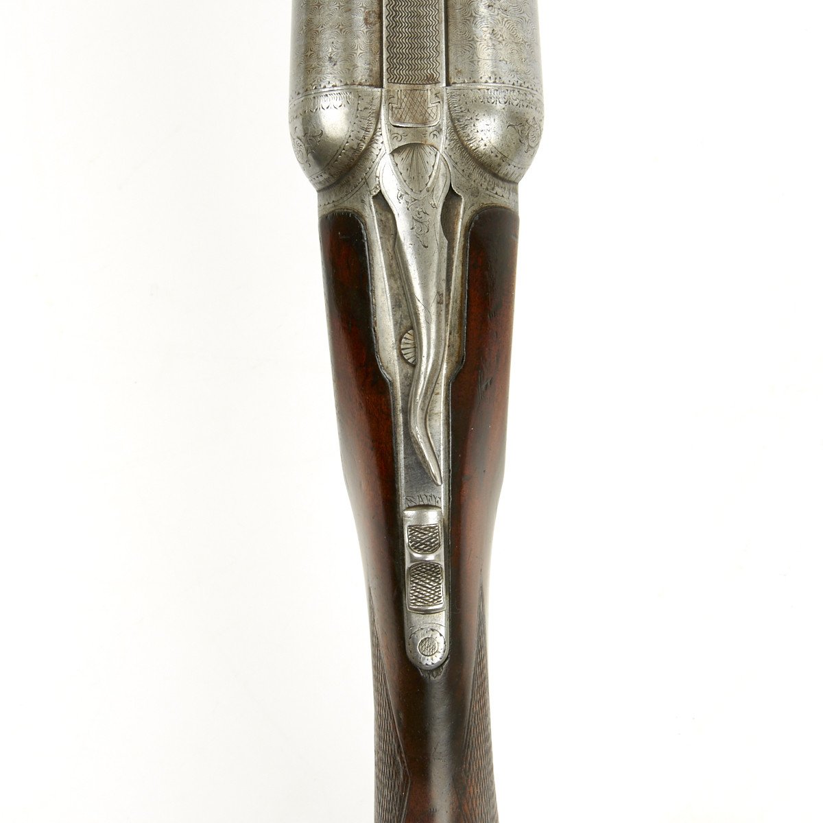 This 12 gauge is a grade 2 (GH) with a size 1 frame. The serial number is 68088, which can be clearly seen on the trigger guard, water table, fore-end and barrel lug. The serial number denotes the year of manufacture as 1892. It features a double trigger, fishtail break open lever and fine upgraded Damascus Steel barrels that are in lovely condition with mirror bright bores. Stock has vibrant grain pattern with original finish and shows a few minor dings from use and age. Overall condition of the shotgun is 8+.