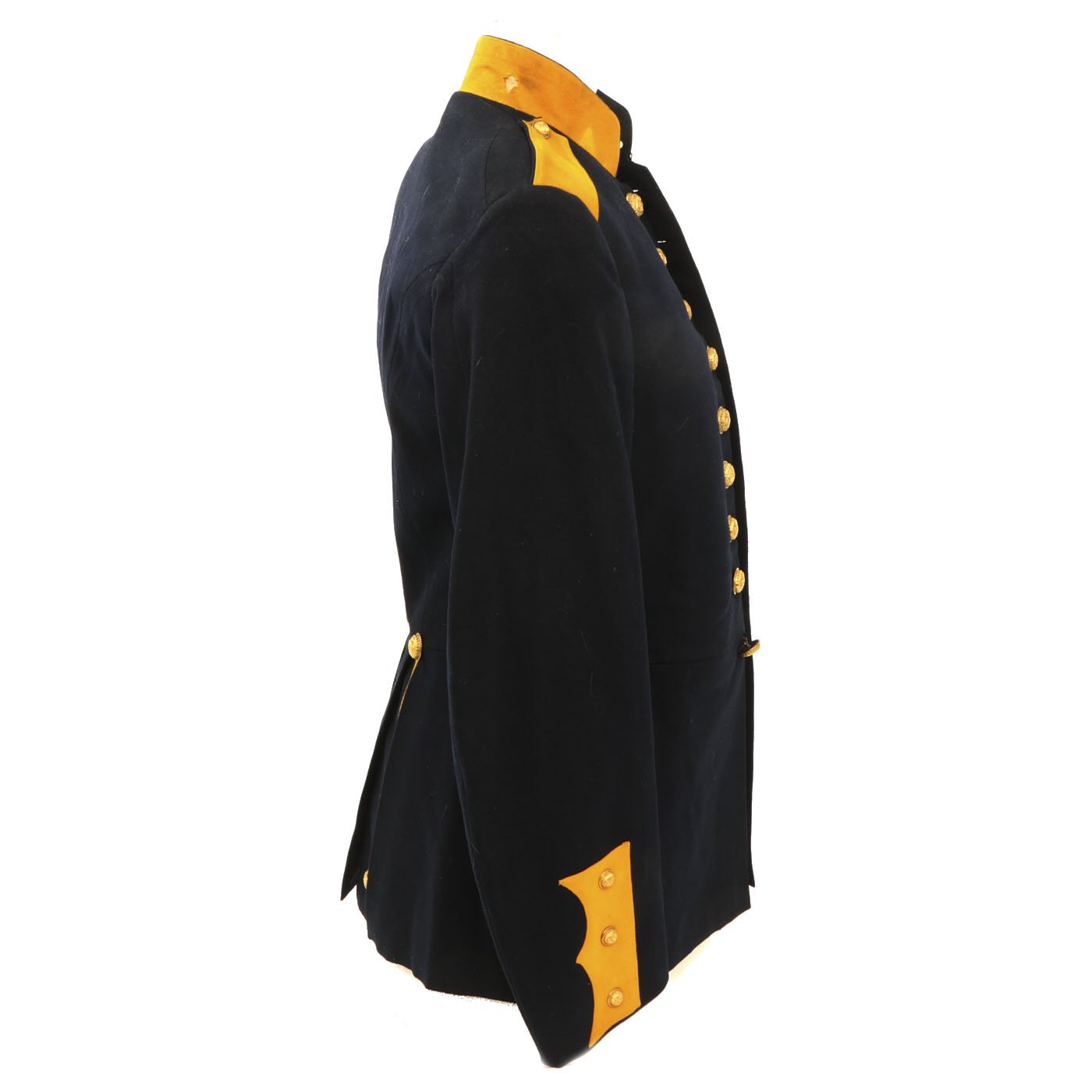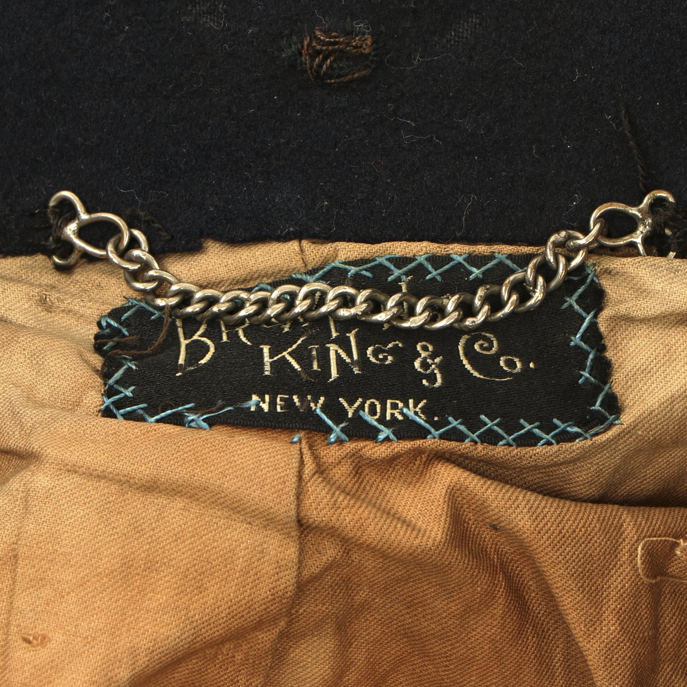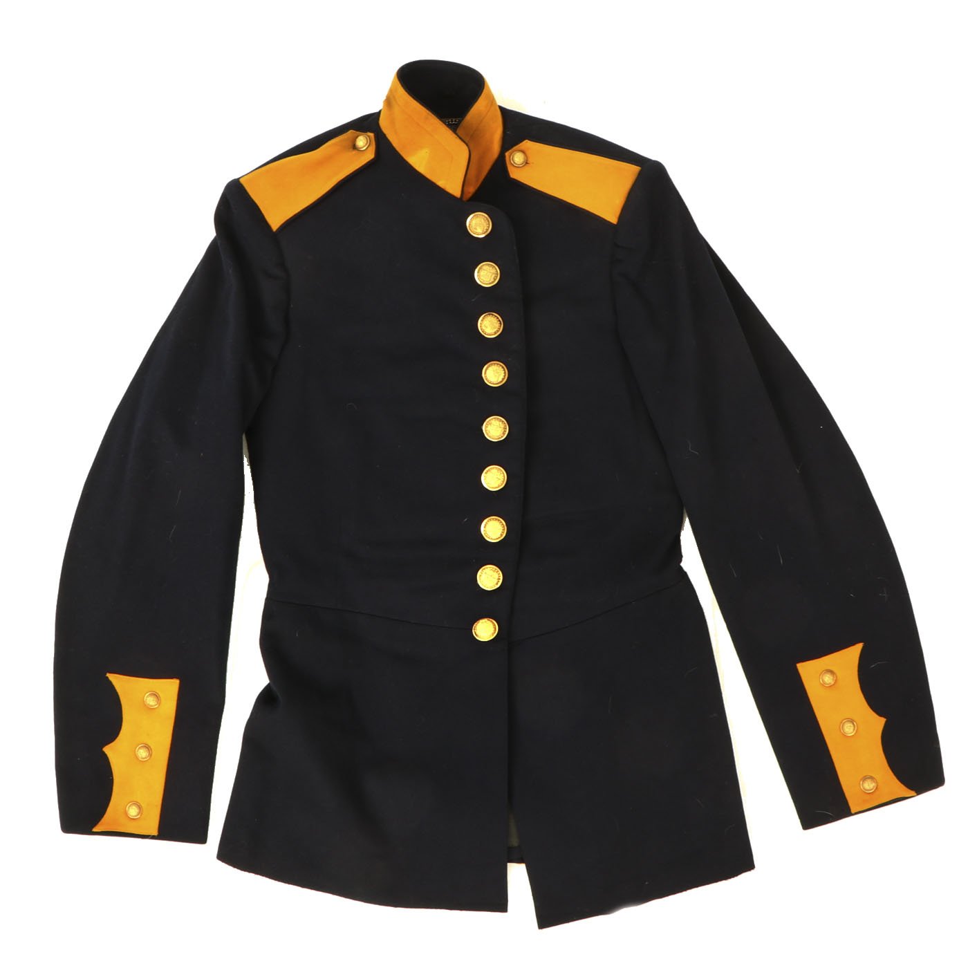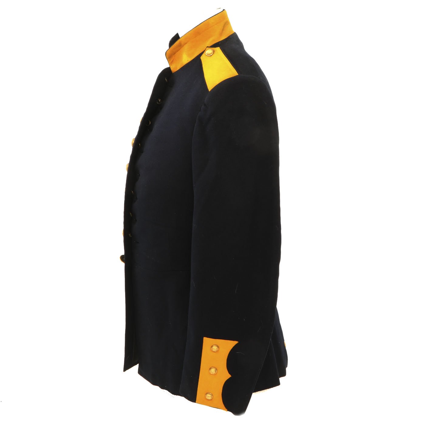 Original Item Only One Available. This is a very nice 1894 dated State of New York Militia dress uniform coat constructed of heavy blue wool with yellow collar, shoulder boards and cuffs possibly indicating cavalry issue. All buttons features the State of New York insignia and EXCELSIOR and all are back marked by the National Button Company. Inside the jacket is an original tailor label from BROWNING KING & CO as well as an ink stamp with clear 1894 date. The jacket is lined with a machine quilted lining of a light color. The vent tails are lined in yellow wool, and one side contains a secret pocket. Overall condition is very good.