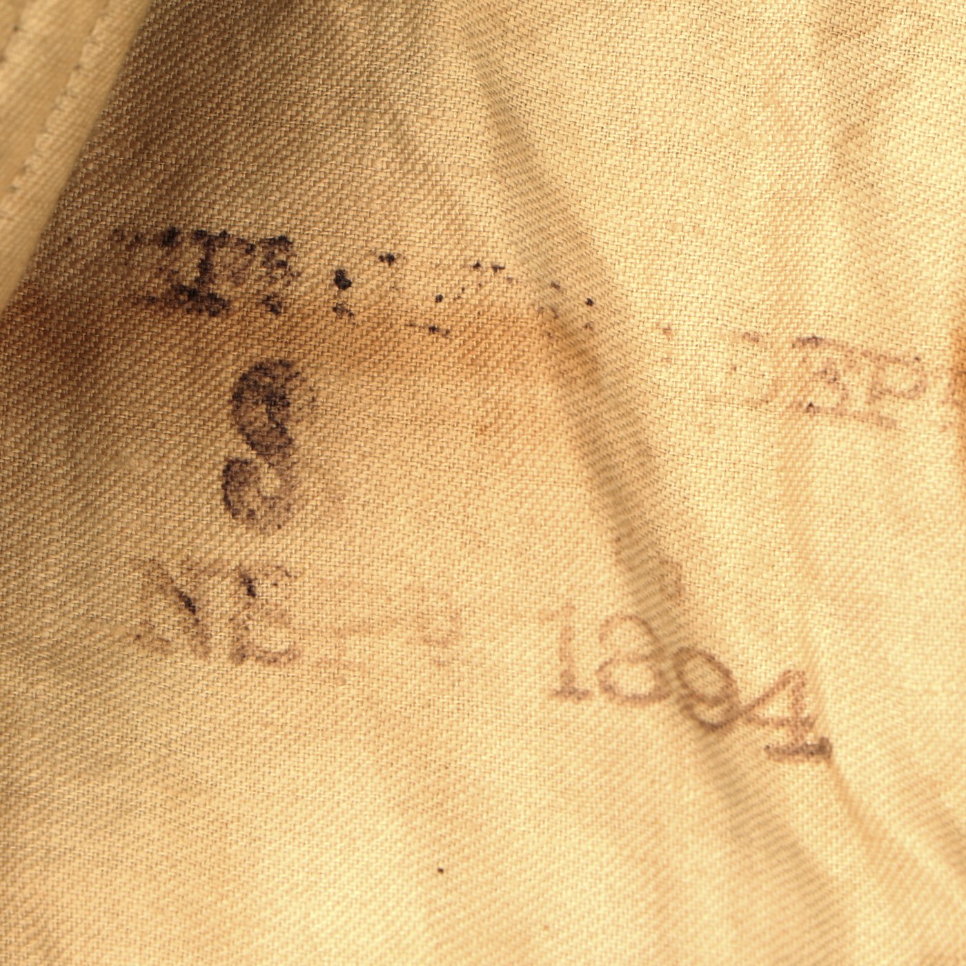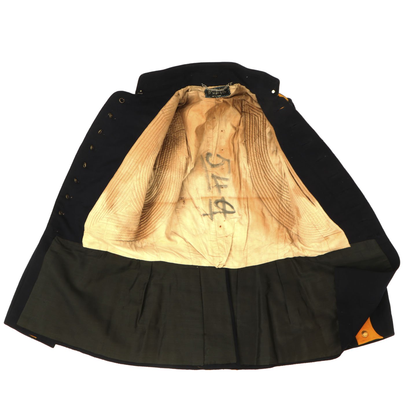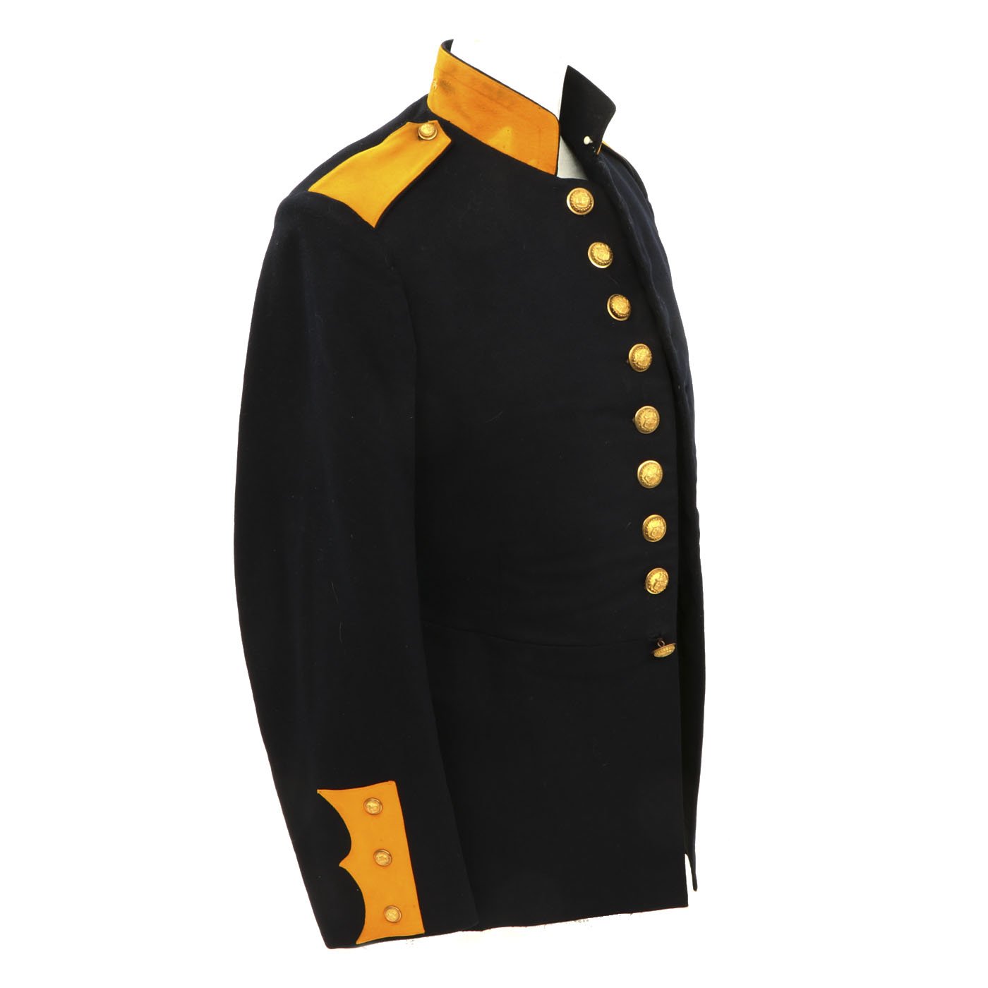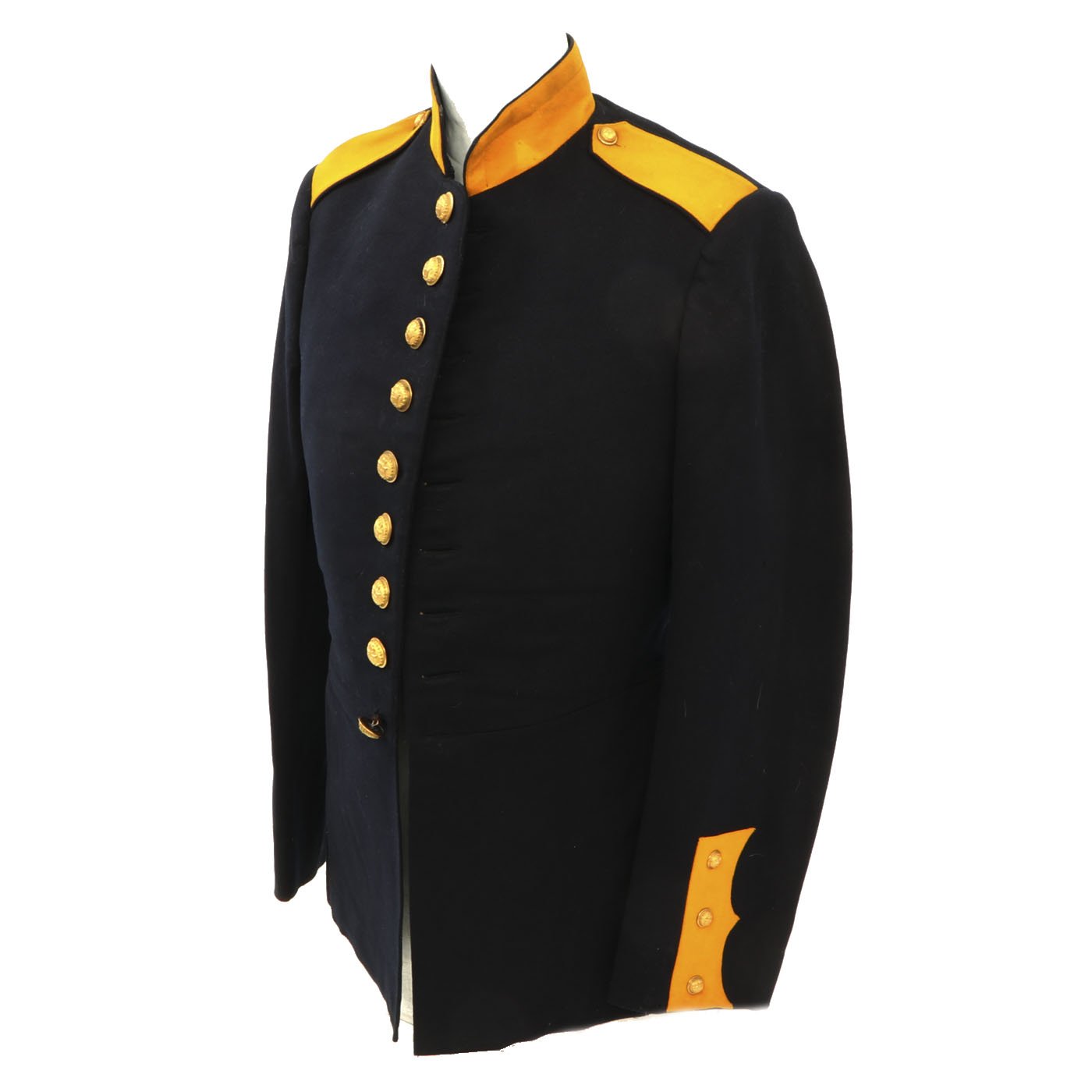 Original Item Only One Available. This is a very nice 1894 dated State of New York Militia dress uniform coat constructed of heavy blue wool with yellow collar, shoulder boards and cuffs possibly indicating cavalry issue. All buttons features the State of New York insignia and EXCELSIOR and all are back marked by the National Button Company. Inside the jacket is an original tailor label from BROWNING KING & CO as well as an ink stamp with clear 1894 date. The jacket is lined with a machine quilted lining of a light color. The vent tails are lined in yellow wool, and one side contains a secret pocket. Overall condition is very good.
