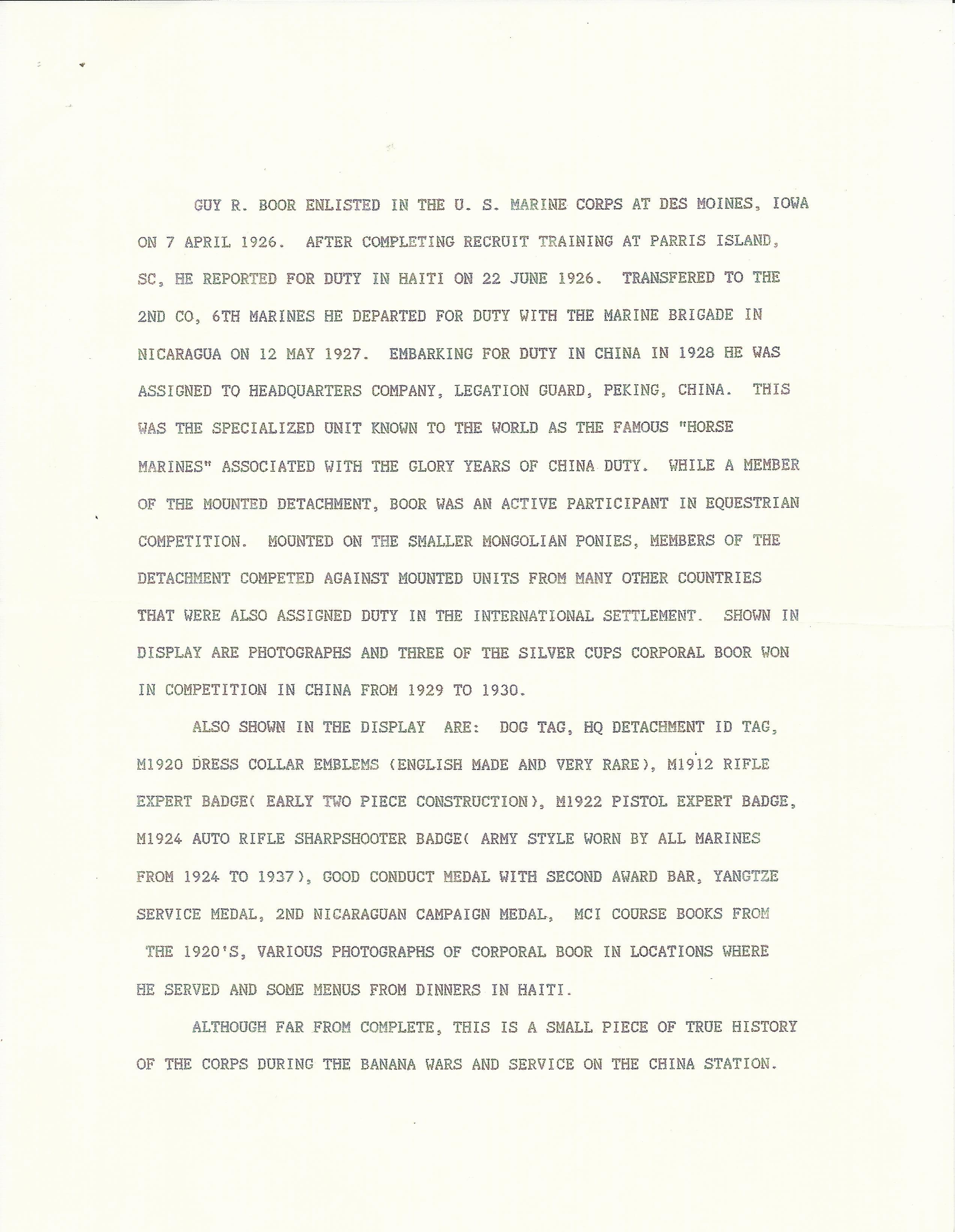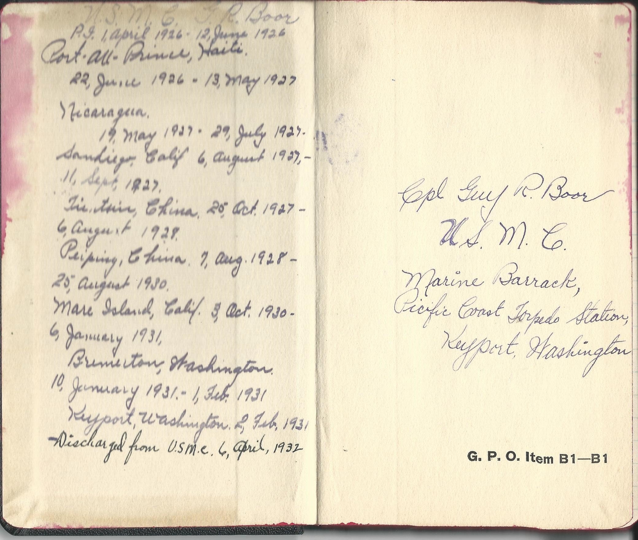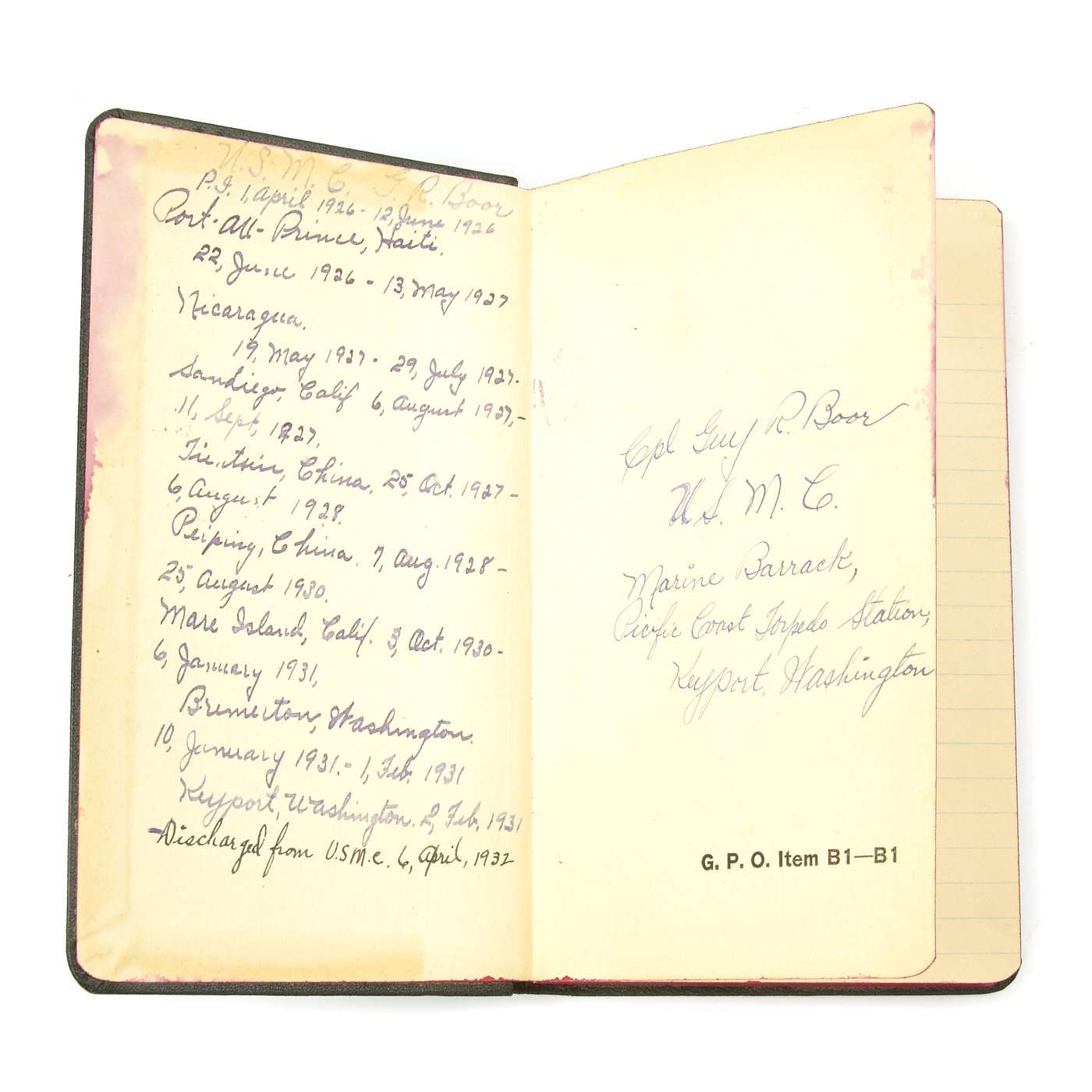 Original Items: One-of-a-kind grouping. Corporal Guy R. Boor enlisted in the United States Marine corps at Des Moines, Iowa on 7 April 1926. After completing recruit training at Parris Island, SC, He reported for duty in Haiti on 22 June 1926.