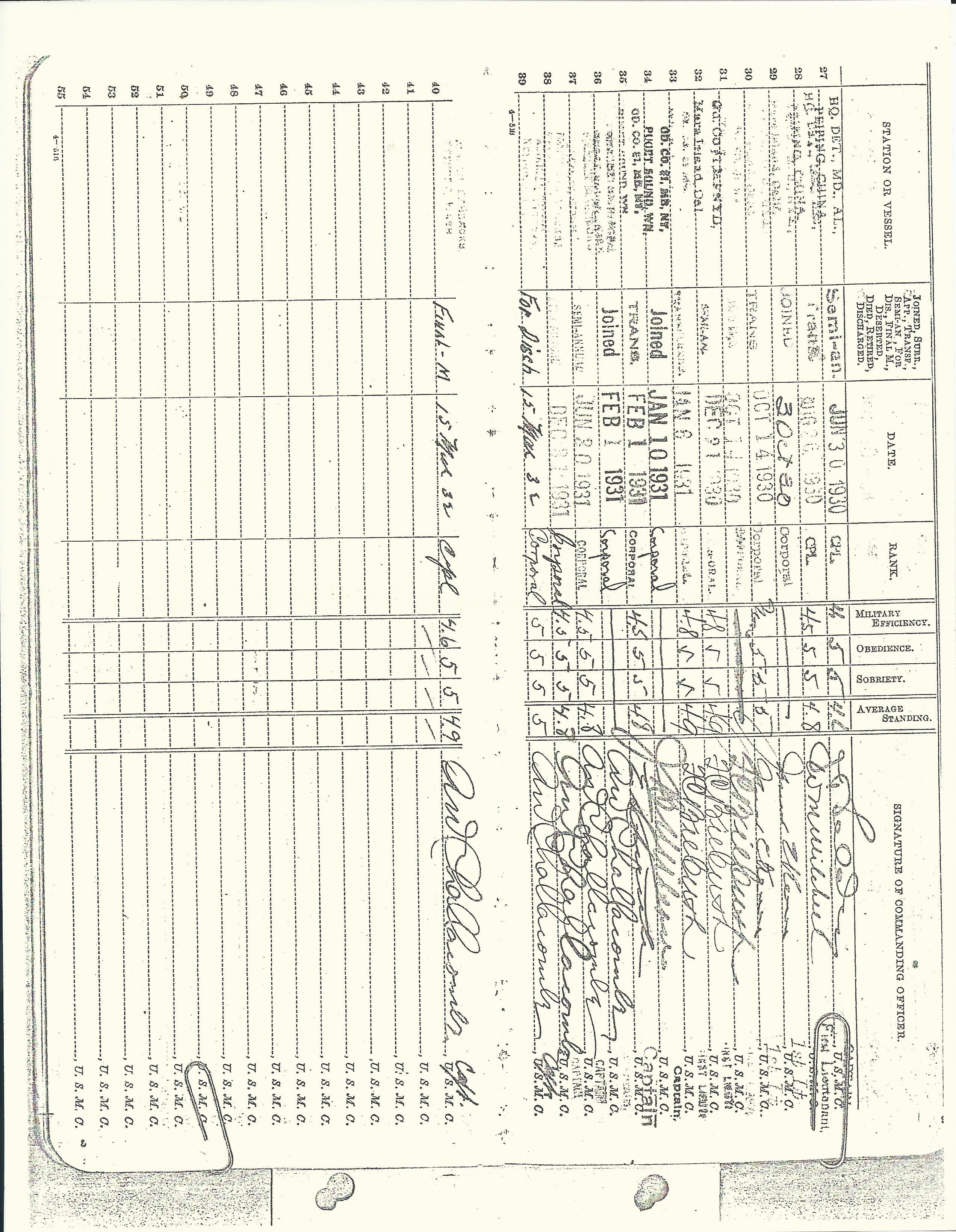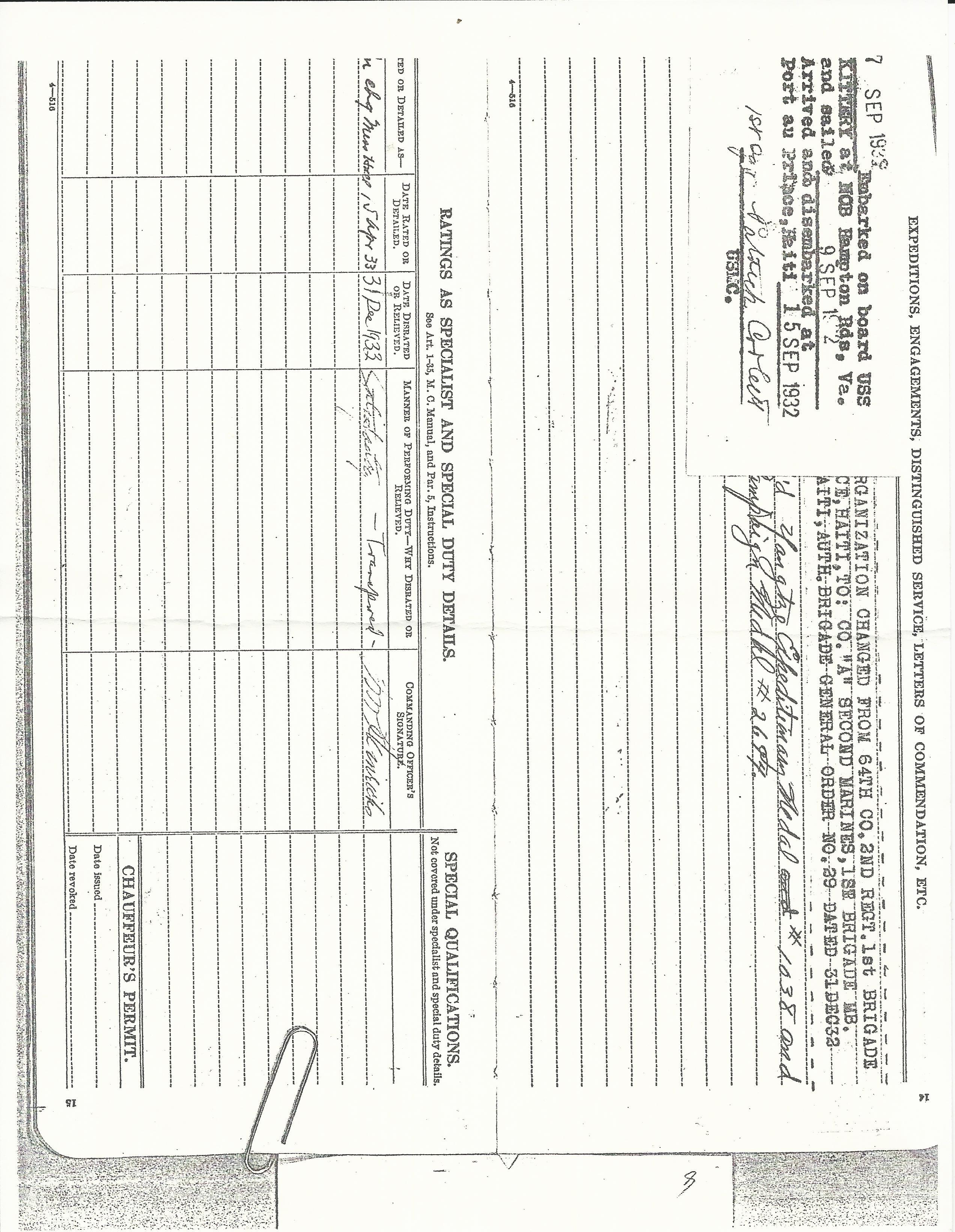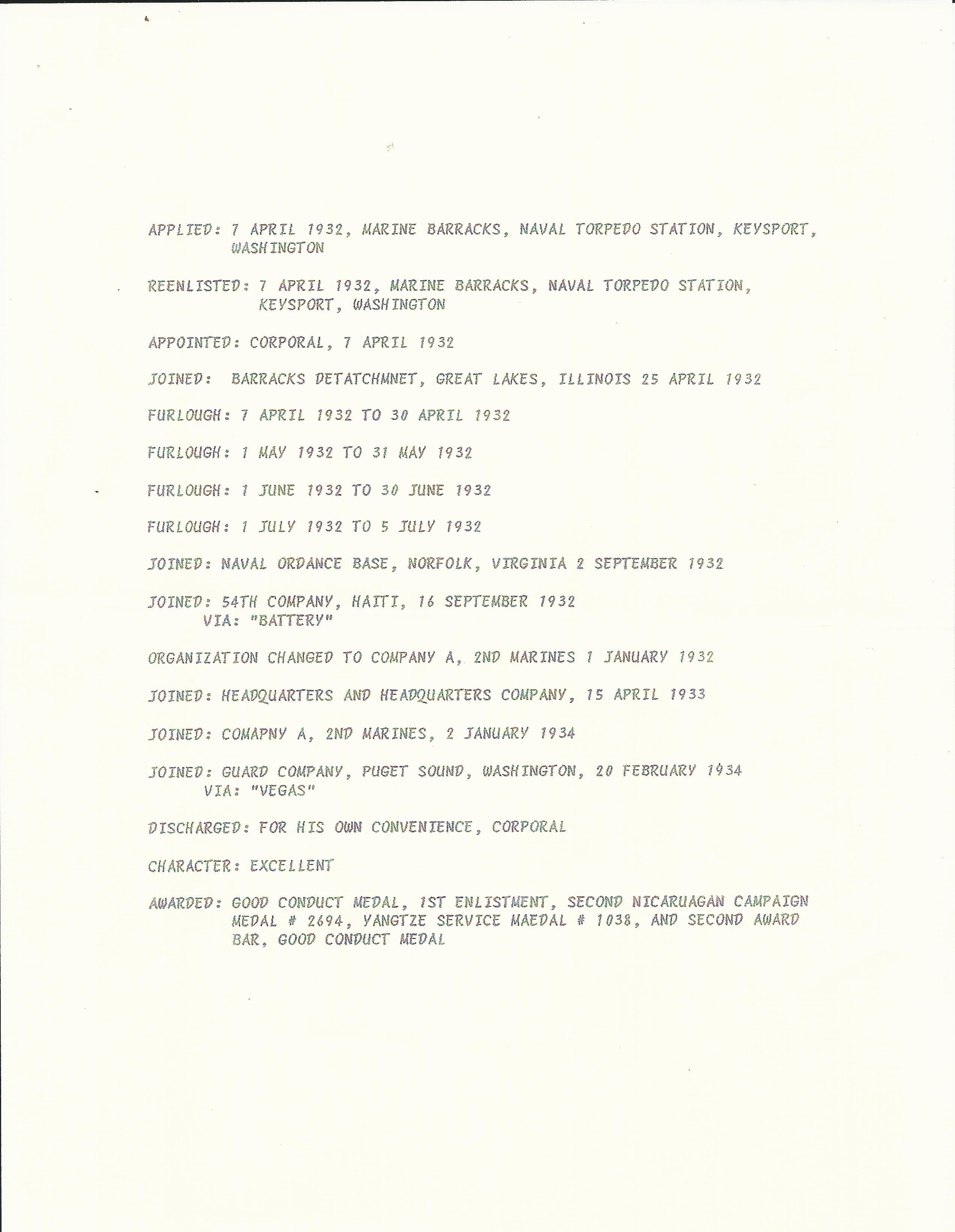 REENLISTED: 7 APRIL 1932, MARINE BARRACKS, NAVAL TORPEDO STATION, KEYSPORT, WASHINGTON APPOINTED: CORPORAL, 7 APRIL 7932 JOINED: BARRACKS DETACHMENT, GREAT LAKES, ILLINOIS 25 APRIL 1932 FURLOUGH: 7 APRIL 1932 TO 30 APRIL 7932 FURLOUGH: 1 MAY 1932 TO 31 MAY 1932 FURLOUGH: 1 JUNE 1932 TO 30 JUNE 1932 FURLOUGH: 1 JULY 1932 TO 5 JULY 1932 JOINED: NAVAL ORDNANCE BASE, NORFOLK, VIRGINIA 2 SEPTEMBER 1932 JOINED: 54TH COMPANY, HAITI, 16 SEPTEMBER 1932 VIA: "BATTERY" ORGANIZATION CHANGED TO COMPANY A, 2ND MARINES 1 JANUARY 1932 JOINED: HEADQUARTERS AND HEADQUARTERS COMPANY, 15 APRIL 1933 JOINED: COMPANY A, 2ND MARINES, 2 JANUARY 1934