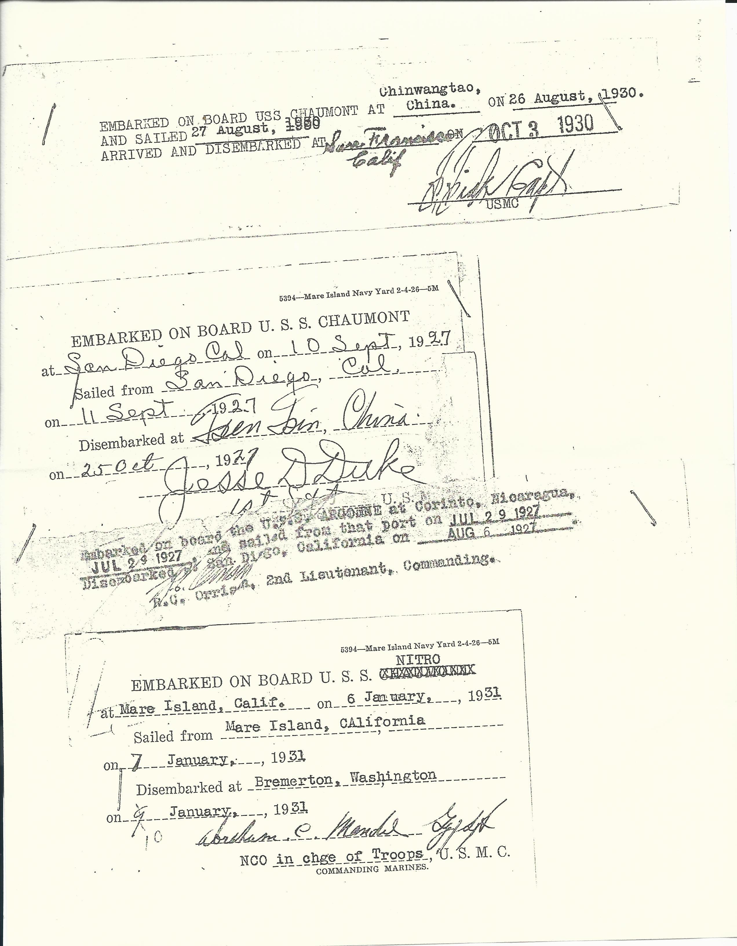 Transferred to the 2nd Co, 6th marines he departed for duty with the marine brigade in Nicaragua on 12 may 1927. Embarking for duty in China in 1928 he was assigned to Headquarters Company, legation guard, Peking, China.