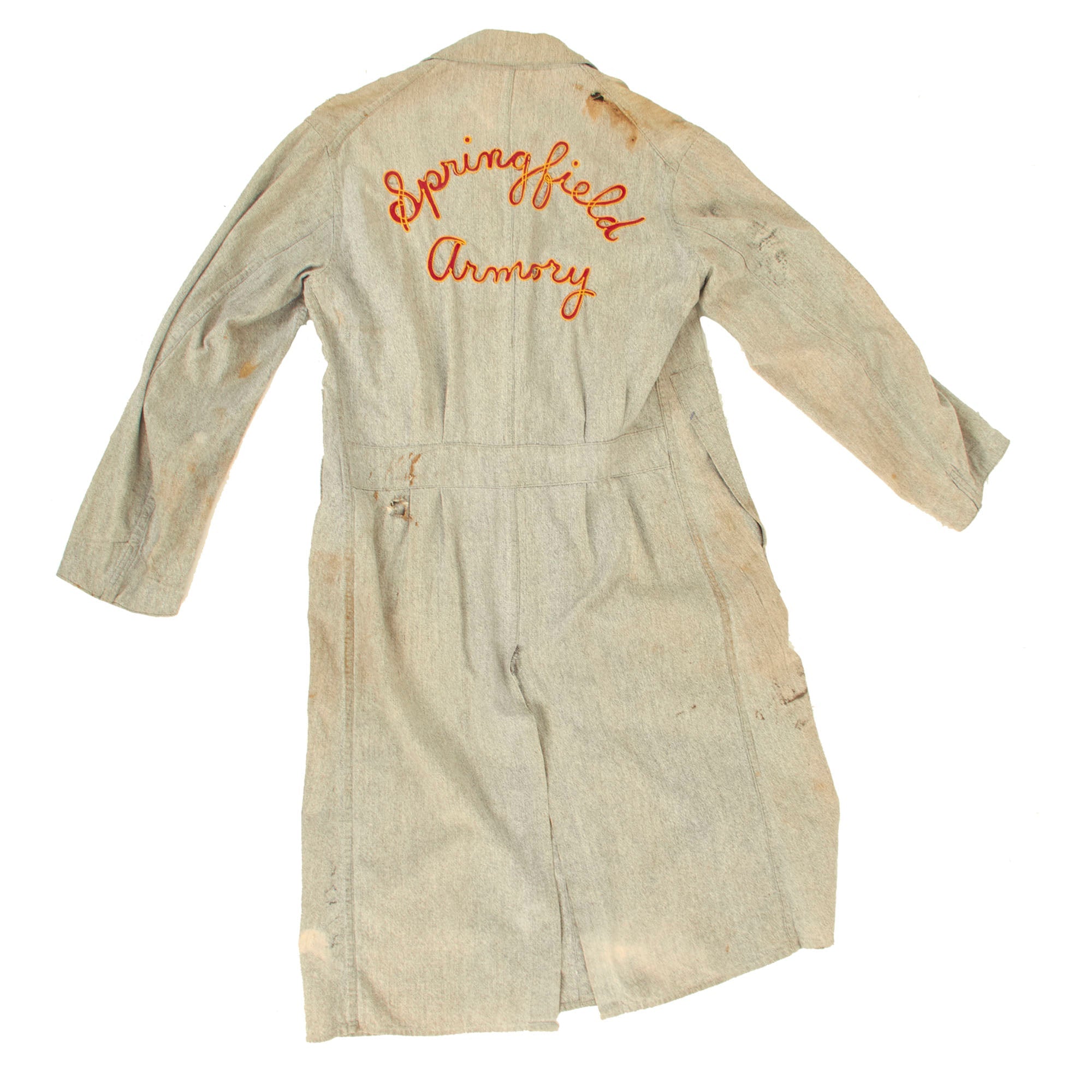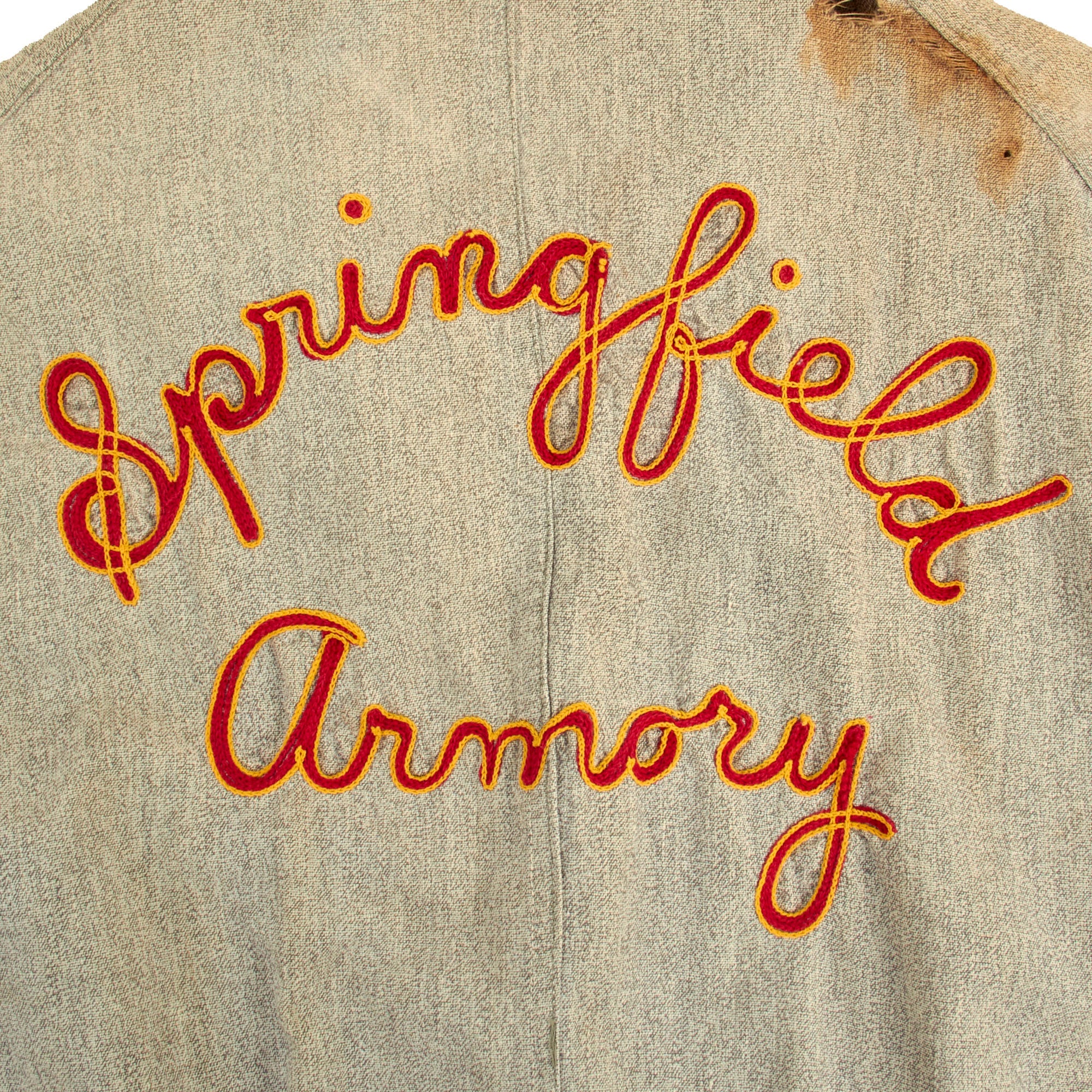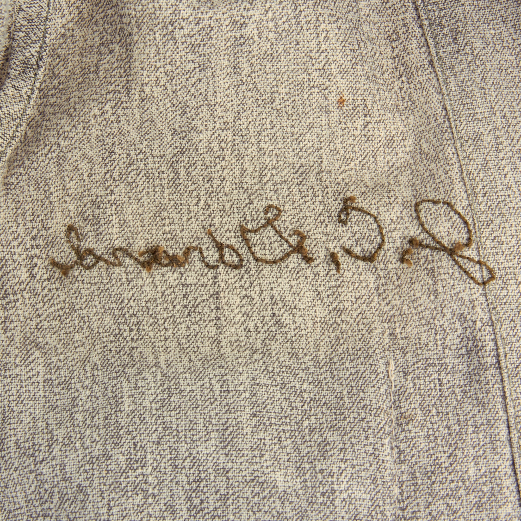 Constructed from 1930s period grey denim, the front left of the coveralls has a lovely red embroidered “Bursting Bomb” insignia just below the name J.C. Garand. The back side of the coveralls spanning from shoulder to shoulder is SPRINGFIELD ARMORY embroidered in red with a yellow border. All of the embroidery work is complete and still easily discernible. Garand's name also appears to be written ink on the interior neck.