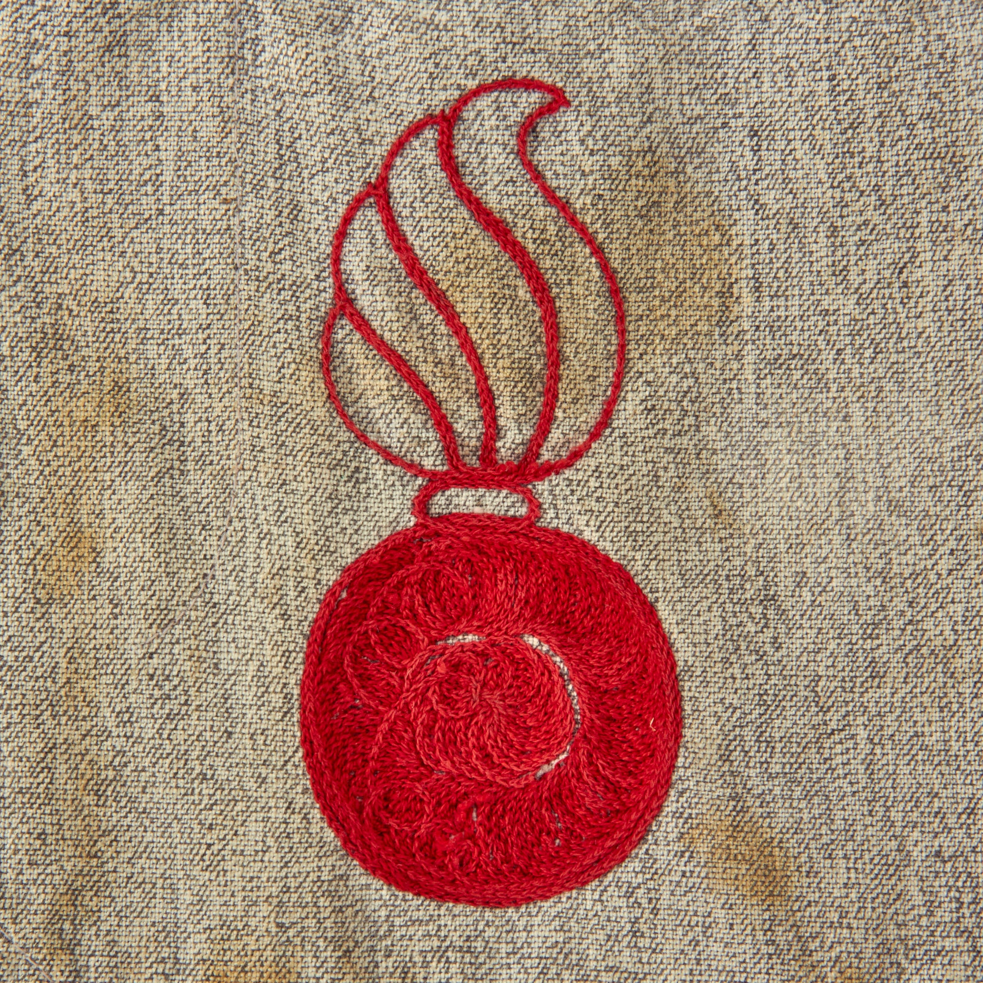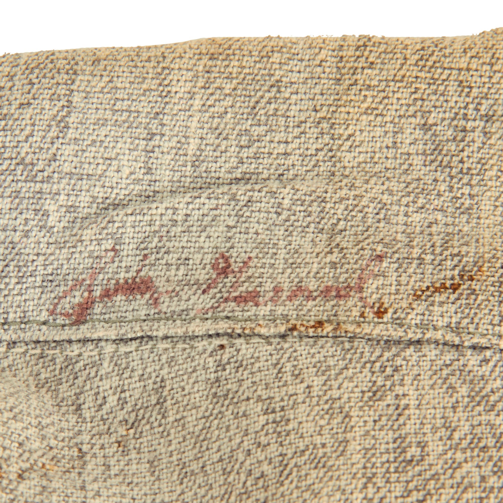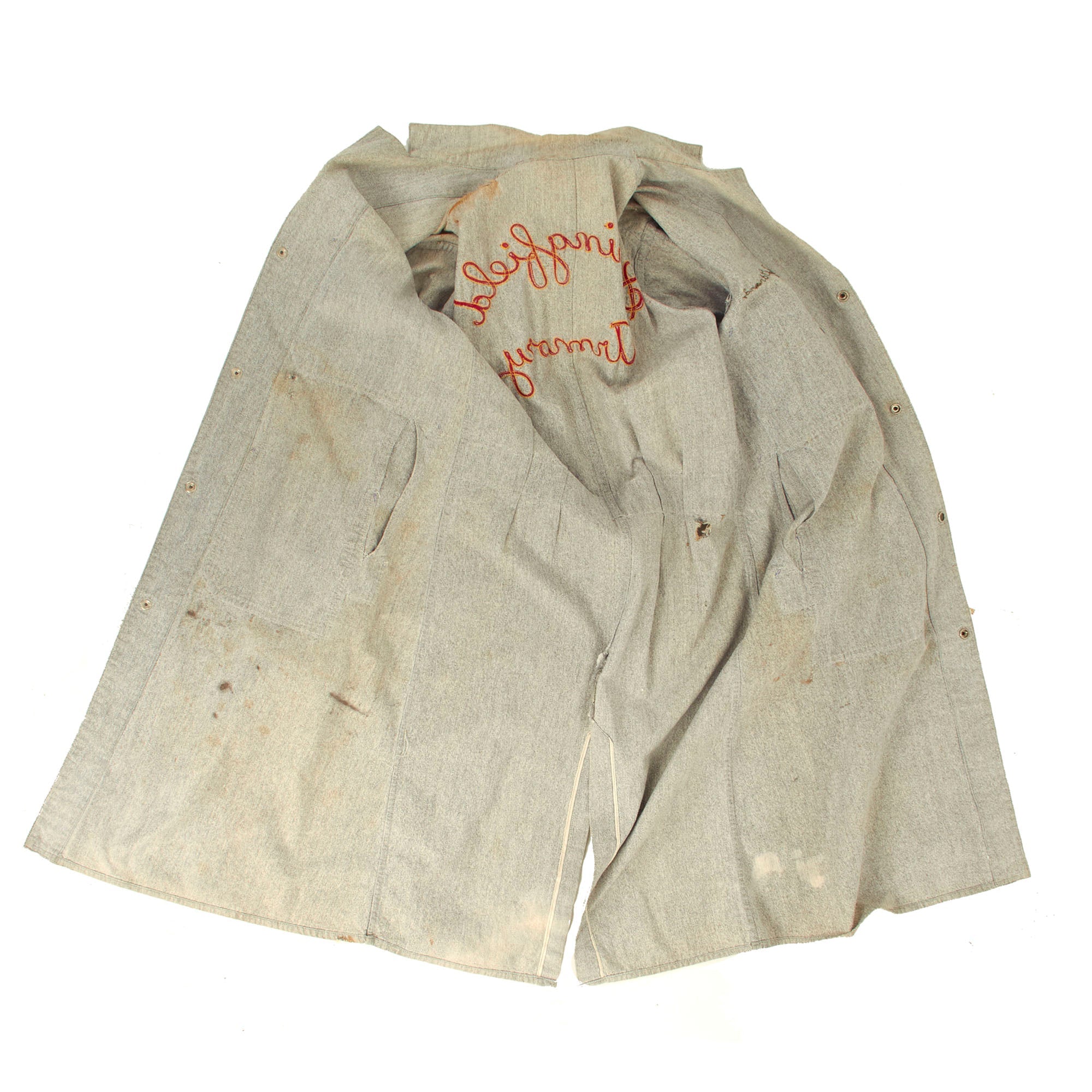 Constructed from 1930s period grey denim, the front left of the coveralls has a lovely red embroidered “Bursting Bomb” insignia just below the name J.C. Garand. The back side of the coveralls spanning from shoulder to shoulder is SPRINGFIELD ARMORY embroidered in red with a yellow border. All of the embroidery work is complete and still easily discernible. Garand's name also appears to be written ink on the interior neck.