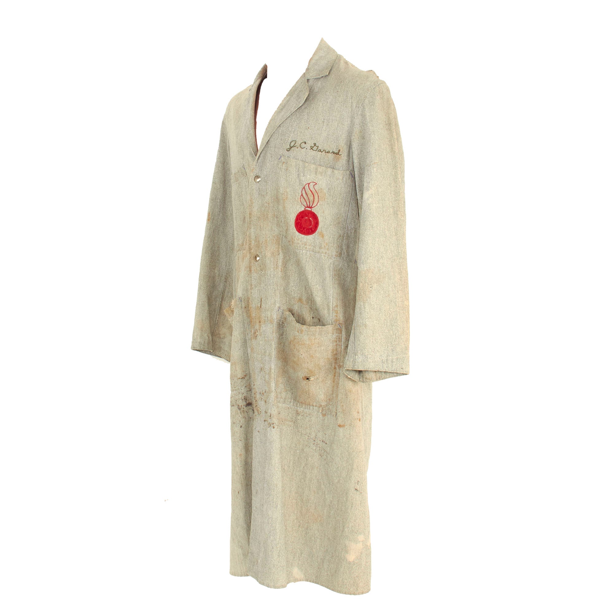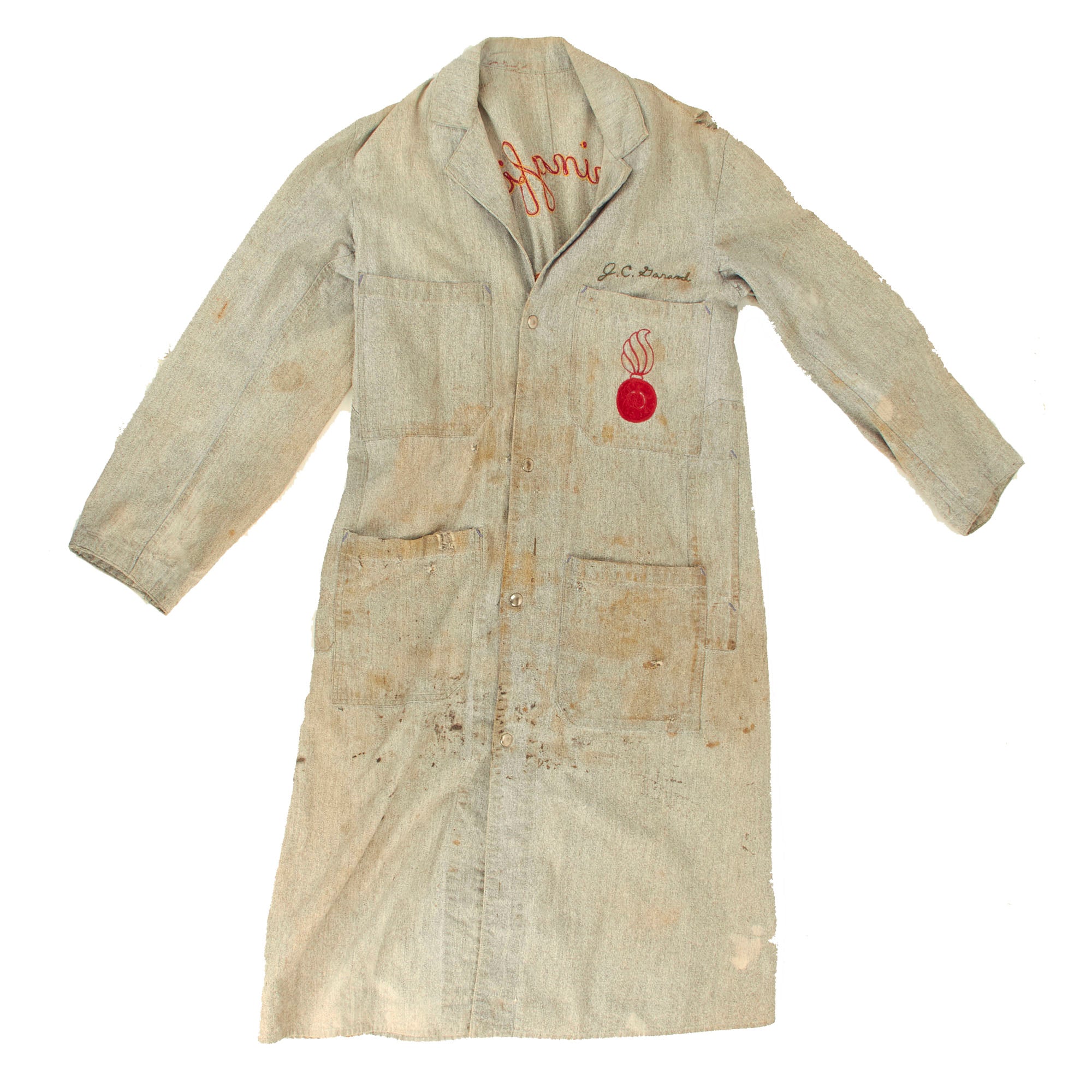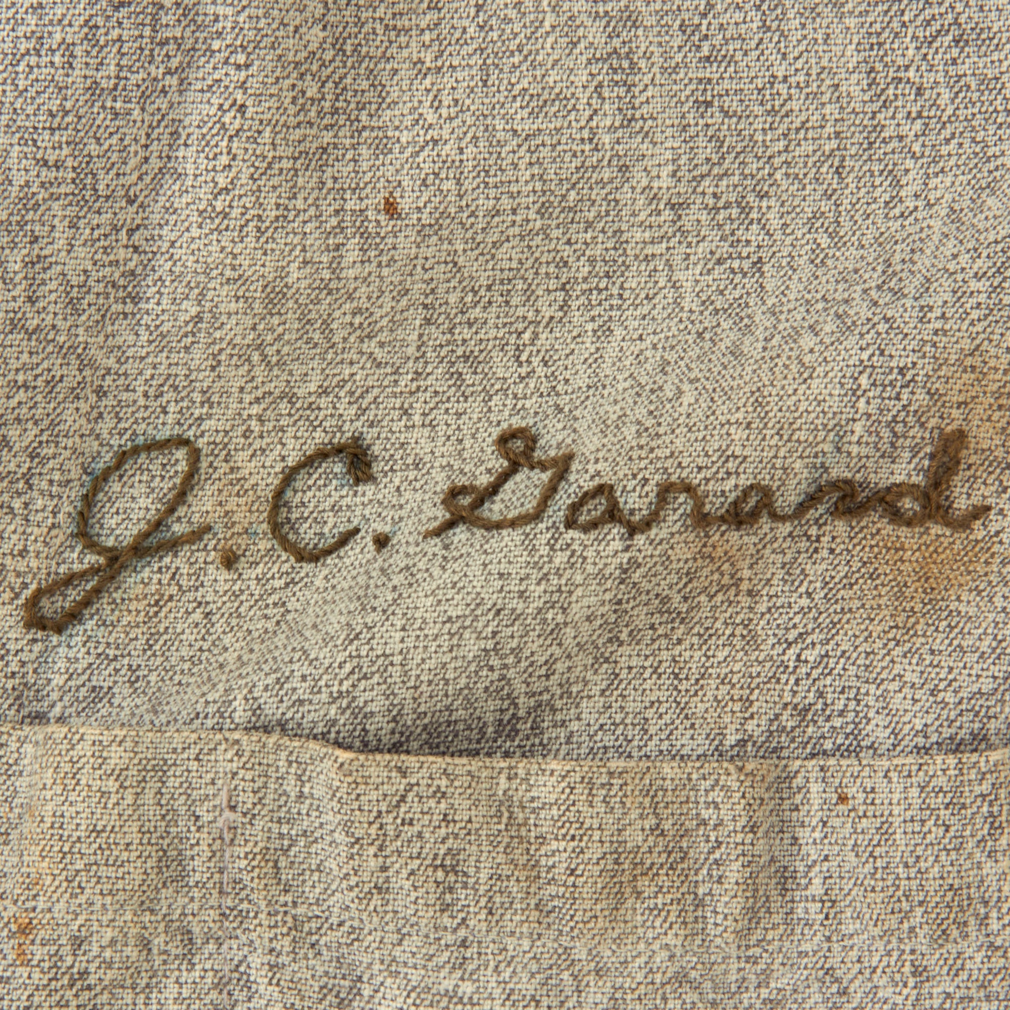 We received the coveralls (smock, shop coat) indirectly from his daughter's, Janice Kay Garand Premont, estate sale. She passed away in 2020 in Galveston, Texas and her obituary can be found at this link. The set of coveralls show extensive wear, use and does have some tearing present but that adds honest beauty to the item, all evidence of him actually wearing these while working. The material is a soft canvas with the appearance of faded denim and does not have any manufacturing labels present.