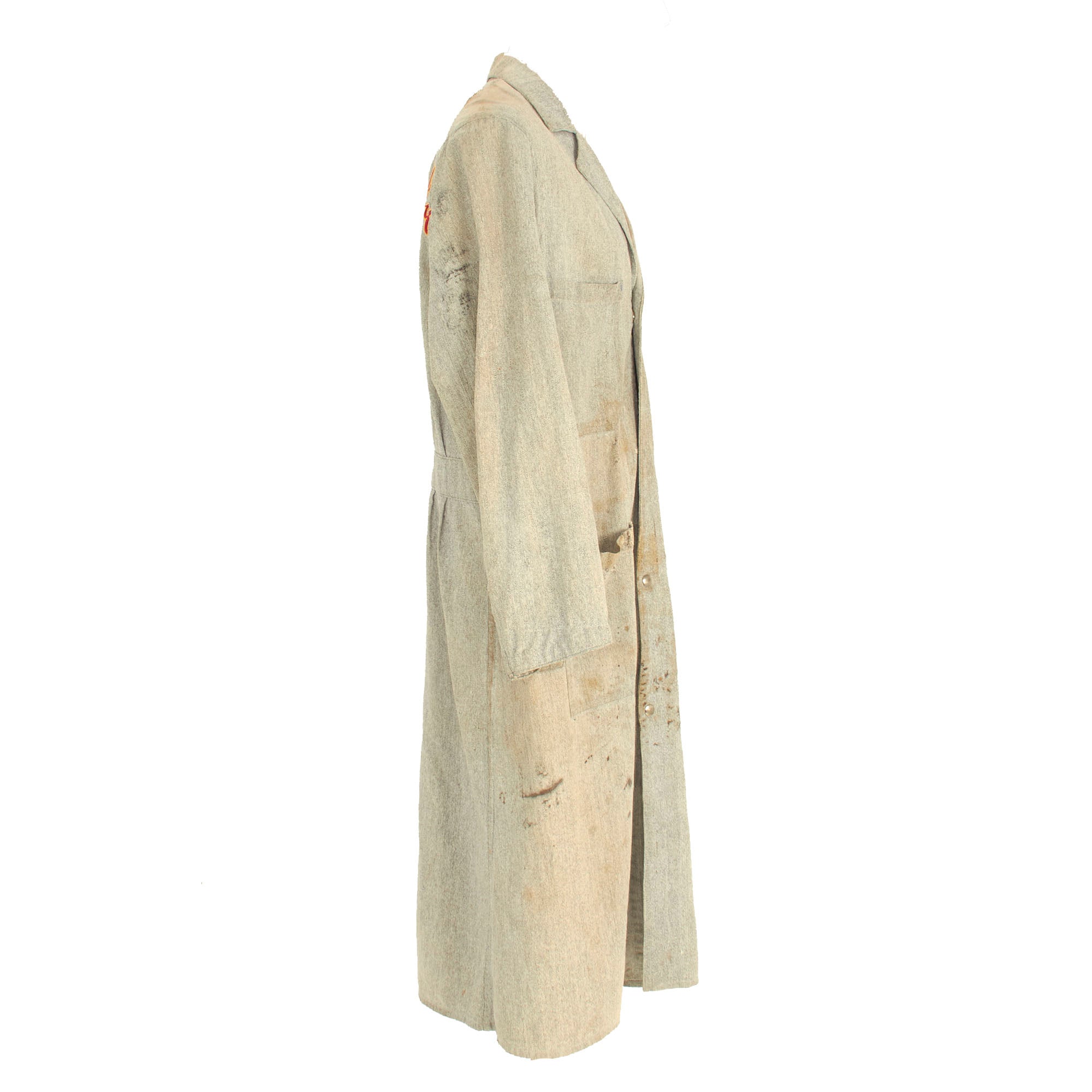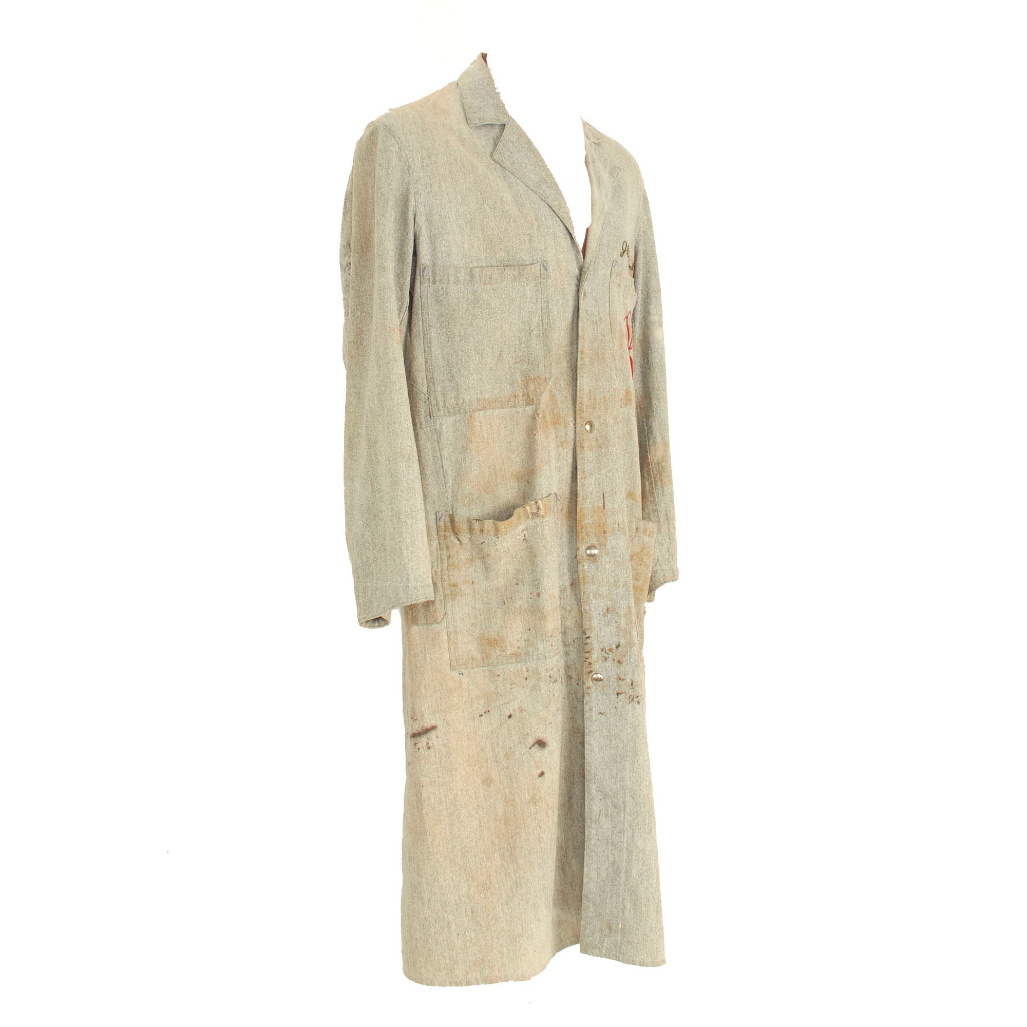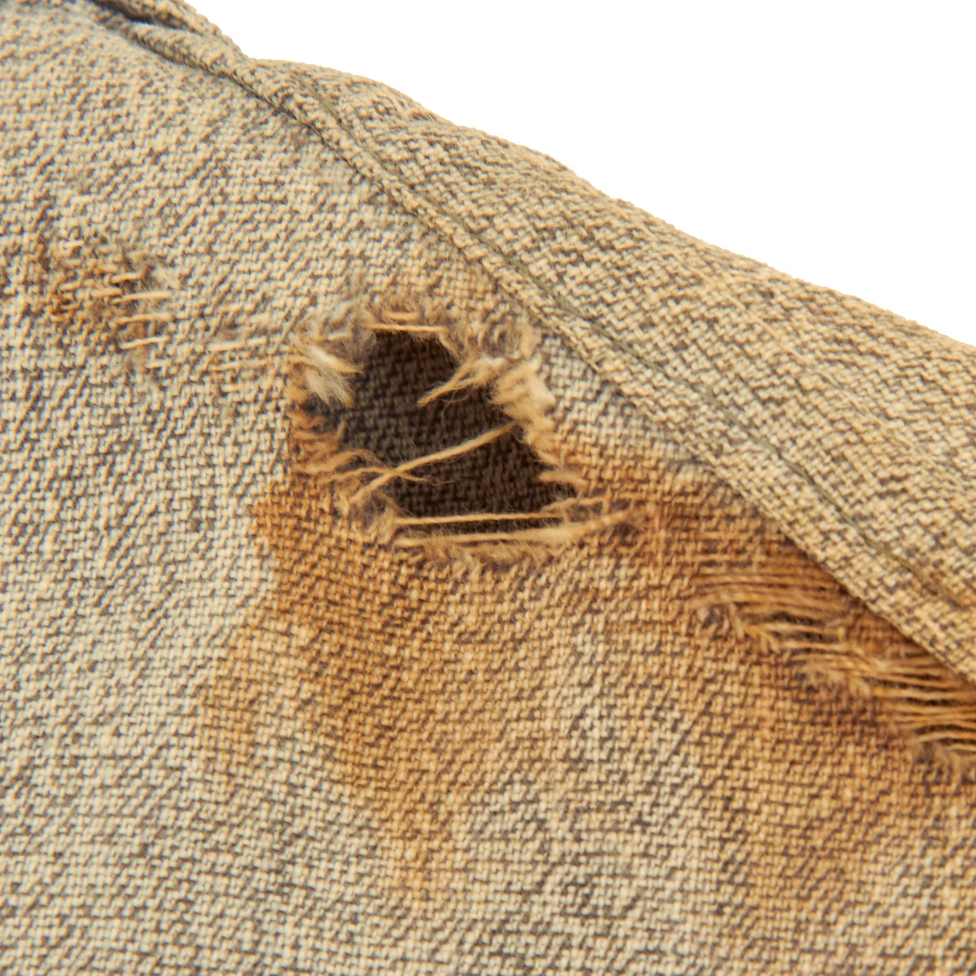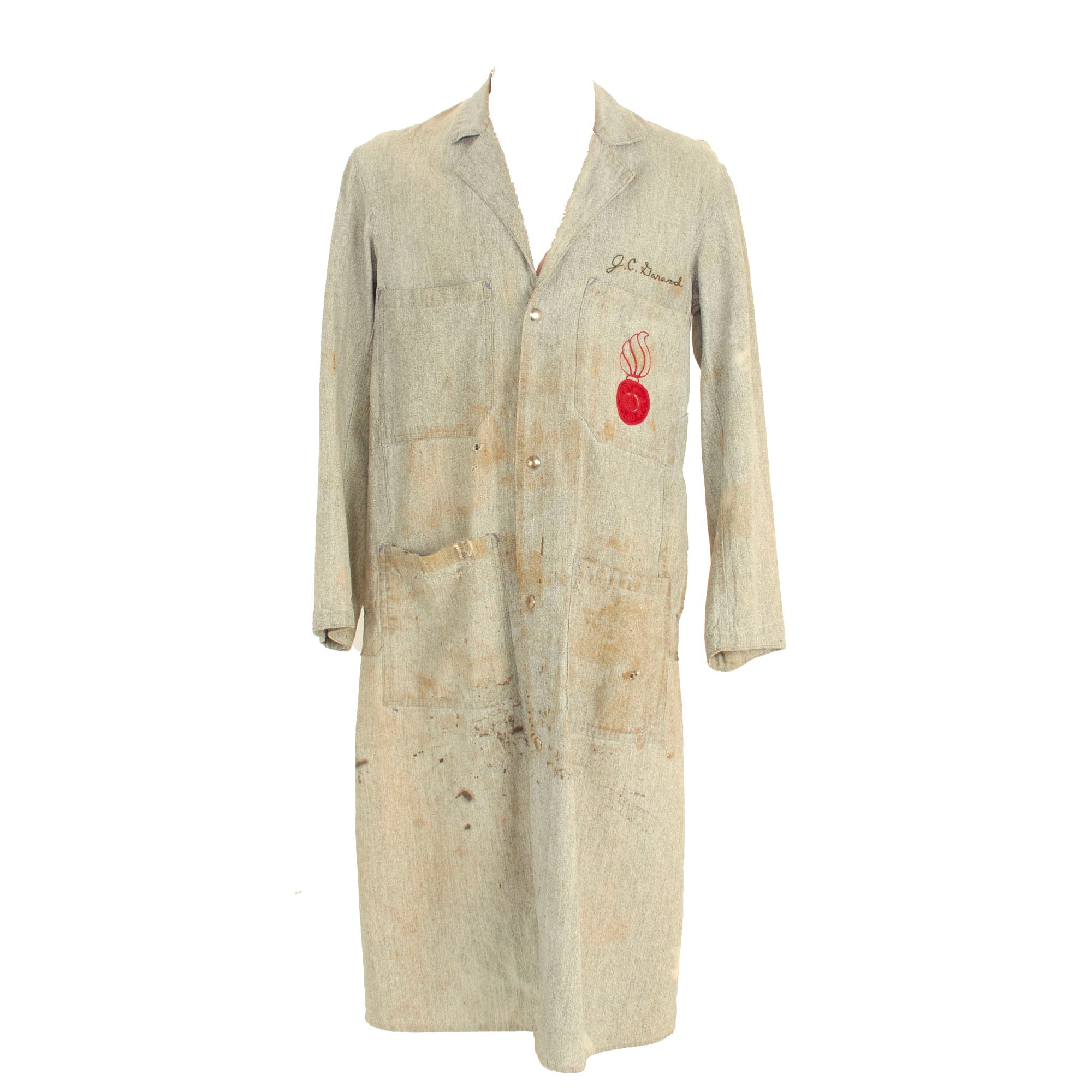 We received the coveralls (smock, shop coat) indirectly from his daughter's, Janice Kay Garand Premont, estate sale. She passed away in 2020 in Galveston, Texas and her obituary can be found at this link. The set of coveralls show extensive wear, use and does have some tearing present but that adds honest beauty to the item, all evidence of him actually wearing these while working. The material is a soft canvas with the appearance of faded denim and does not have any manufacturing labels present.