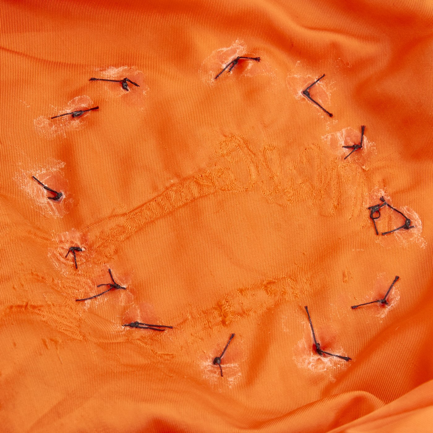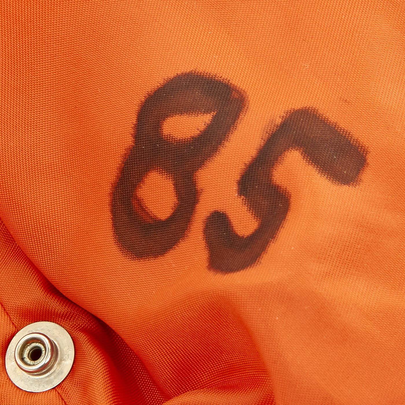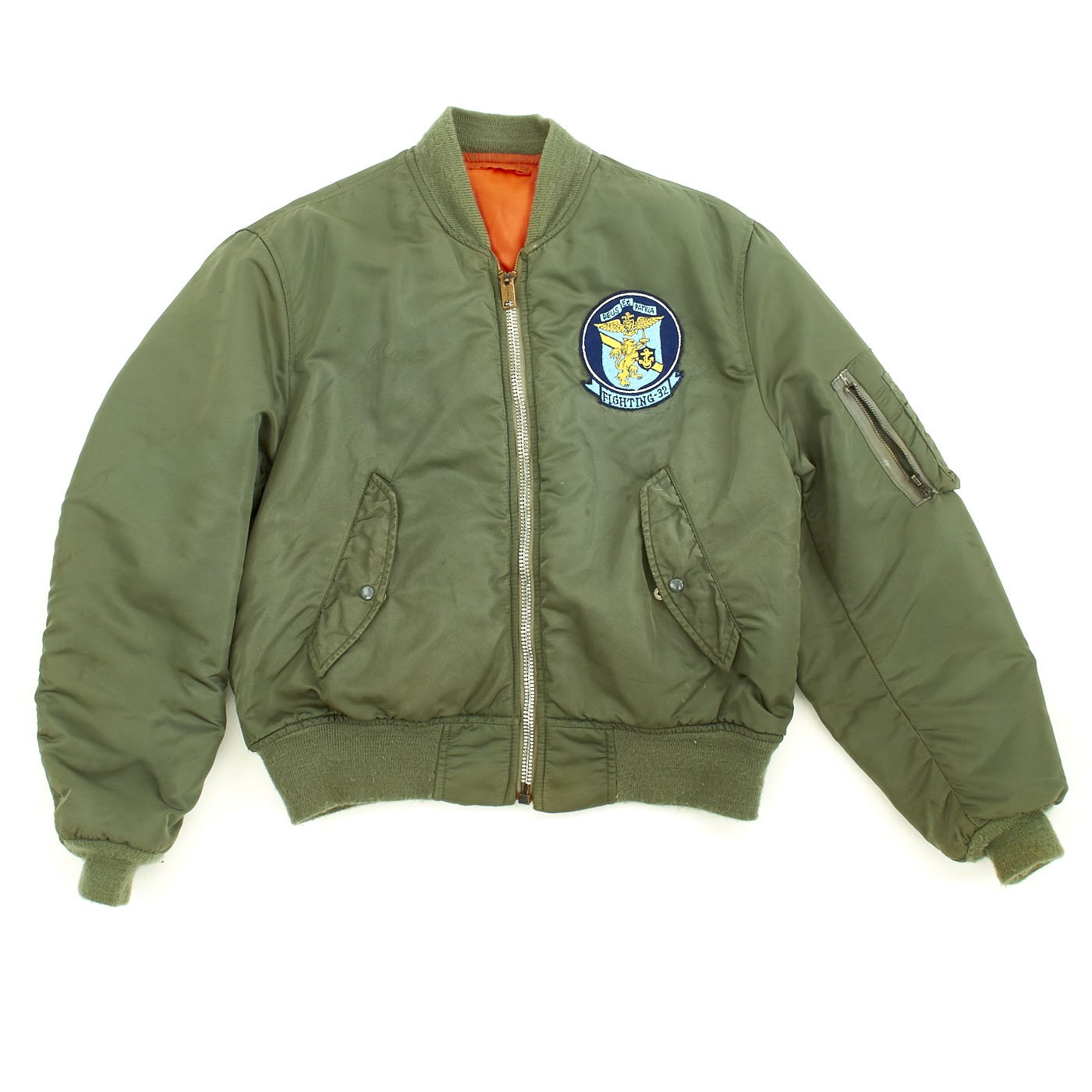This is a very good condition MA-1 flight jacket that features an embroidered 1970s era VF-32 "Fighting Swordsmen" insignia patch sewn to the left chest. There also appears to at one time have been the name Joe on the right chest. It has some slight wear to the lower elastic band, but is overall sound, with no major damage or other issues. The zippers all function, and the size is a U.S. 44, as indicated by a small faded label in the left exterior pocket. This pocket also still has the complete manufacturers label, indicating it is a JACKET, FLYER'S MAN INTERMEDIATE, MA-1, made by I. SPIEWAK & SONS, INC.. The number 85 is also written into the inside of all the main pockets.
