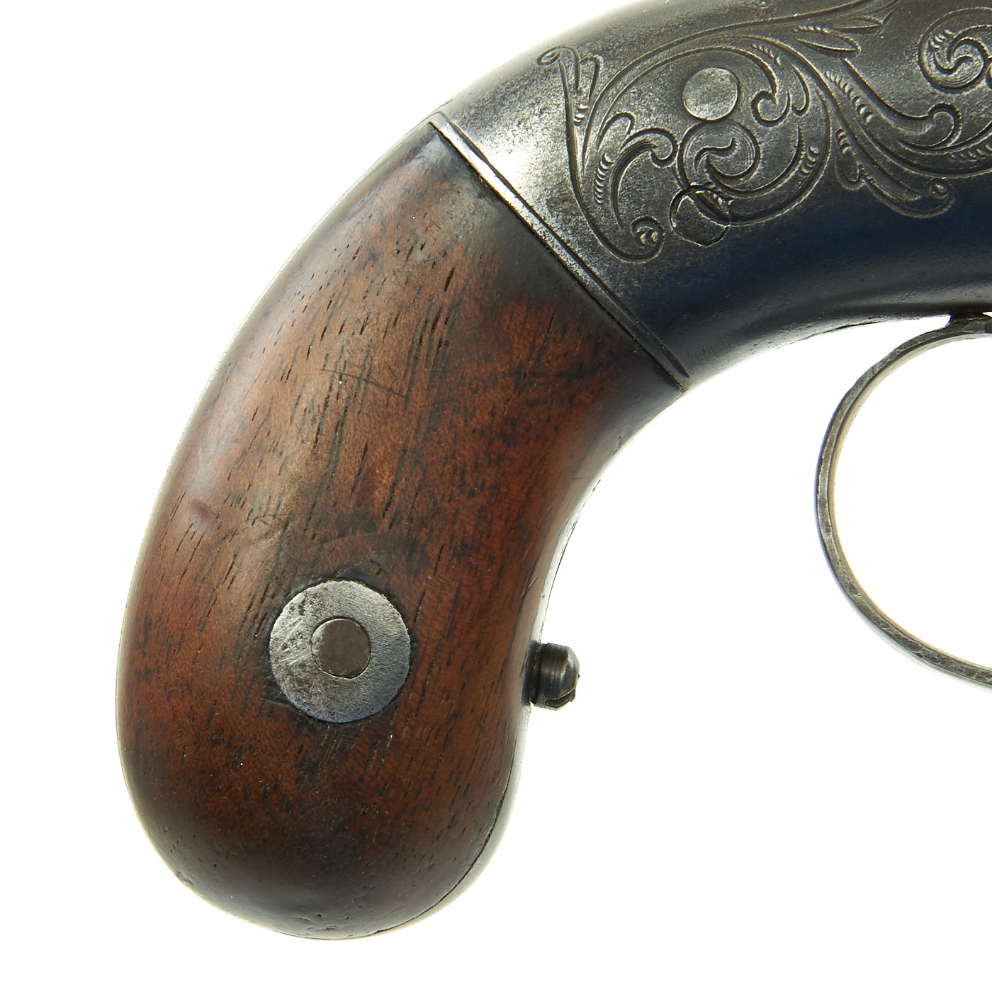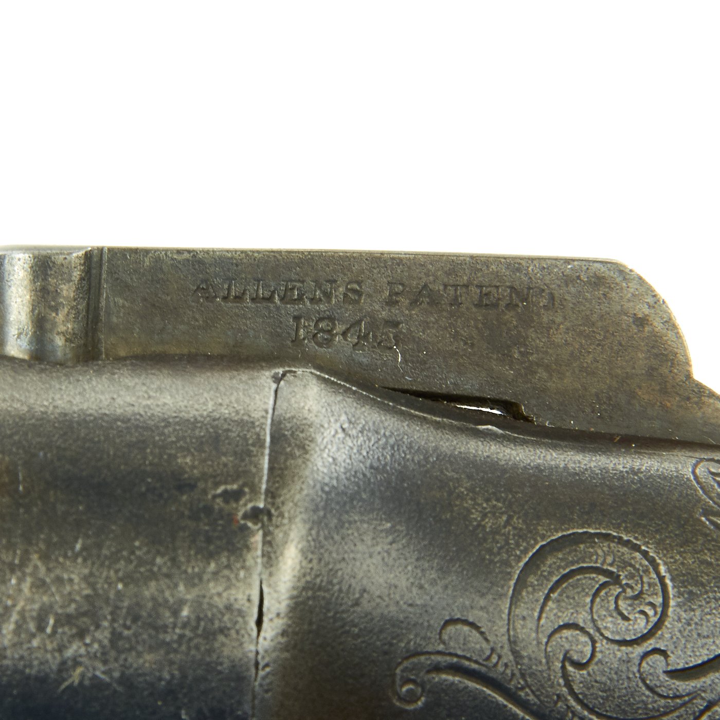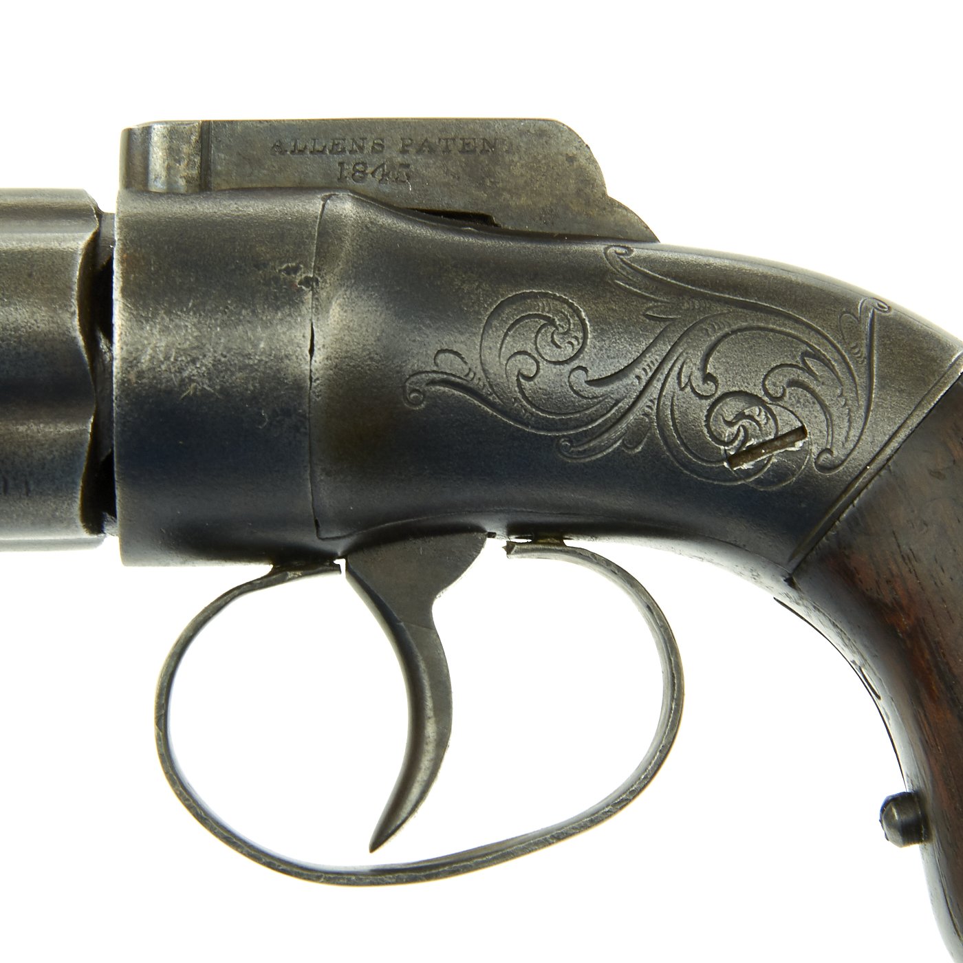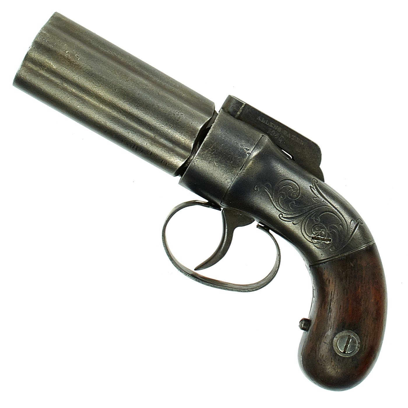 Original Item: Only One Available. Pepperbox revolvers were so named because of the similarity of the front view of the weapon was so reminiscent of a Pepper Pot of the time being a circle of round holes. This example was made by Ethan Allen of Massachusetts (1808-1871). Allen developed his Gun business by taking his brother-in-law Charles Thurber as his partner, and they moved the plant to Worcester, Mass. Ethan Allen, no relation to the Revolutionary Ethan Allen, applied for various patents, most notably early on for a "TUBE HAMMER" ignition system in 1837, which was renewed in 1845.