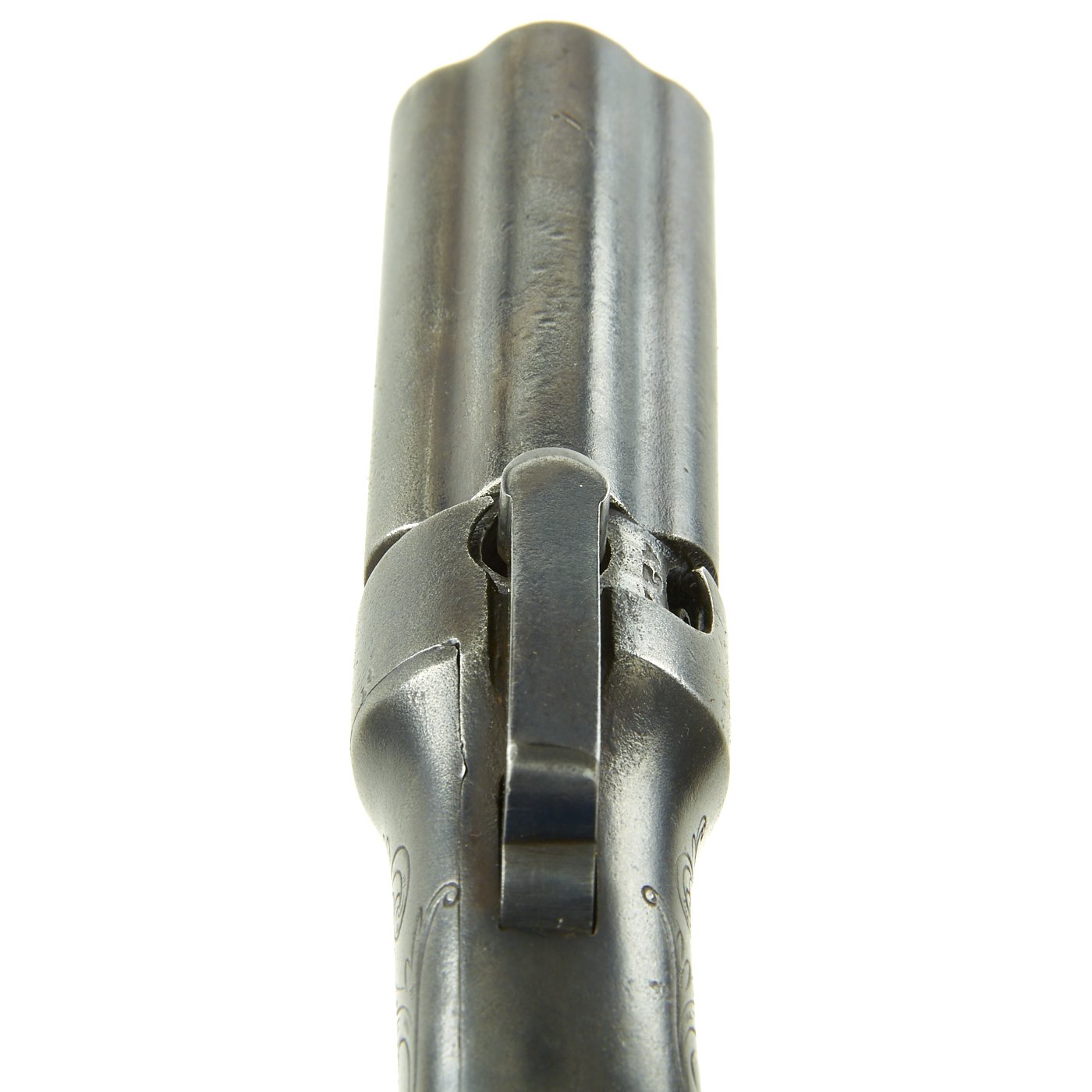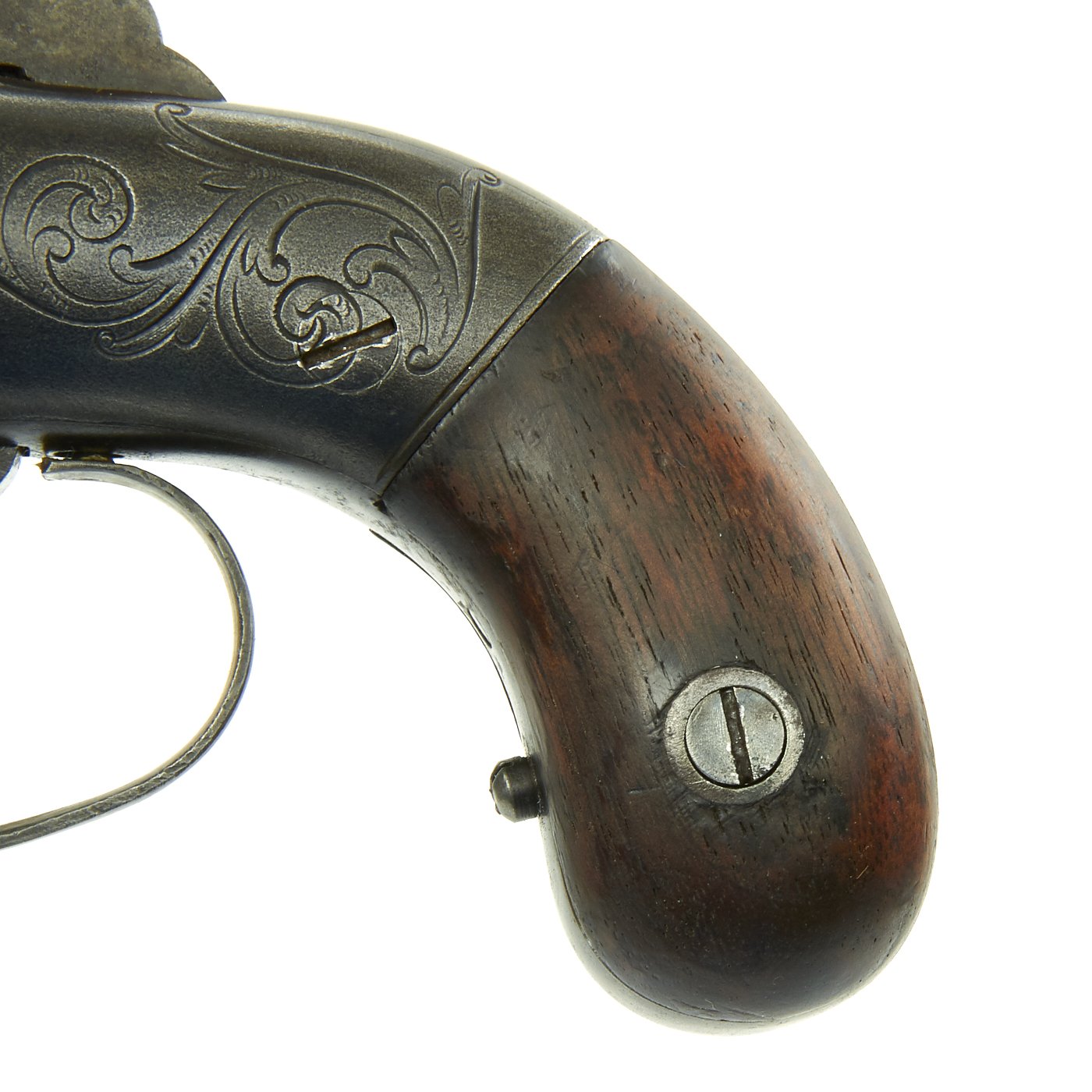 This is the type exhibited on our Pepperbox Revolver offered here. The weapon is Five Shot in approximately .32 caliber measuring 6 1/4" overall with 2 1/2" barrels. Removal of the grips shows that serial number 424 is stamped on both grip scales, the mainspring, and grip frame, which matches the serial number stamped onto the cylinder. This is definitely an "all matching" example, and hasn't been messed with. The frame has some very nice decorative engraving on the sideplates of the action, and the tube hammer is stamped: