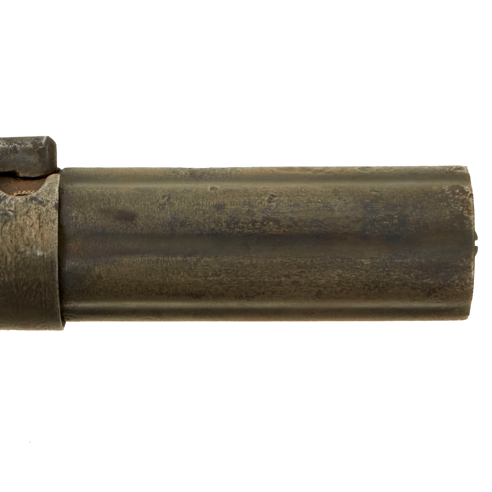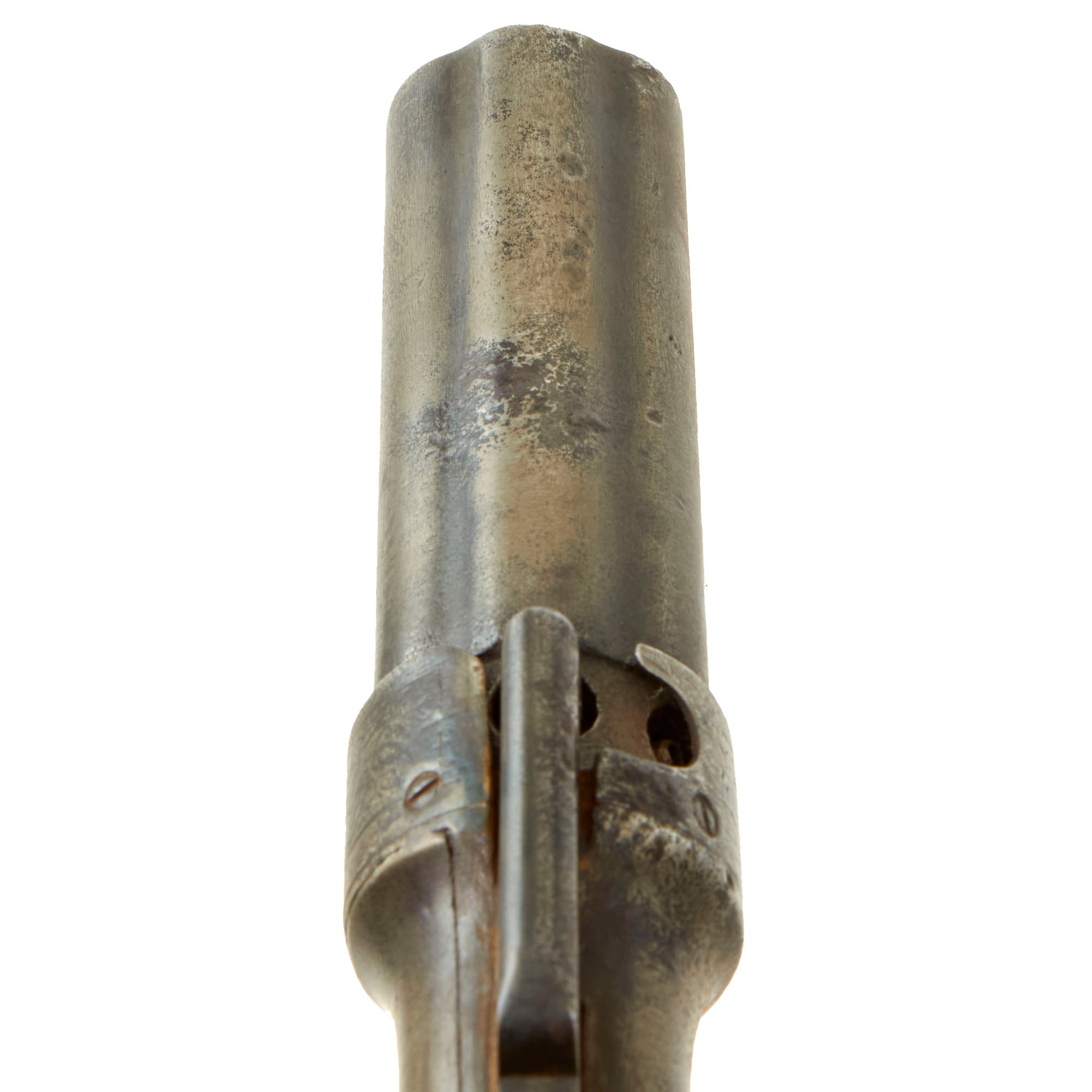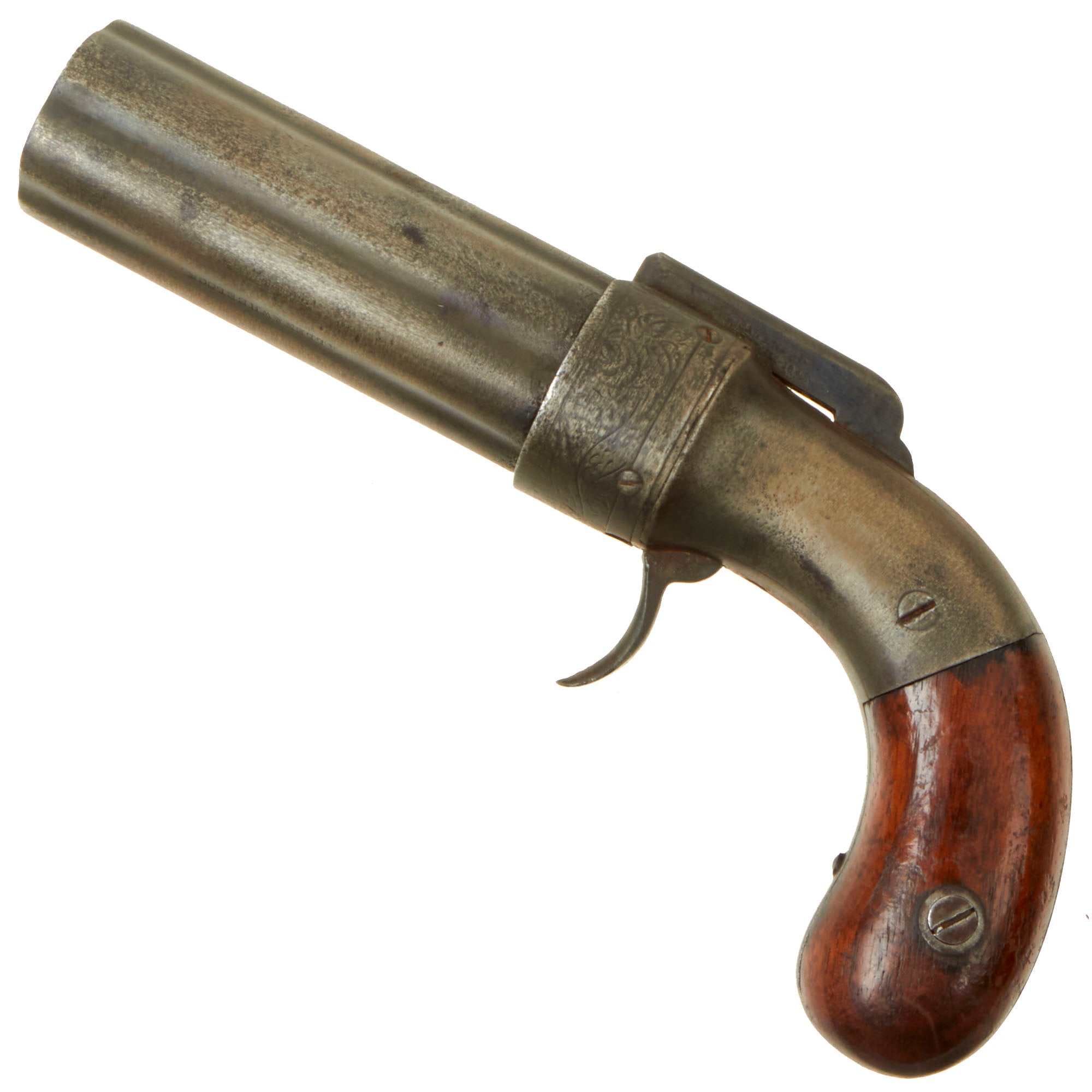The Pepperbox is in very good used condition, with a lovely patina of age, fully operational as best we can tell, but NOT sold for firing. The action functions correctly, with a good cylinder lockup and a crisp dry fire, and accurate indexing. The metalwork overall shows a polished steel patina, with traces of past peppering that has been cleaned away. This example does not look to have had engraving on the frame, just on the flash guard, which is now relatively worn. The walnut grips are in very good condition, still retaining a lot of the original "piano varnish" finish.