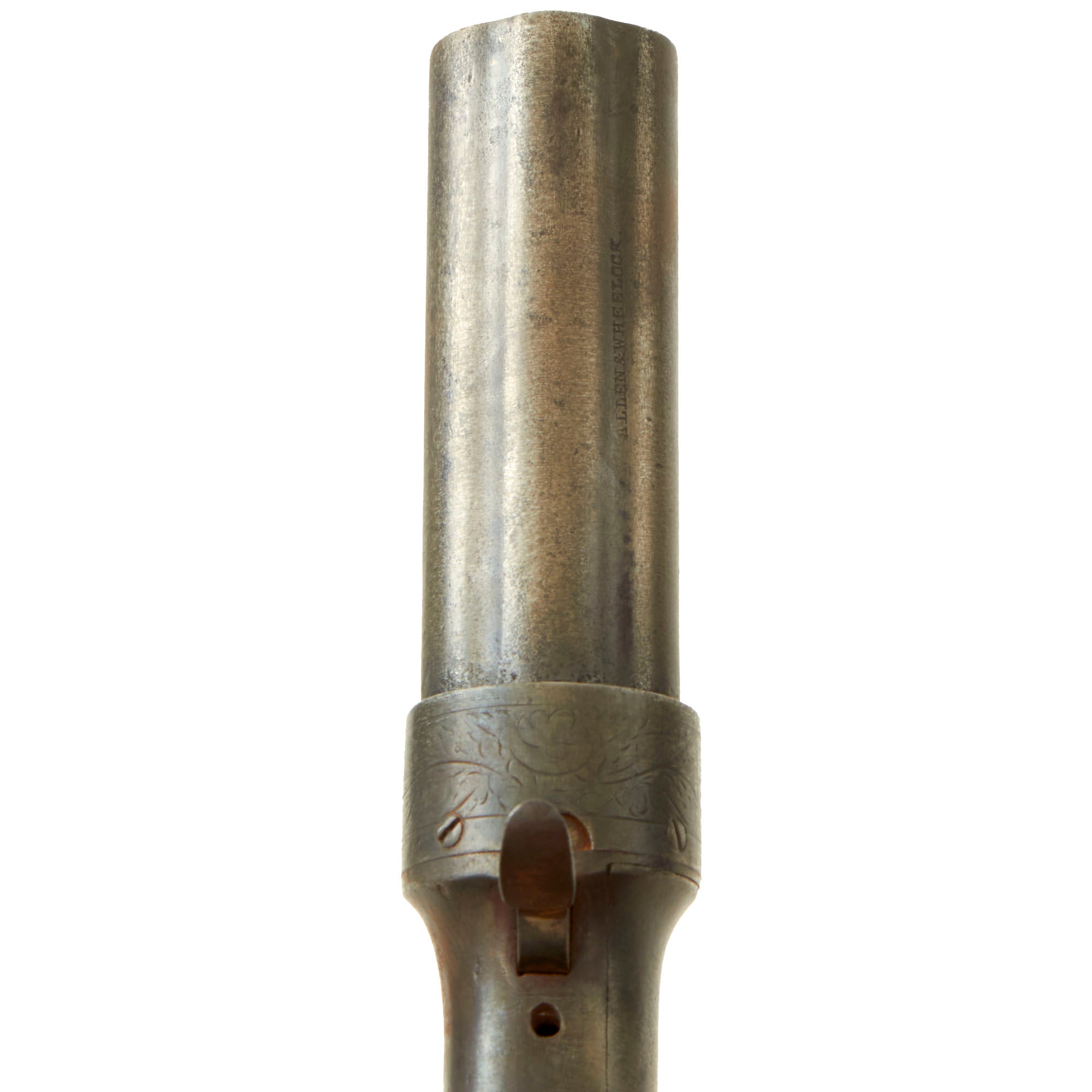The company was known by various names over the years. From 1856 to 1865 it was known as Allen & Wheelock (Worcester), so this pistol is from that period, after the patent renewal was granted. The relatively high serial number and reduced markings suggest later production, so this was probably made about 1862-1863, during the U.S. Civil War.