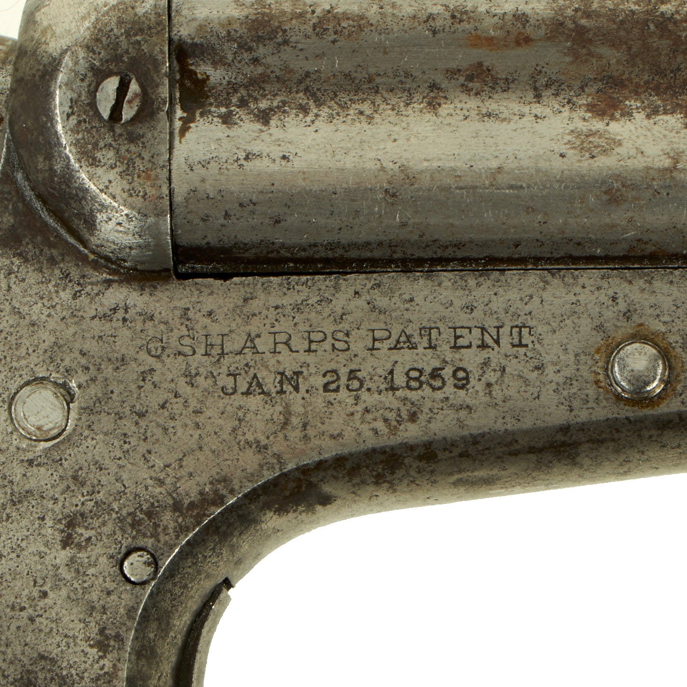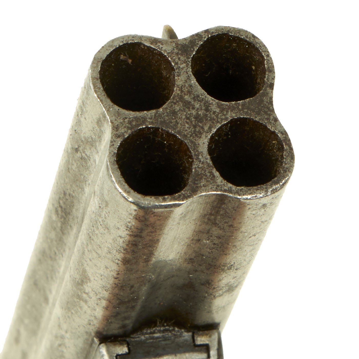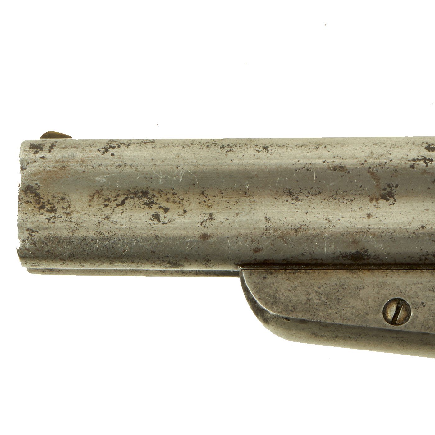 Overall metal finish is still quite nice, with a lovely patina of age. Cleaning and polishing has worn off the original finish, so now the entire pistol is a nice bright steel, with some traces of past oxidation. The flat bottom grip is very nice, with both gutta percha grip scales retaining their checkering well. They are just a bit loose due to shrinkage. The rotating internal firing pin works well on this example, and the action works great. The bores on the barrels are all clear, and do show lands and grooves, though there are also areas of oxidation and pitting.