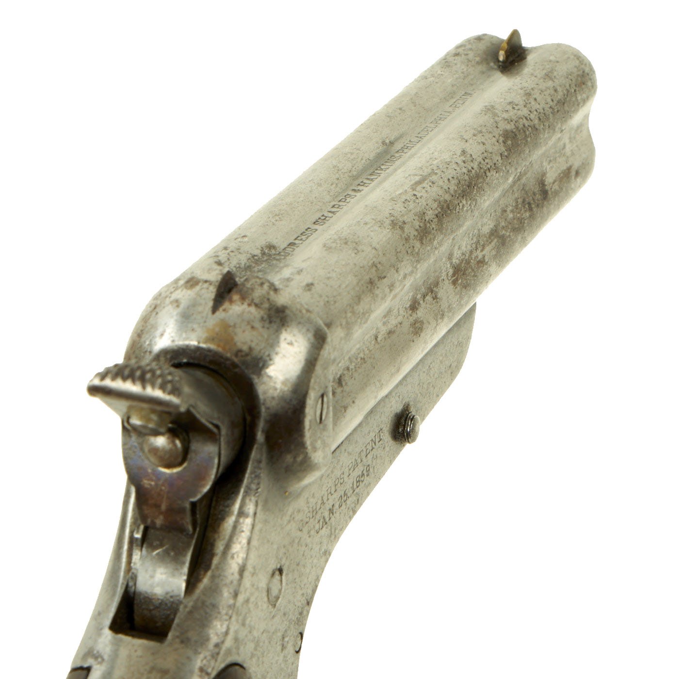 The barrel easily removed by pulling down the button on the left side of the frame and sliding the barrel off forwards for reloading, which also ejects the spent cartridges. The hammer must be in the half-cock position for the barrels to unlock and slide forward. The underside of the barrel is marked with serial number 1080 on the dovetail, which is also marked on the bottom of the grip. This is a all-matching example of the rare Sharps & Hankins Model 3A Pistol, a predecessor to the later Sharps 4A "Bulldog".