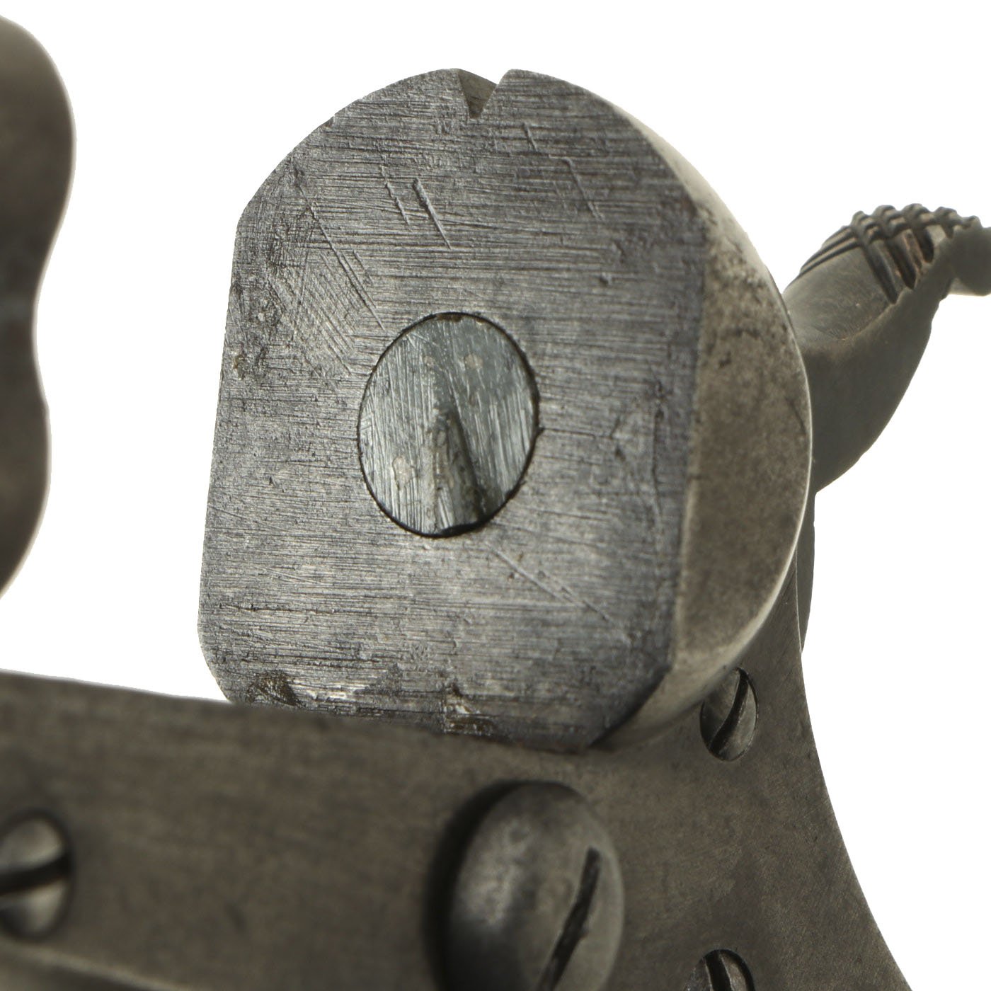Overall metal finish is still quite nice, with a lovely patina of age. The bright iron frame and blued barrel are now mostly faded to a grayish patina. The flat bottom grip is very nice, with two lovely checkered "gutta percha" grip scales that look great. The rotating internal firing pin works well on this example, and the action works great. The bores on the barrels are all clear, and still have clear lands and grooves, with partly bright finishes.