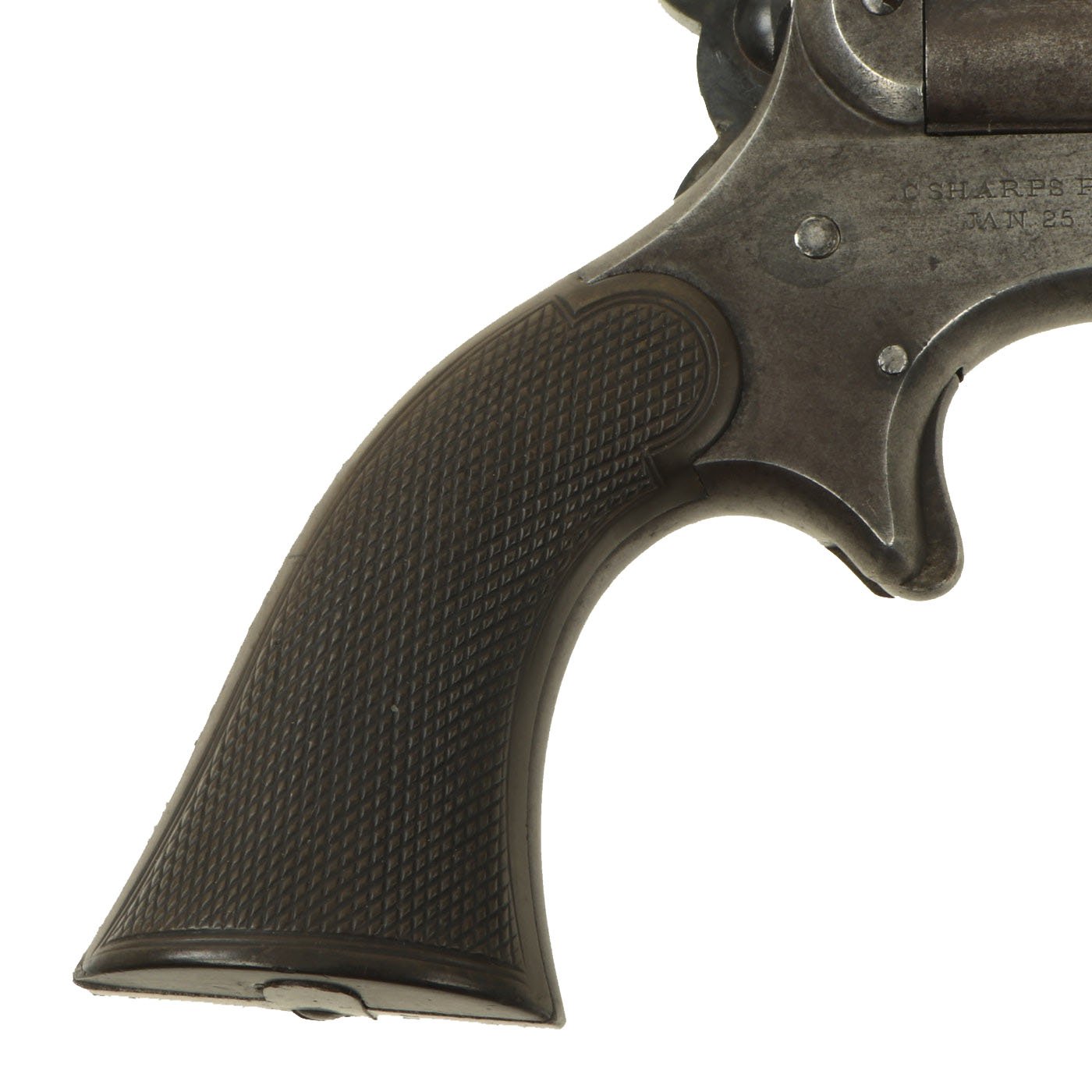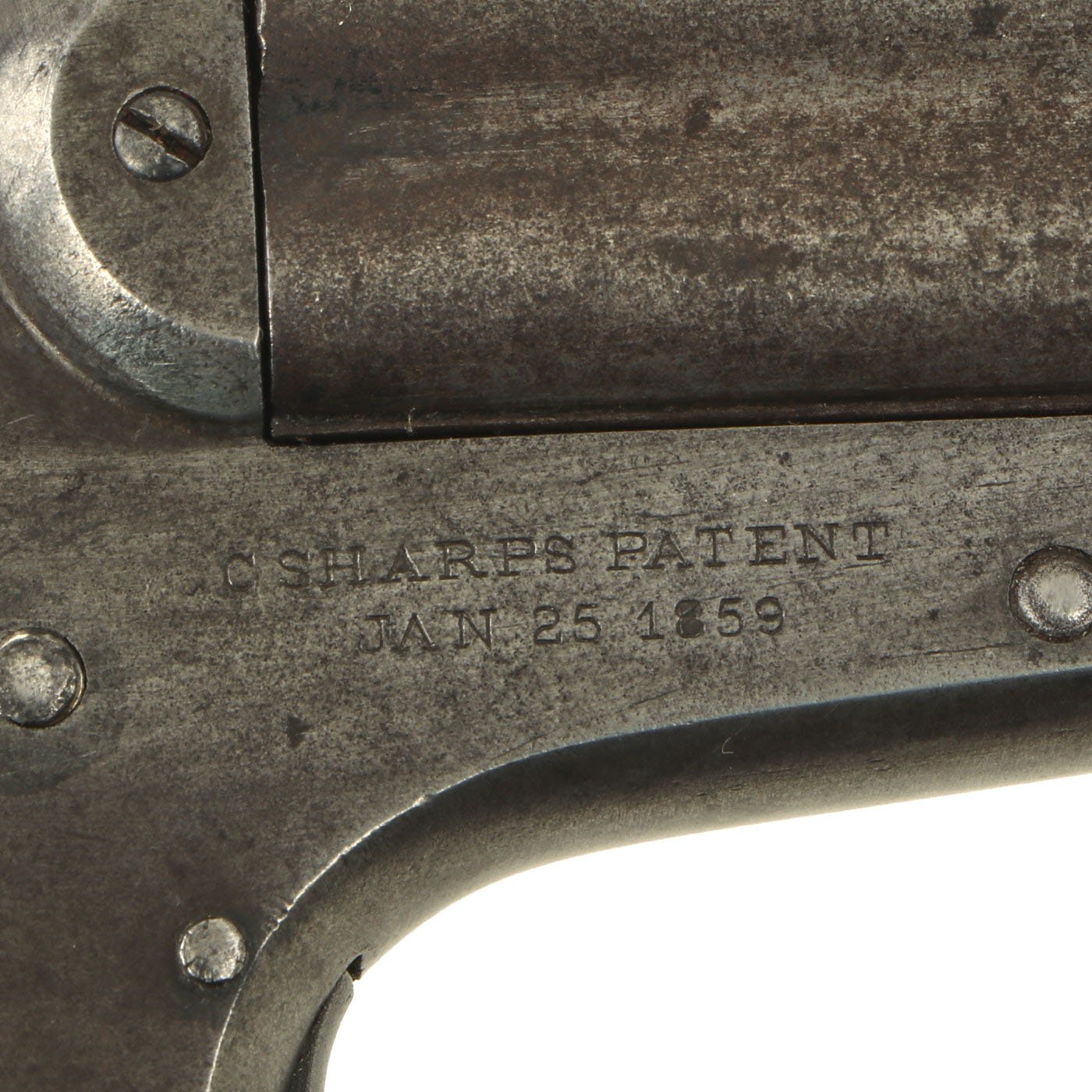 The barrel easily removed by pulling down the button on the left side of the frame and sliding the barrel off forwards for reloading, which also ejects the spent cartridges. The hammer must be in the half-cock position for the barrels to unlock and slide forward. The underside of the barrel is marked with serial number 3236 on the dovetail, which is also marked on the bottom of the grip. This is a all-matching example of the rare Sharps & Hankins Model 3C Pistol, a predecessor to the later Sharps 4A "Bulldog".