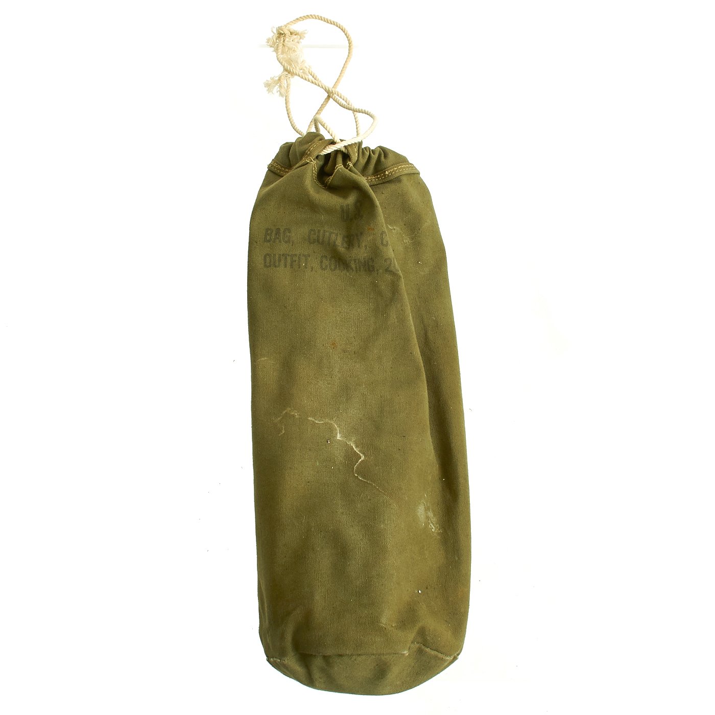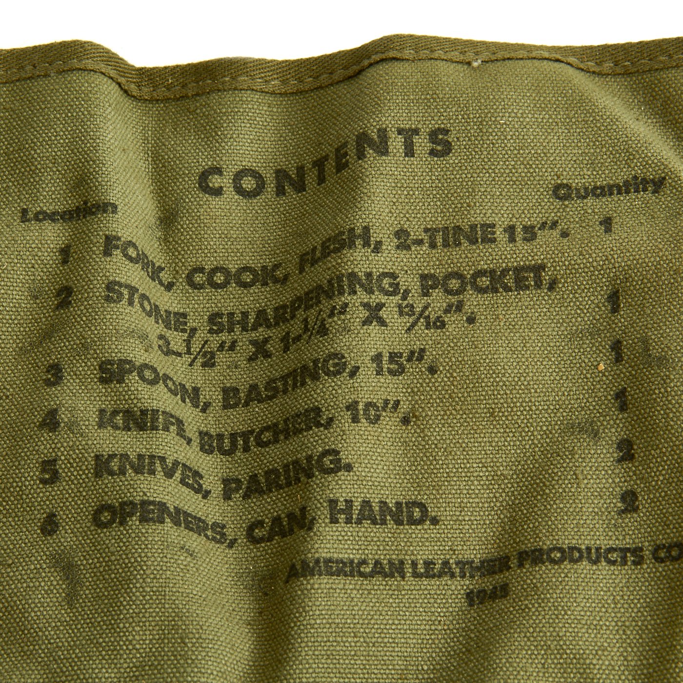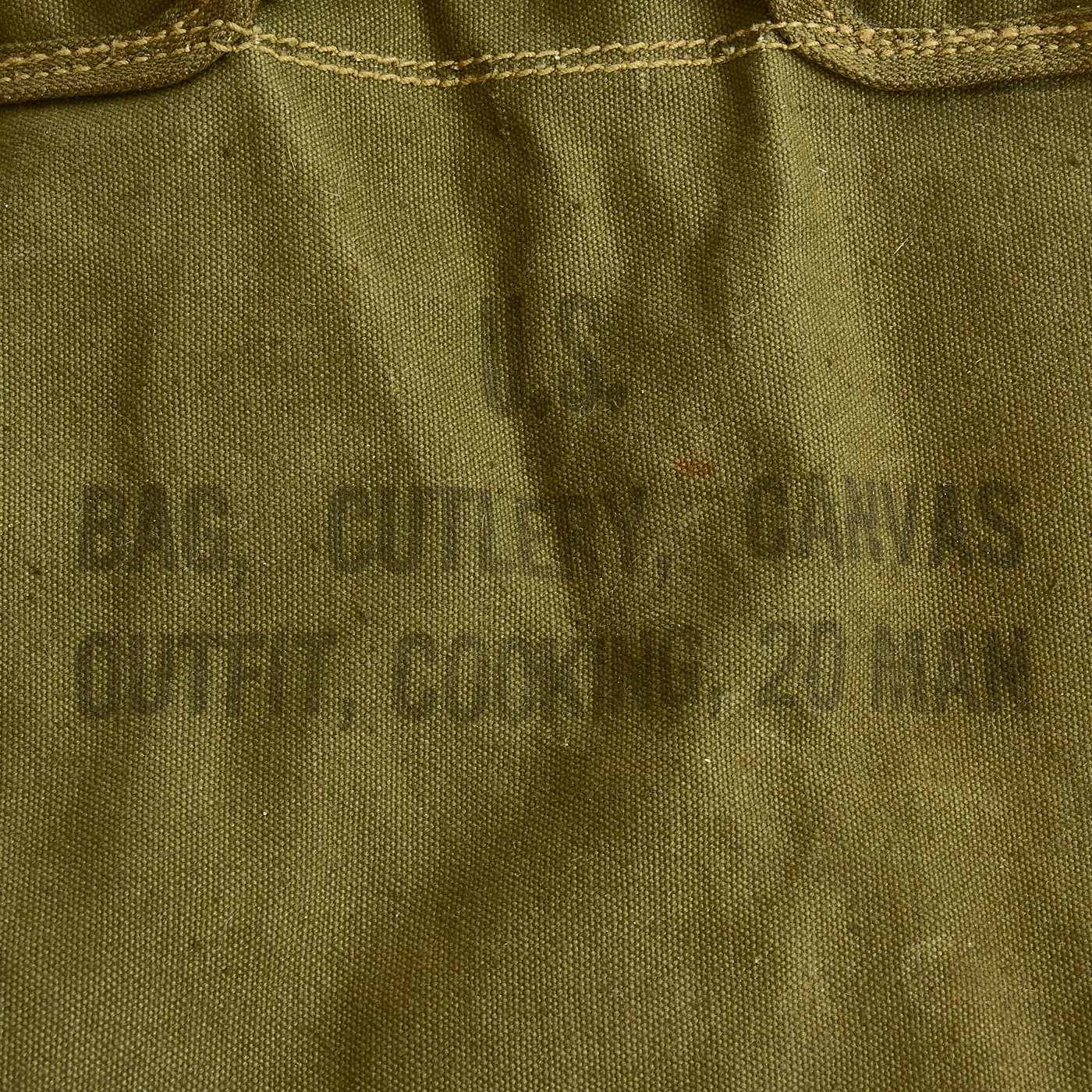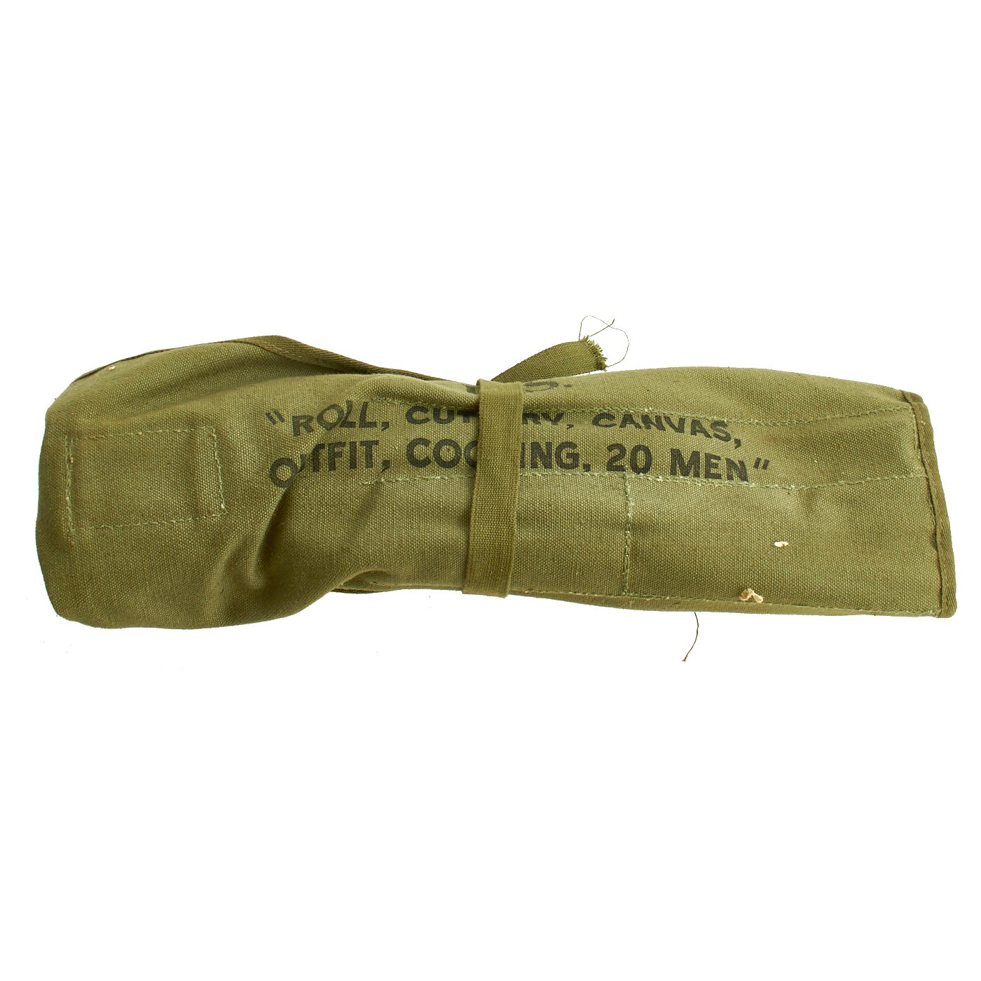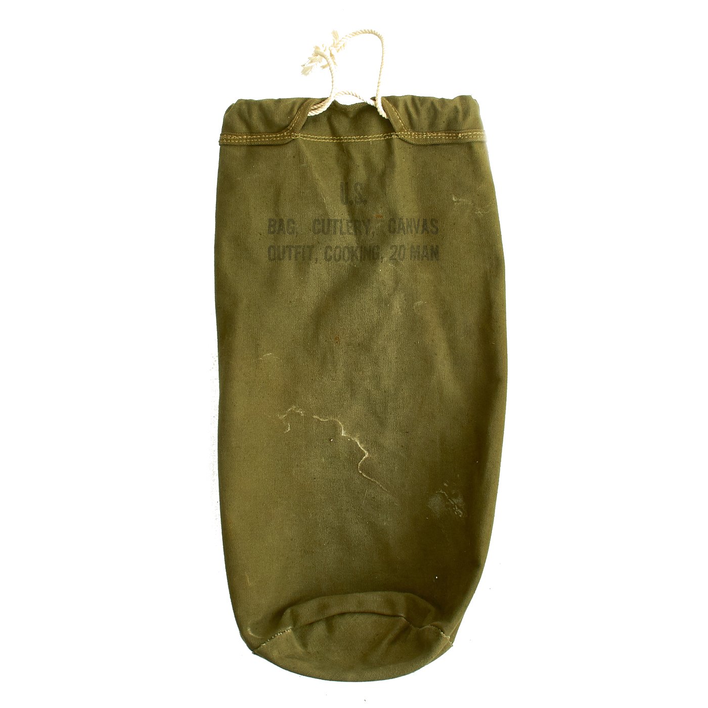 Original Item: Only One Available. This is a United States Army WWII 1945 Dated 20 man cutlery set. The set consists of a canvas bag, large label, large spatulas and inside a canvas wool that reads: "Roll, Cutlery Canvas, Outfit, Cooking, 20 Men"