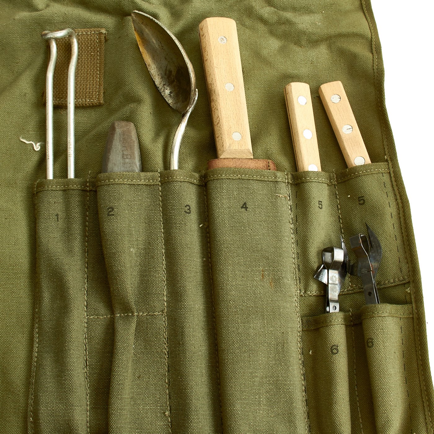On the inside of the roll are pocket and each pocket has a number printed on it and a contents list is listed at the top. This kit is complete. All the items are original. The kit includes: