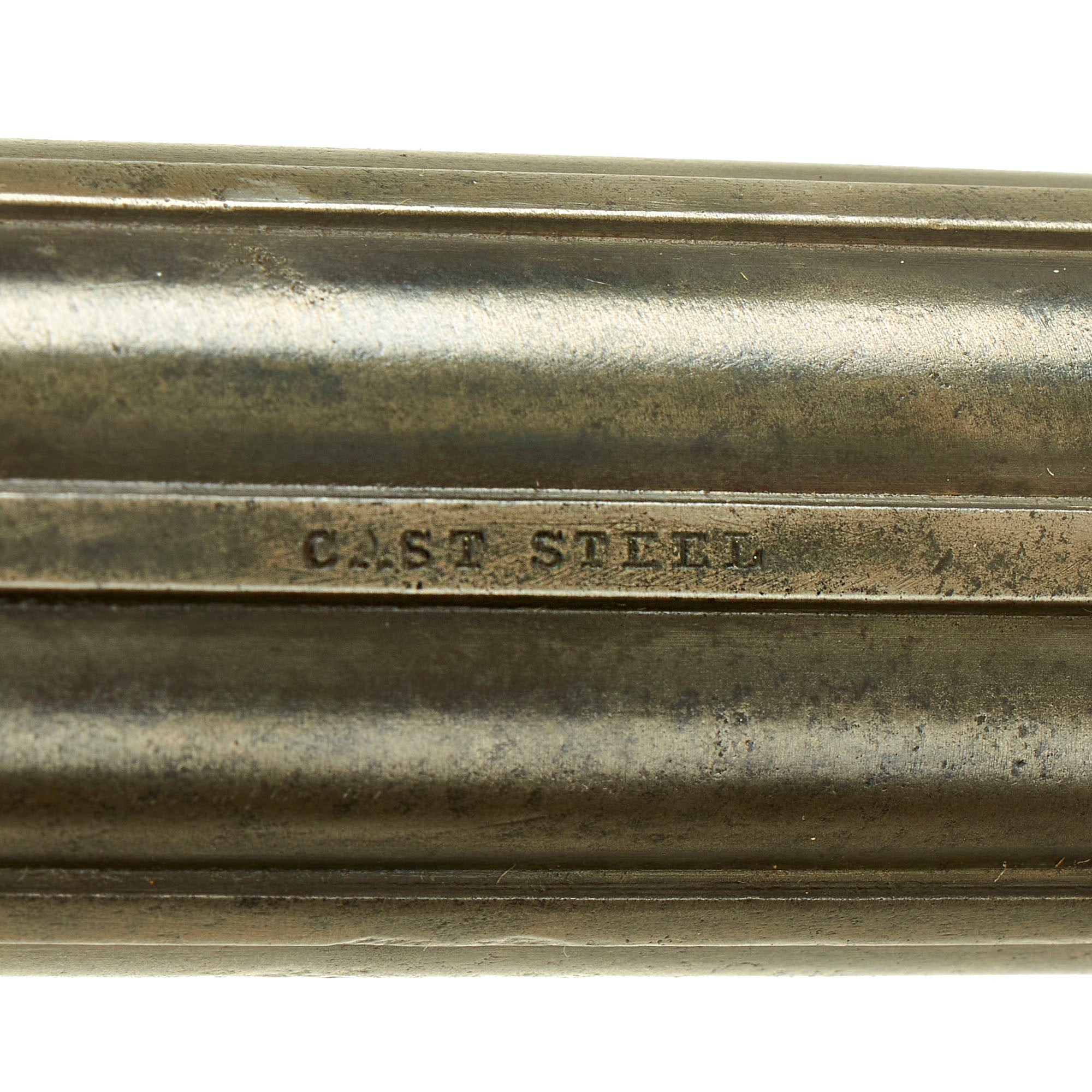 The barrel cluster is marked CAST STEEL on the side, and the maker name is marked on the top of the percussion hammer: