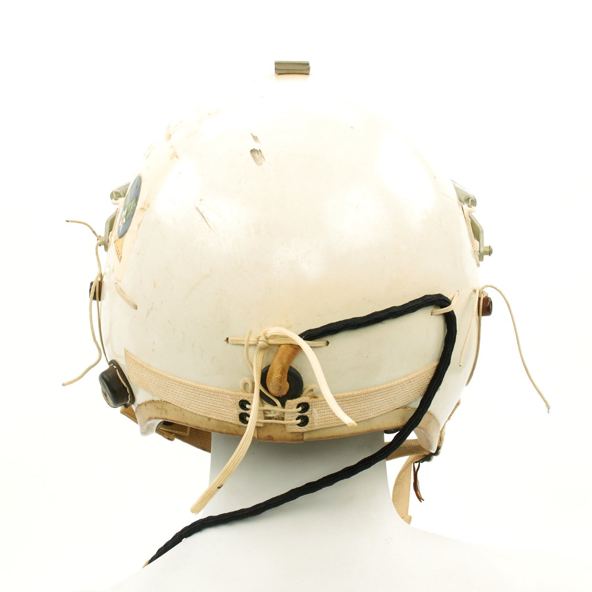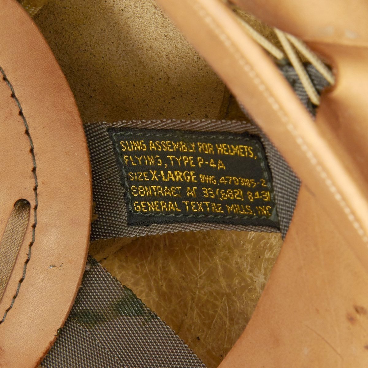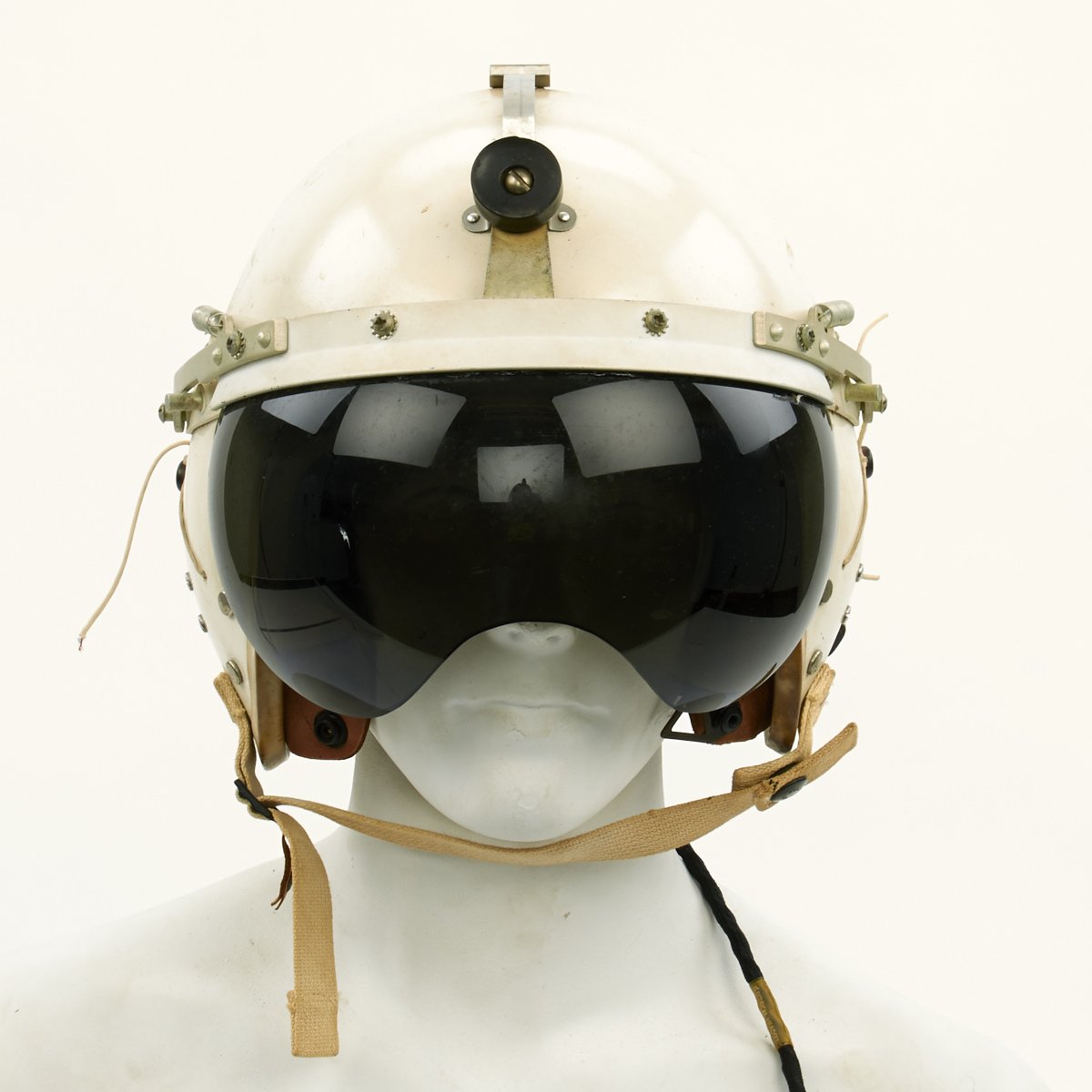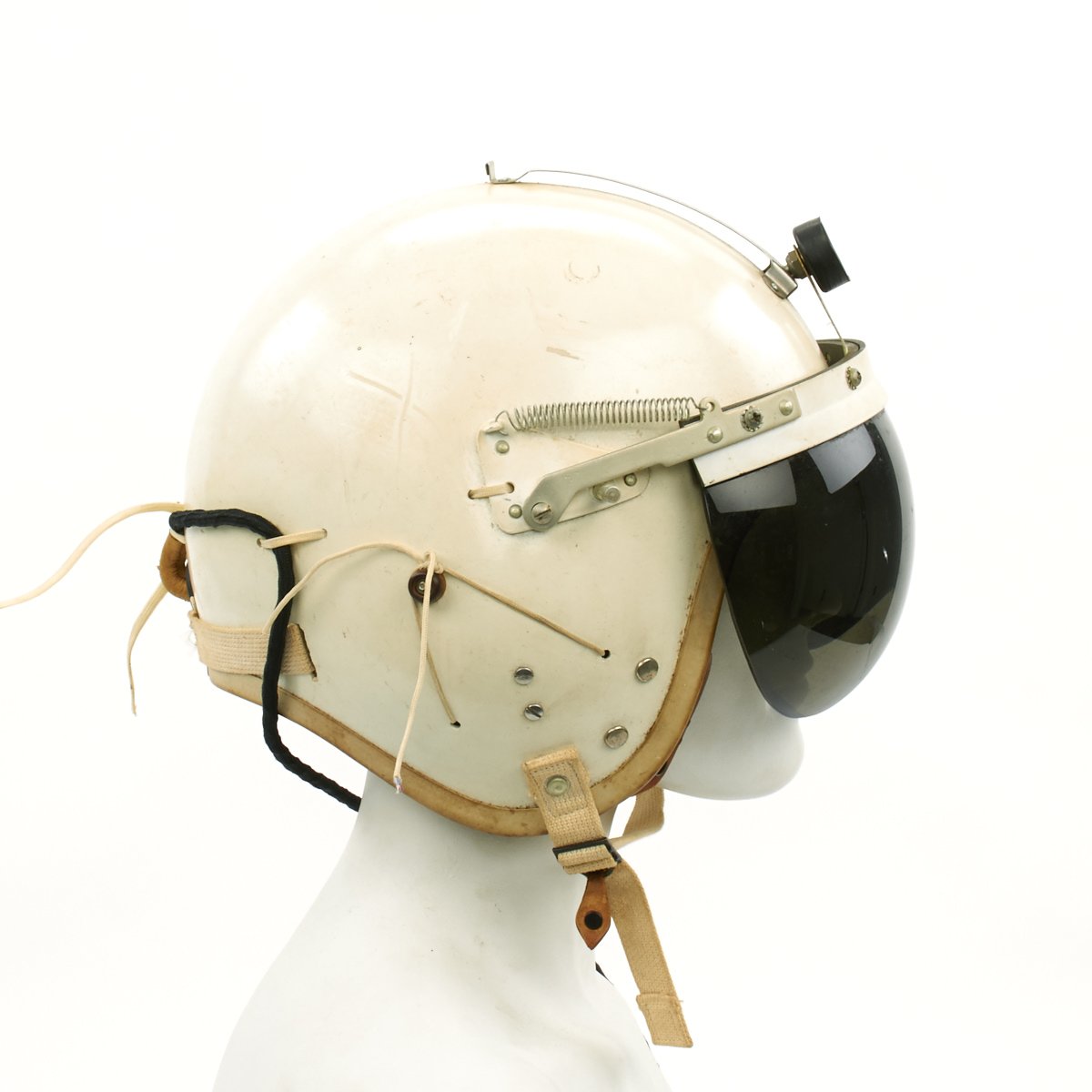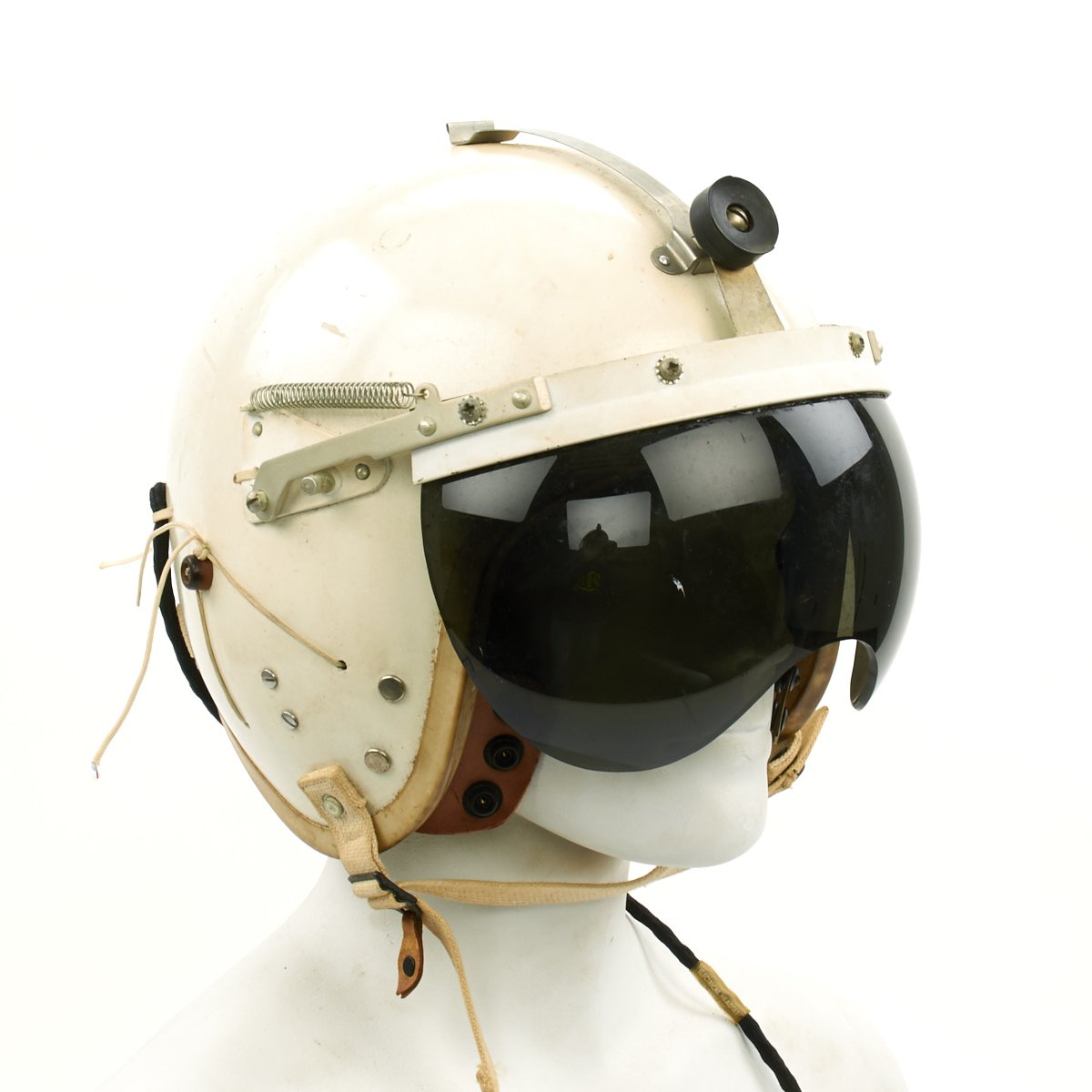 The USAF P-4 flight helmet was standardized in 1955 as a continuation of P-3 with improved avionics in order to make helmet headset communications and oxygen mask dynamic microphone compatible with aircraft intercommunication set AN AIC-10. the new H-75/AIC headset system was added as well as a new earphone cushions spring mounted and tethered to short nylon strings which protruded through the lateral helmet walls to be secured over a rubber over a rubber lock-nut and snubber bar. The P-4 was used with A-13A/MS22001 A-14 oxygen mask. The P-4A standardized in 1957 has a new visor mechanism that replace the side latching design with a tracked visor securing system actuated by grasping a central rubber knob and pulling the visor down into position. The newly assembled P-4A helmets made use of the new fiberglass shell material that replaced the earlier phenolic resin and molded cotton duck material.
