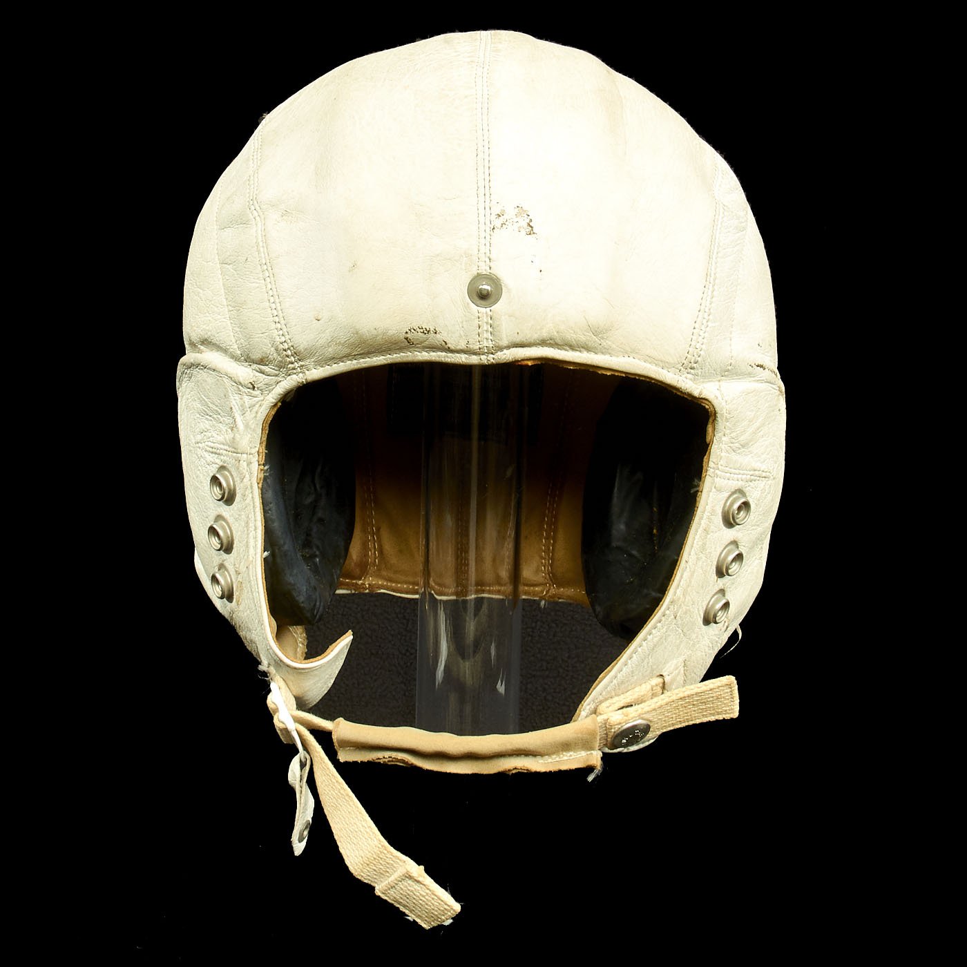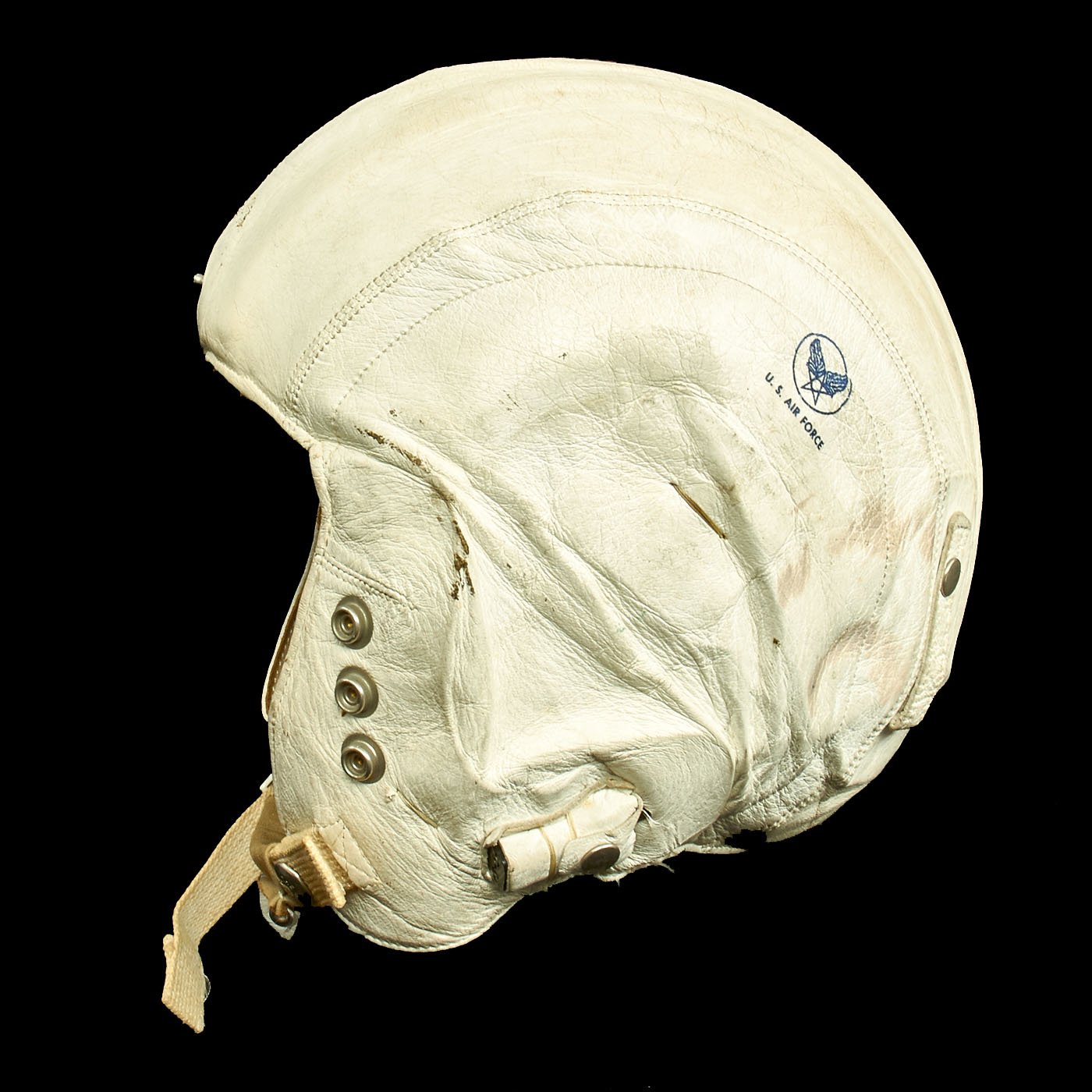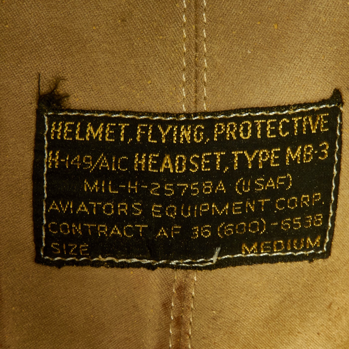 - Original Item: Only One Available. A grim reminder of the Cold War nuclear threat, the MB-3 helmet with H-149/AIC Headset was designed for comfort and protection for the earliest crews flying the B-52 Stratofortress on round-the-clock missions carrying nuclear missiles in the event of a strike ever being necessary. Made from white leather (white was supposed to be reflective in the event of a nuclear blast) with a hard shell that was padded with foam rubber, the helmet could also be fitted with a detachable bill for protection against the sun. This example also features a blue USAF logo. This example appears to have been lightly used but remains in very good displayable condition. It is complete with the H-149/AIC Headset but not the cord. The foam is dry and crumbling slightly, but overall solid. Chin strap is complete and all snaps work. Retains original data label to the interior that reads: Helmet, Flying Protective / H-149/AIC Headset / Type MB-3 / Aviators Equipment Corp. / Size Medium. This is a scarce Cold War helmet that makes a striking display!