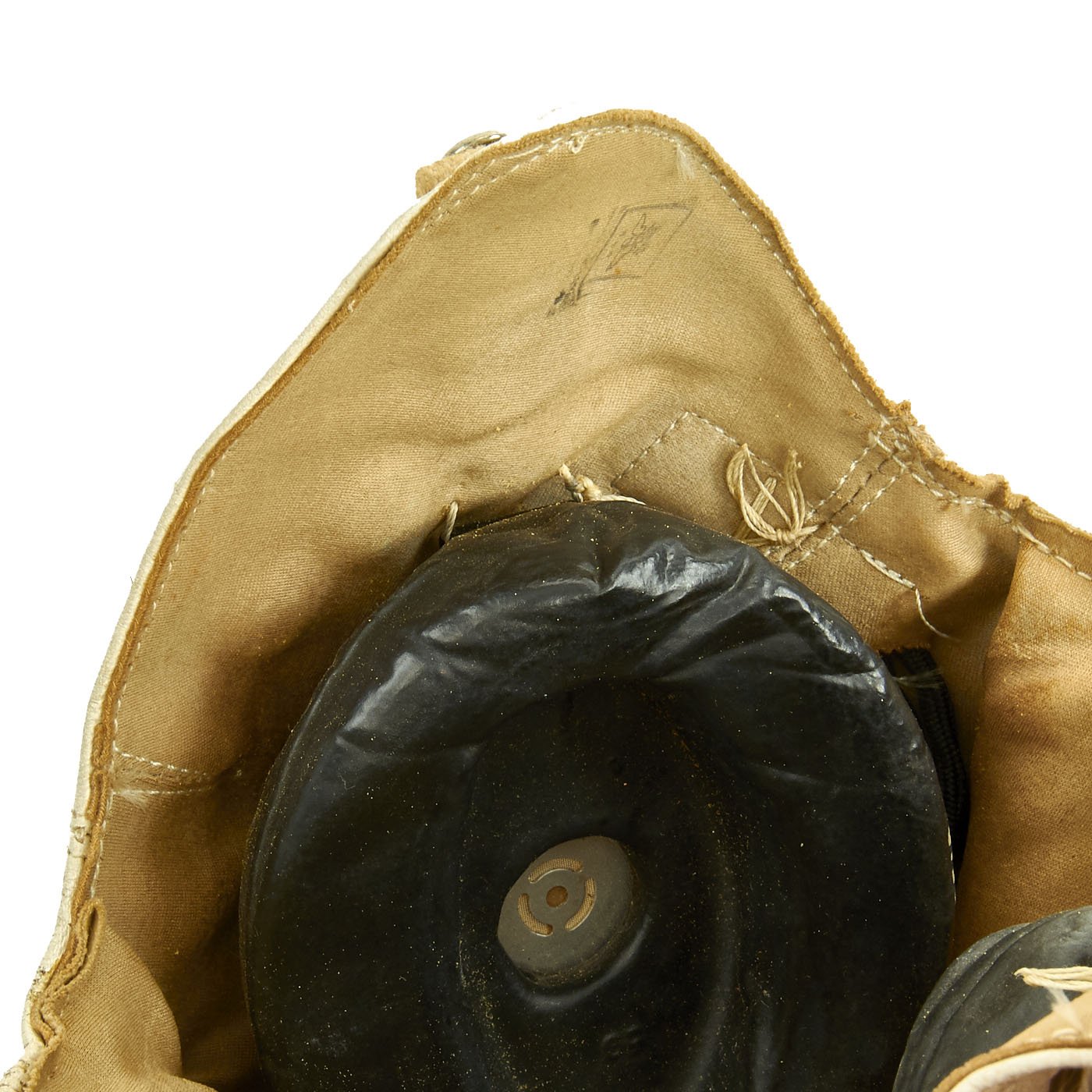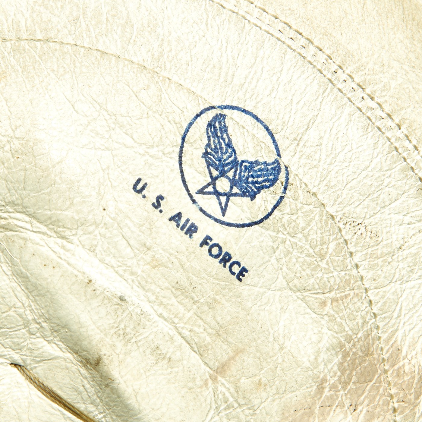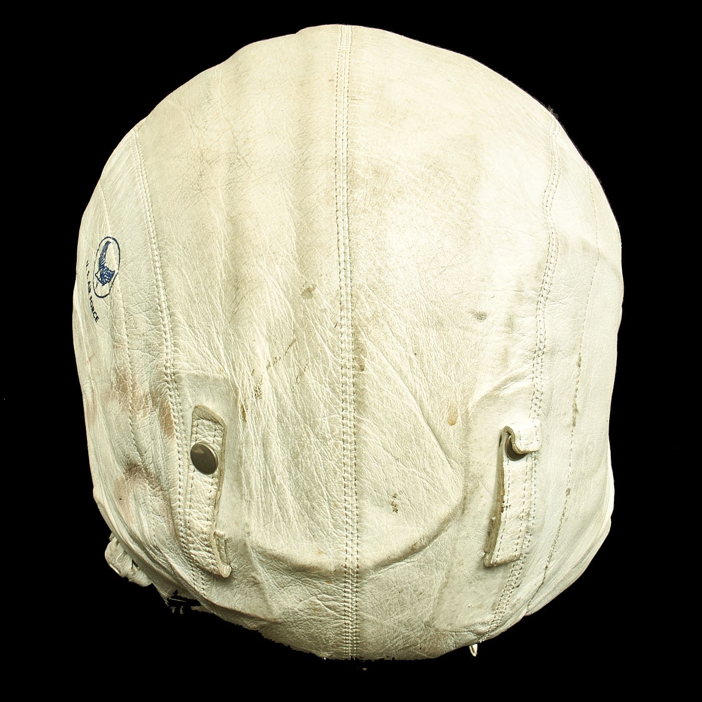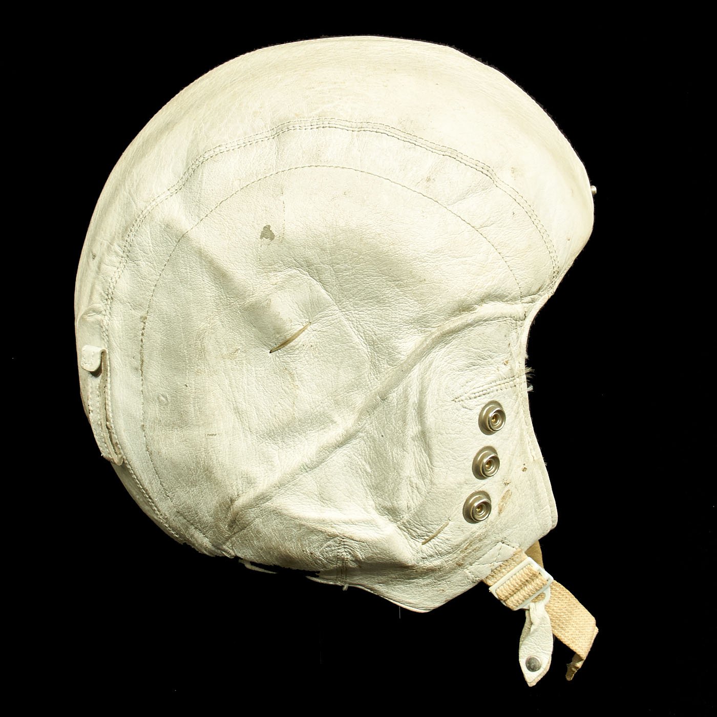 - Original Item: Only One Available. A grim reminder of the Cold War nuclear threat, the MB-3 helmet with H-149/AIC Headset was designed for comfort and protection for the earliest crews flying the B-52 Stratofortress on round-the-clock missions carrying nuclear missiles in the event of a strike ever being necessary. Made from white leather (white was supposed to be reflective in the event of a nuclear blast) with a hard shell that was padded with foam rubber, the helmet could also be fitted with a detachable bill for protection against the sun. This example also features a blue USAF logo. This example appears to have been lightly used but remains in very good displayable condition. It is complete with the H-149/AIC Headset but not the cord. The foam is dry and crumbling slightly, but overall solid. Chin strap is complete and all snaps work. Retains original data label to the interior that reads: Helmet, Flying Protective / H-149/AIC Headset / Type MB-3 / Aviators Equipment Corp. / Size Medium. This is a scarce Cold War helmet that makes a striking display!
