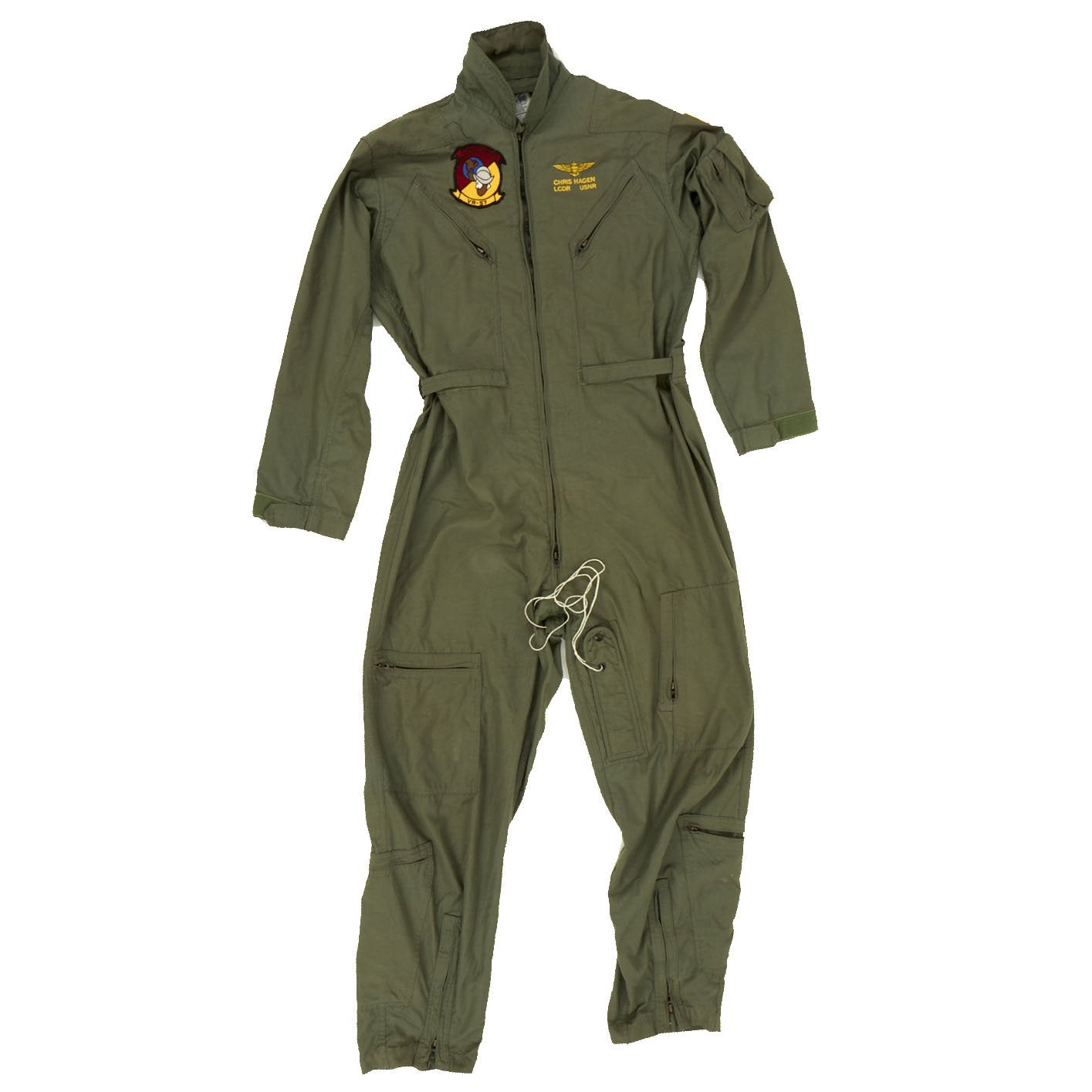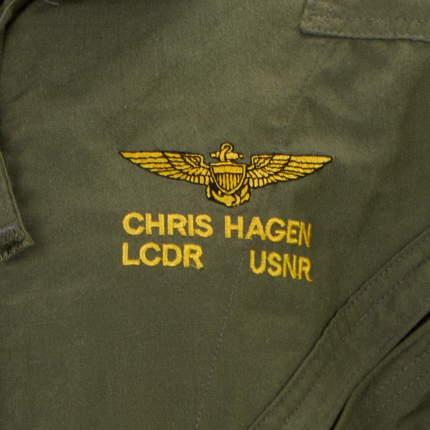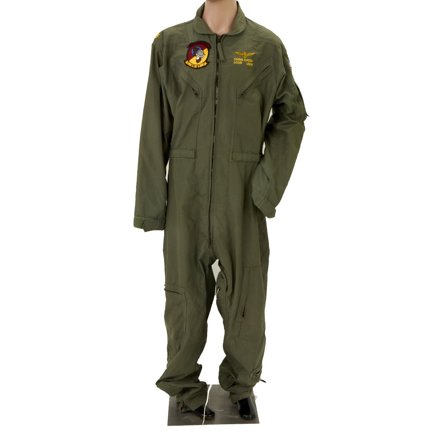 - CWU-27/P Nomex Flight Suit, dated 1999. Has direct embroider Major’s Oakleaves, Navy Pilot Wings, Name “Chris Hagen/LCDR (Lieutenant Commander), USNR (US Navy reserve)” embroidered on the left chest. VR-57 “Conquistadors” pocket patch is sewn on the right breast. Flight Suit is marked size 46L