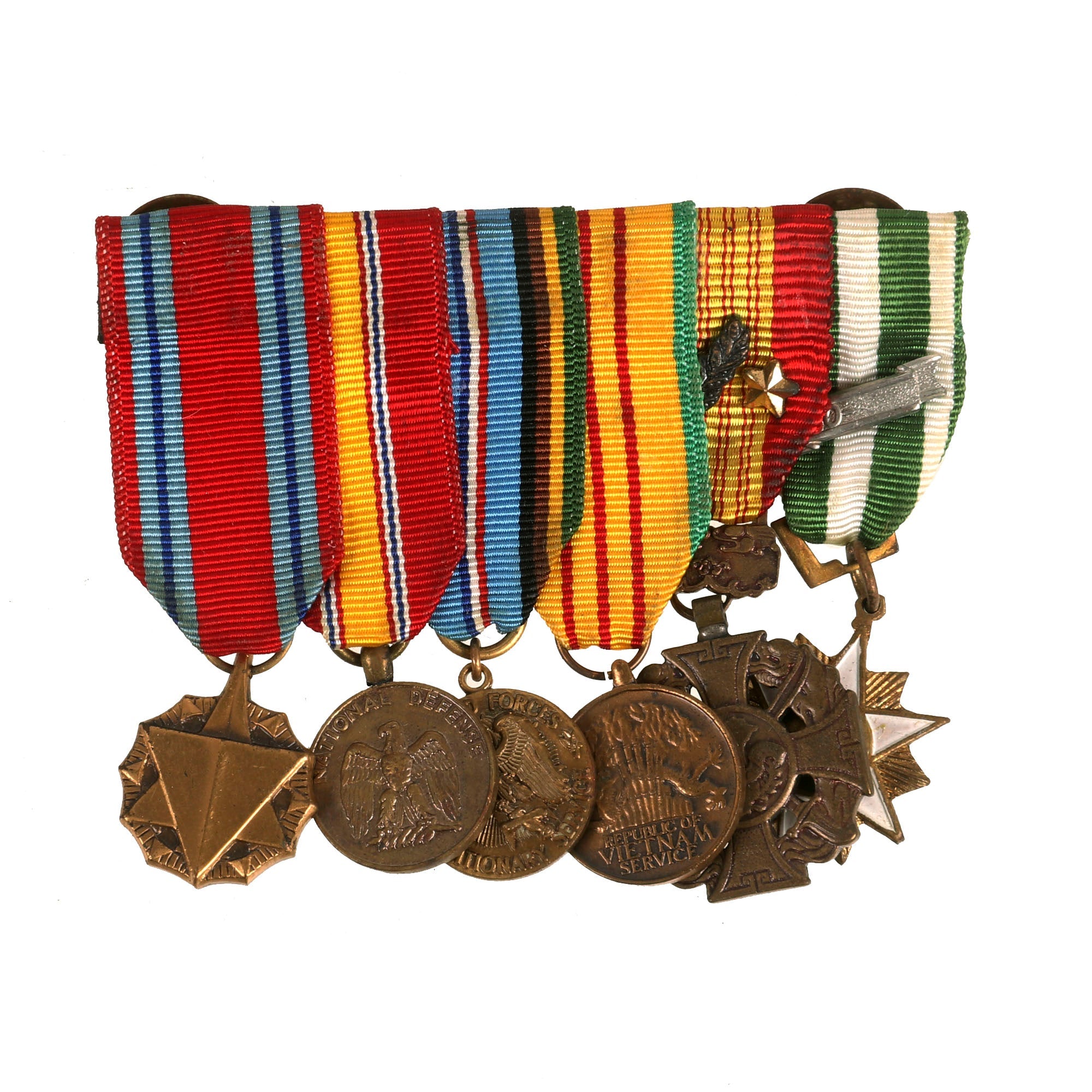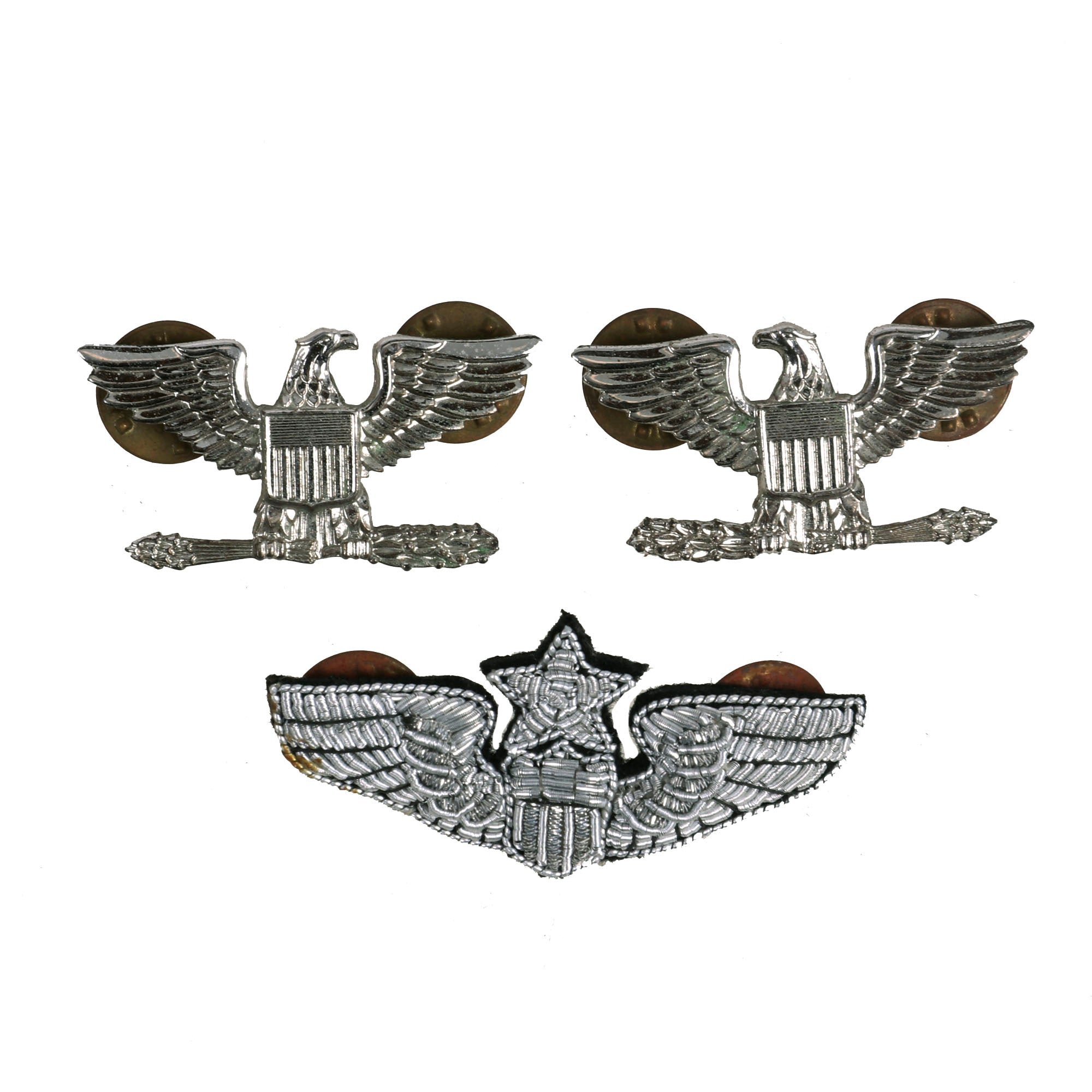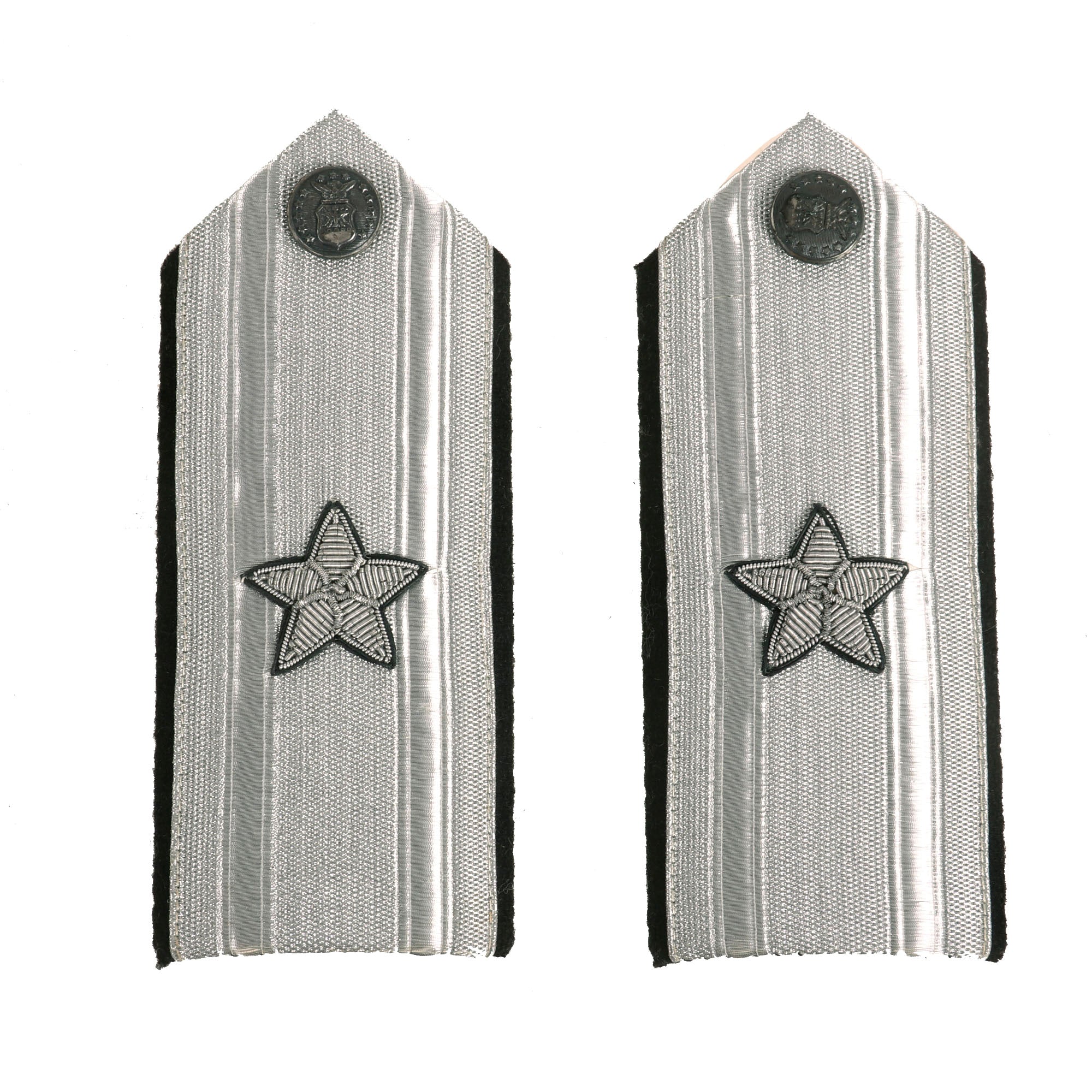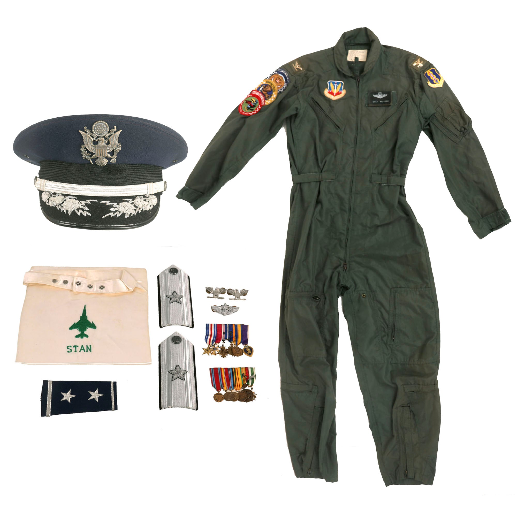The insignia consists of (2) Brigadier General shoulder boards, personalized “Stan” embroidered ascot, (1) Major General shoulder board (sleeve), name tag and (2) mini medal bars featuring a Silver Star, Legion of Merit, DFC, Air Medal and Purple Heart.
