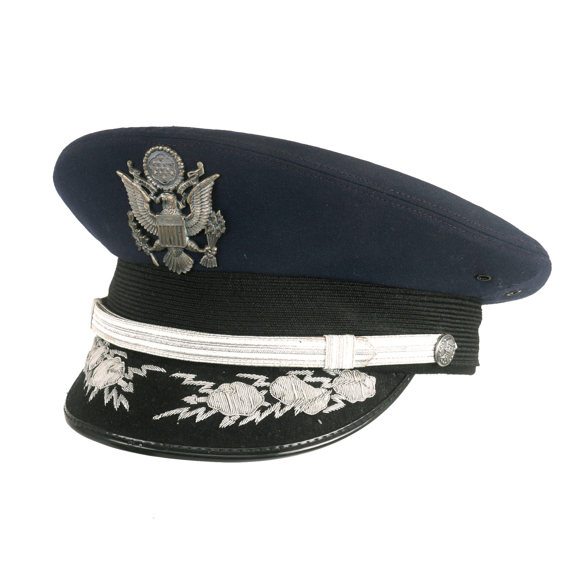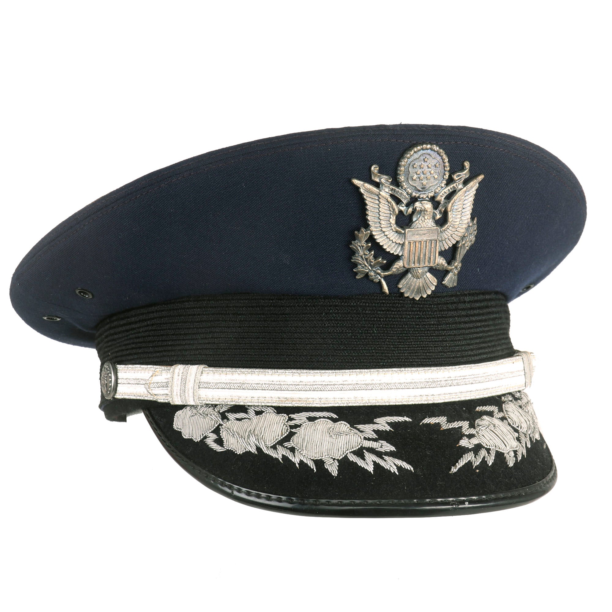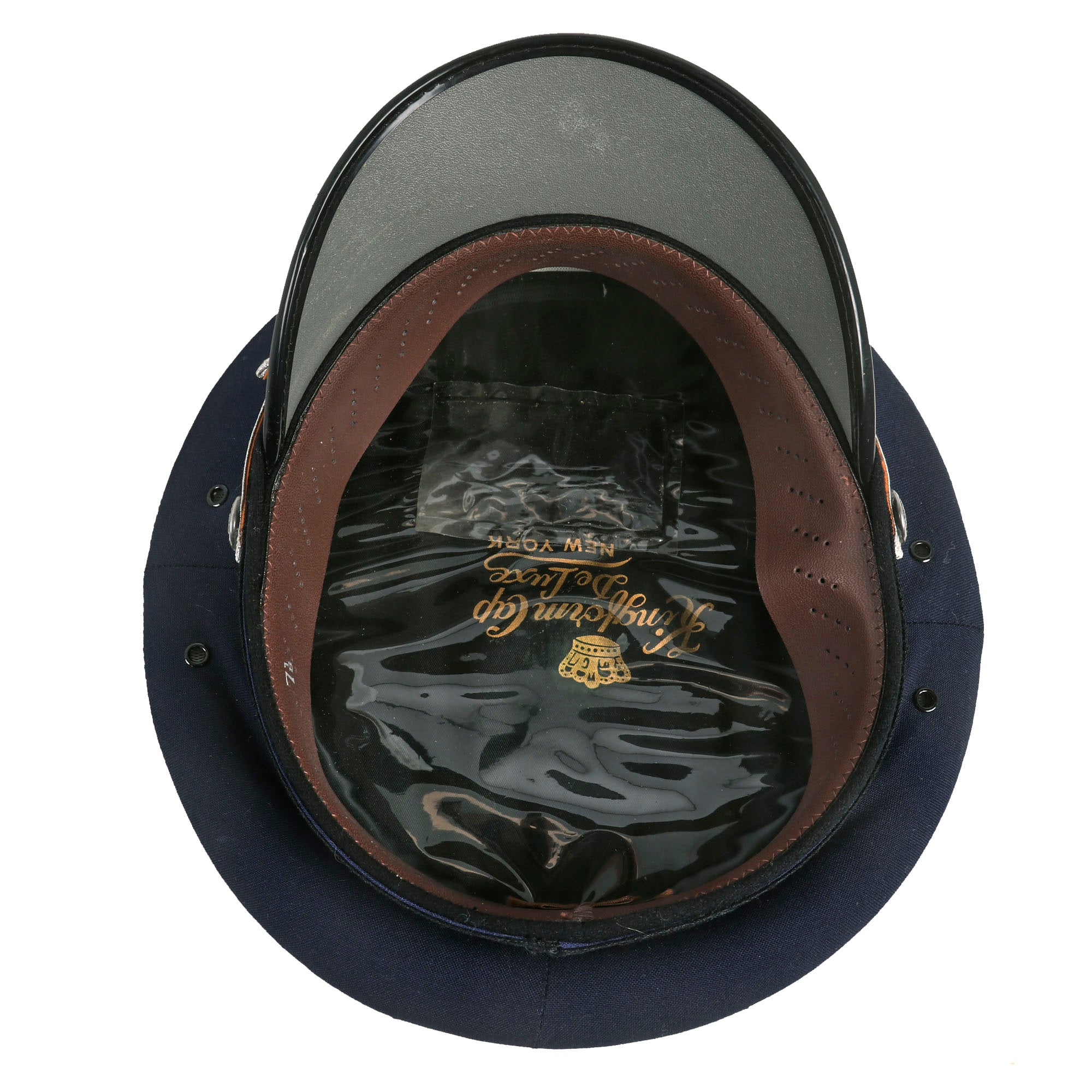 - Peaked Visor: Offered in a size 7 ⅛ and manufactured by Kingform Cap Deluxe of New York. Shows no signs of real wear and is not named to the General.