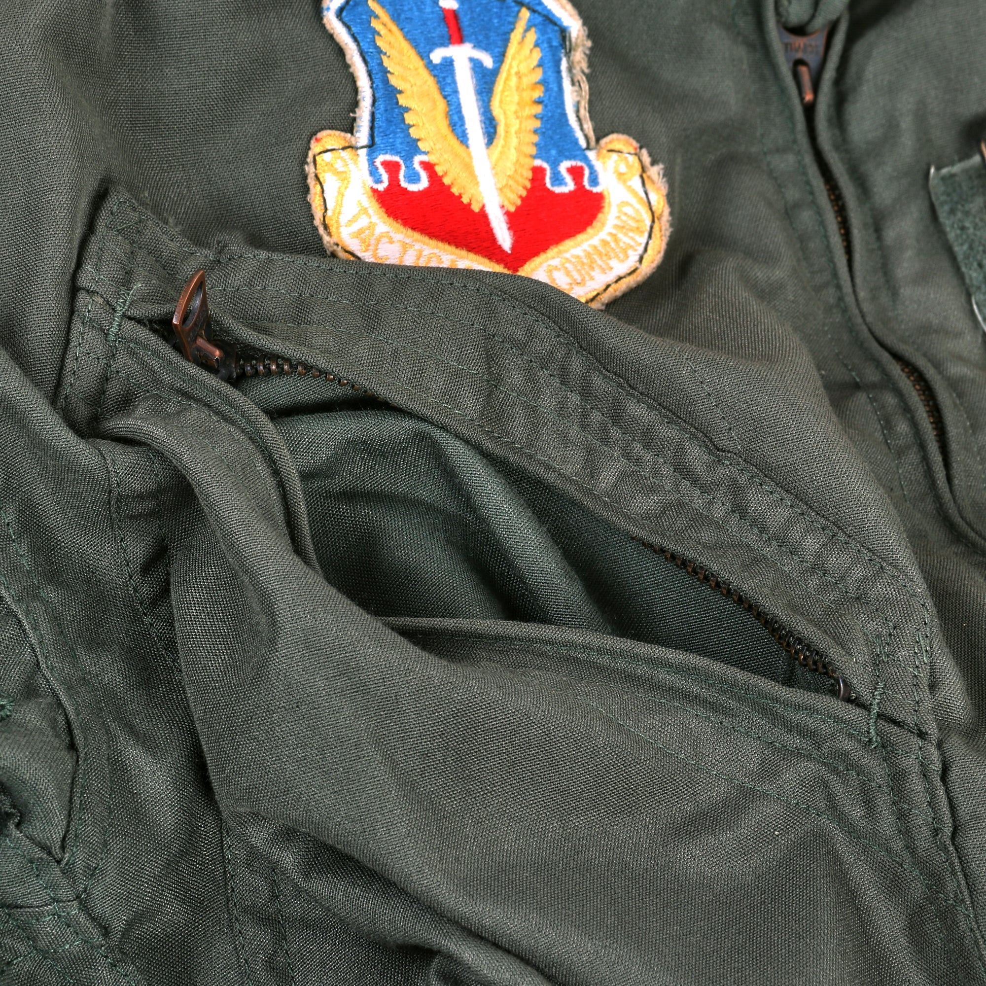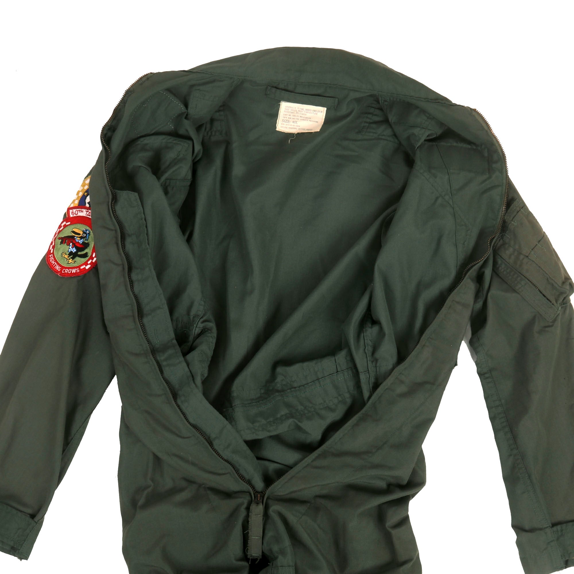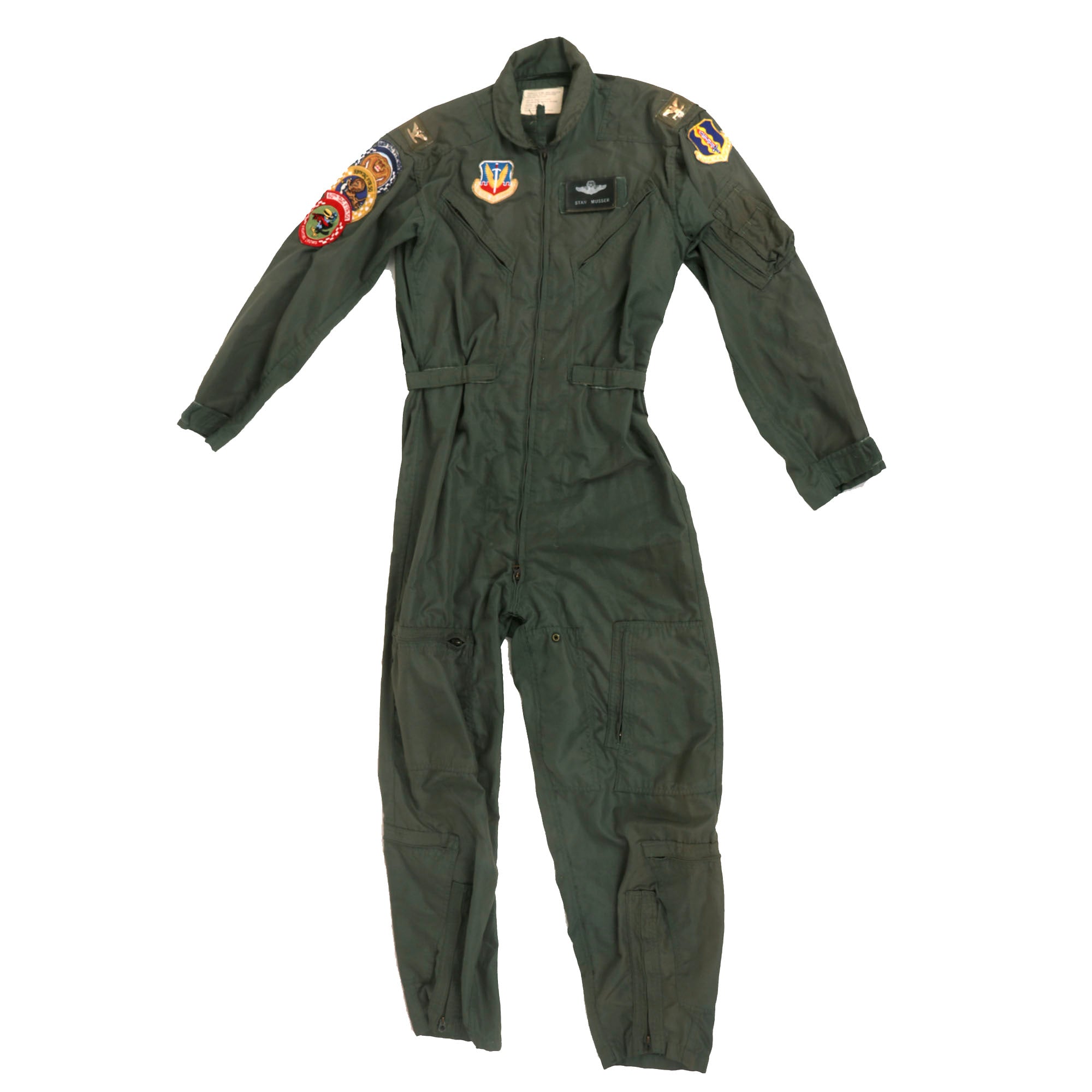 The flight suit is in great condition with solid evidence of being worn, but not abused. All original components appear to still be present and in functional order. The patches and insignia are all still firmly attached in place.
