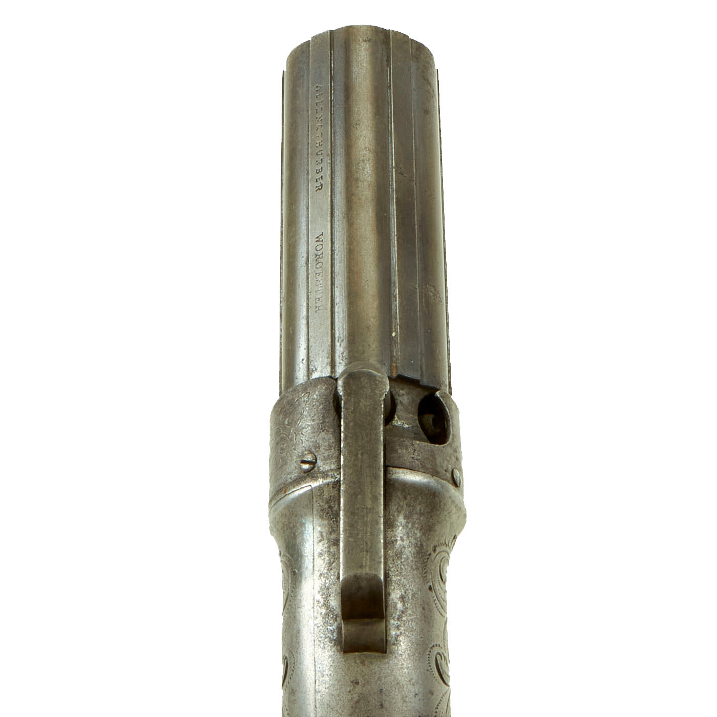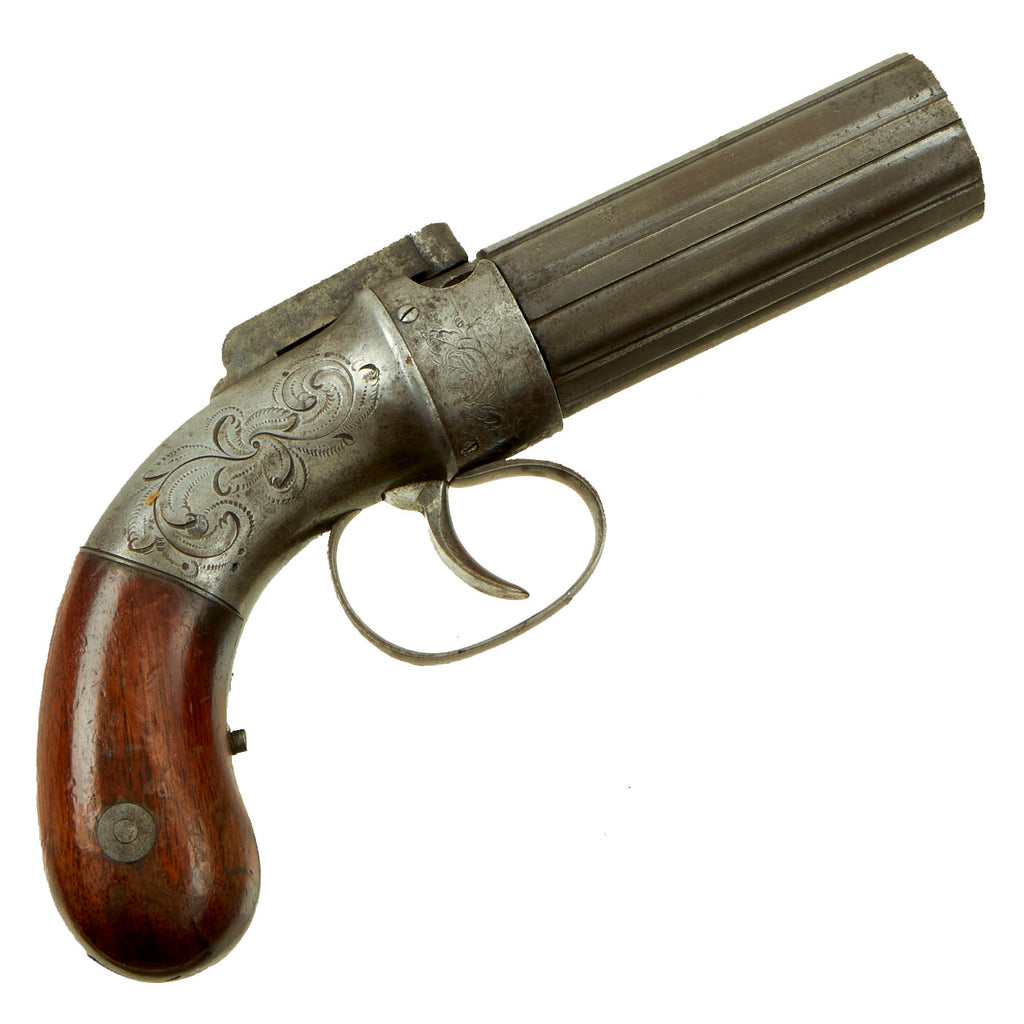 Original Item: Only One Available. Pepperbox revolvers were so named because of the similarity of the front view of the weapon was so reminiscent of a Pepper Pot of the time being a circle of round holes. This example was made by Ethan Allen of Massachusetts (1808-1871). Allen developed his Gun business by taking his brother-in-law Charles Thurber as his partner, and they moved the plant to Worcester, Mass. Ethan Allen, no relation to the Revolutionary Ethan Allen, applied for various patents, most notably early on for a "TUBE HAMMER" ignition system in 1837, which was renewed in 1845.